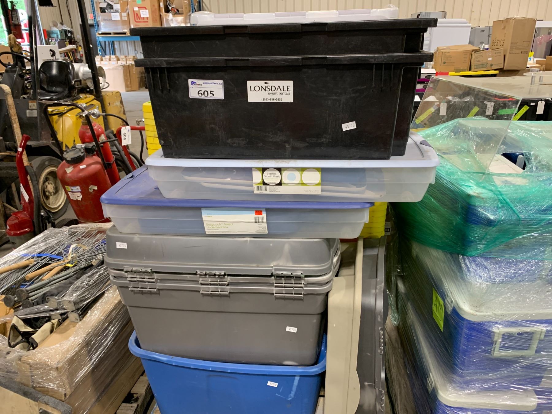 PALLET OF ASSORTED BLACK/GREY/BLUE PLASTIC BINS WITH LIDS