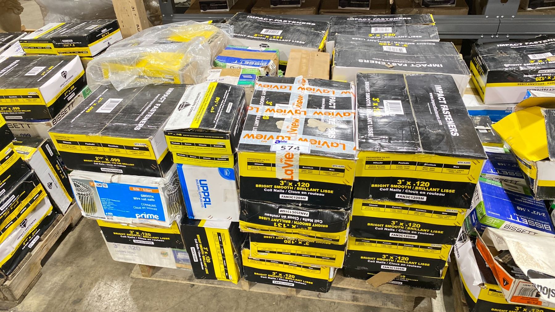 PALLET OF ASSORTED BOXES OF INDUSTRIAL COIL NAILS & ASSORTED DRIVE SCREWS