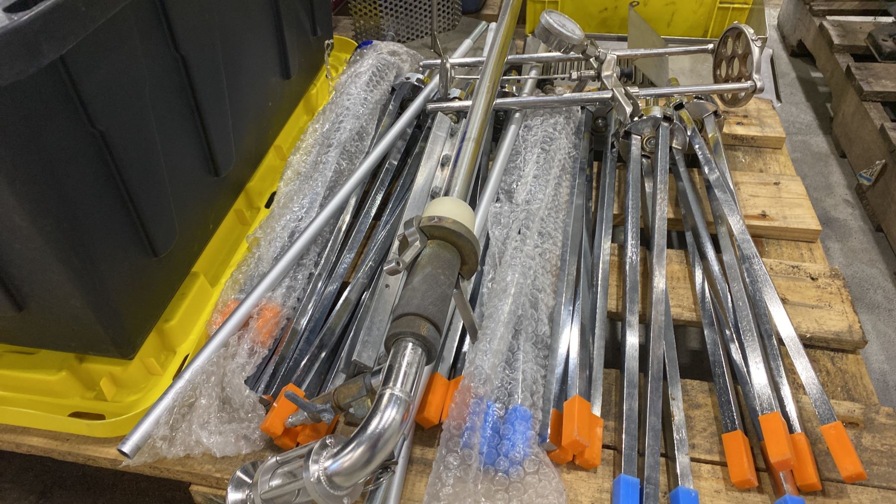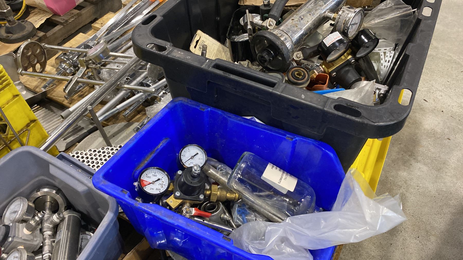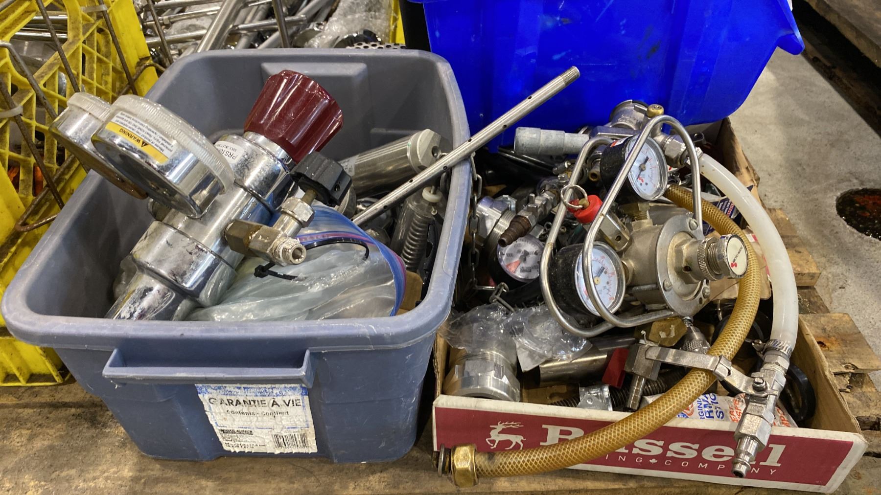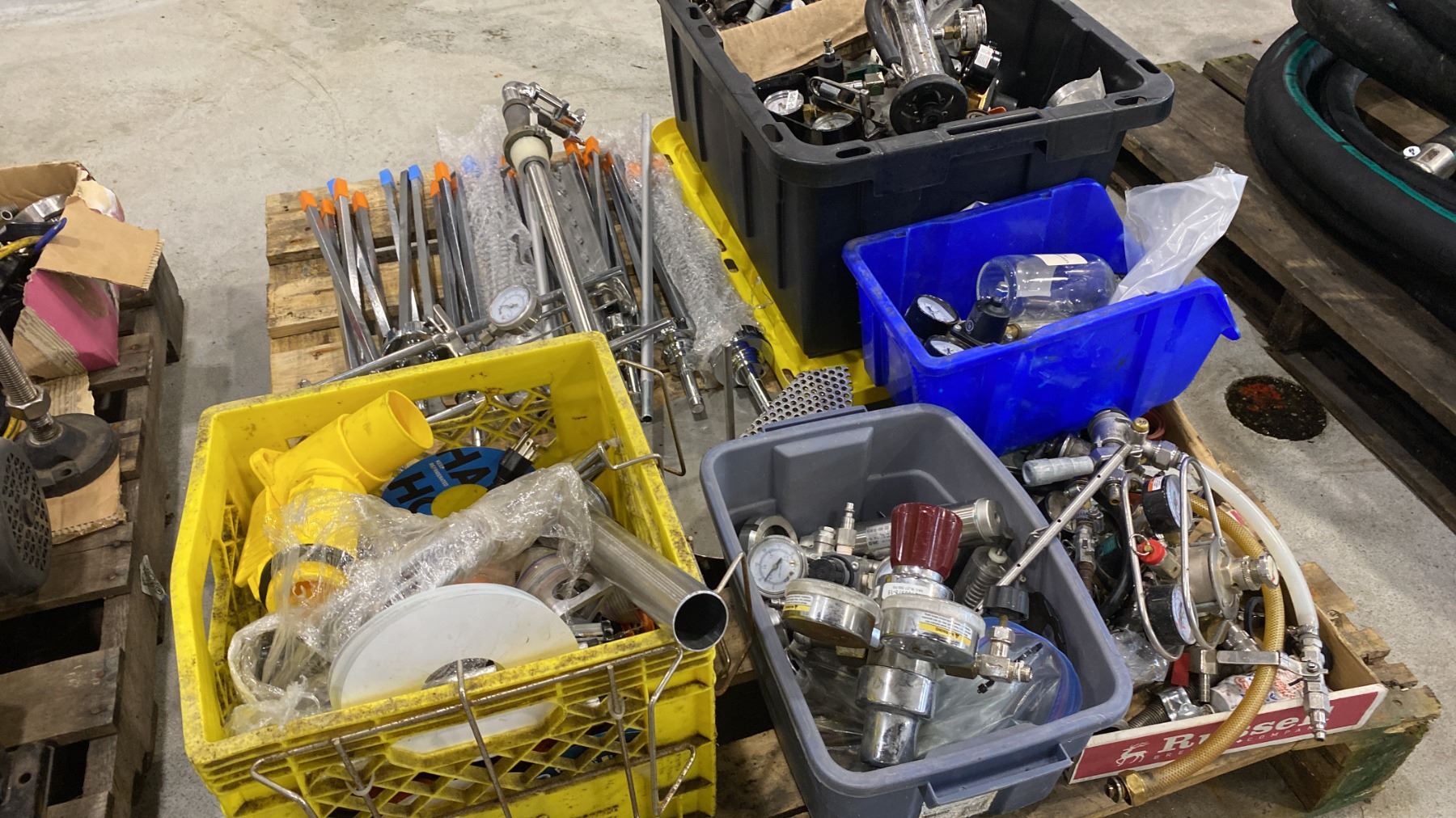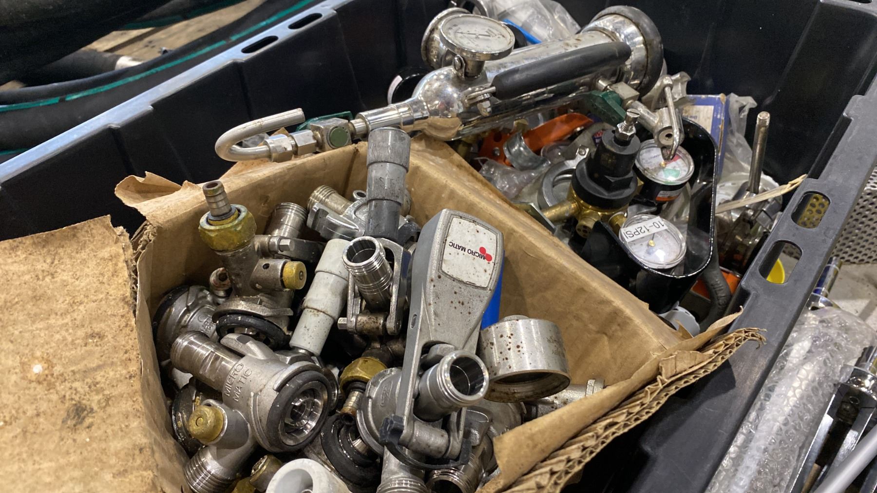 PALLET OF ASSORTED BREW EQUIPMENT INCL GAUGES, CLAMPS, STANDS, ATTACHMENTS AND MORE