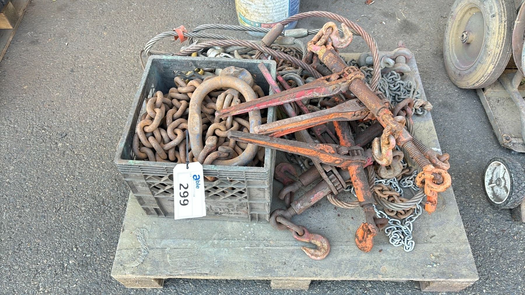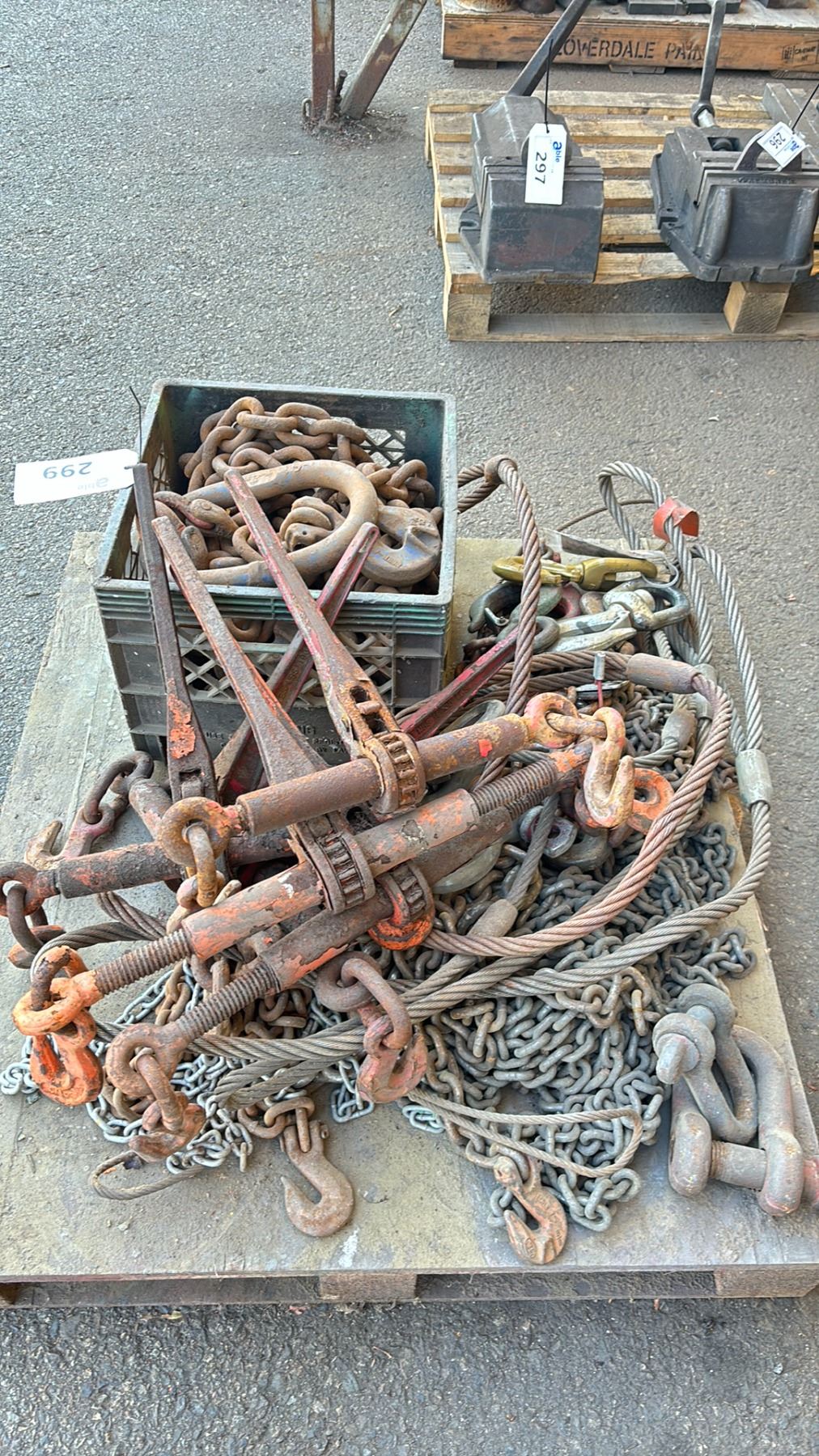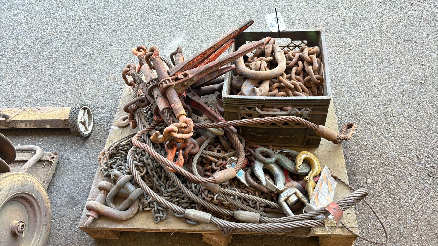 PALLET OF ASSORTED CINCHES, CHAIN, BRAIDED CABLE LIFT LINES AND LIFT HOOKS
