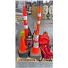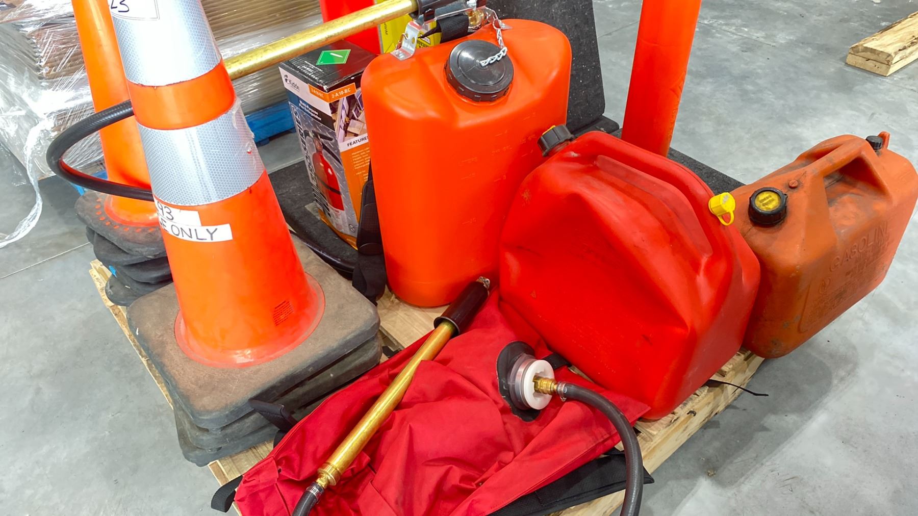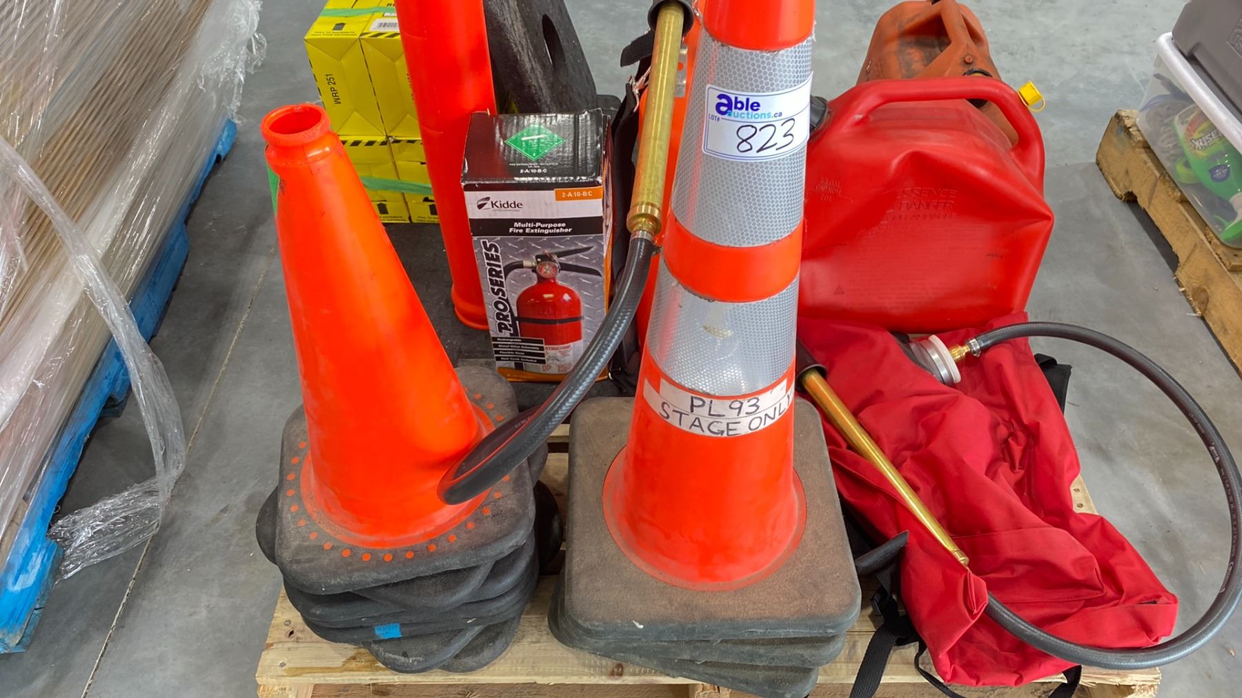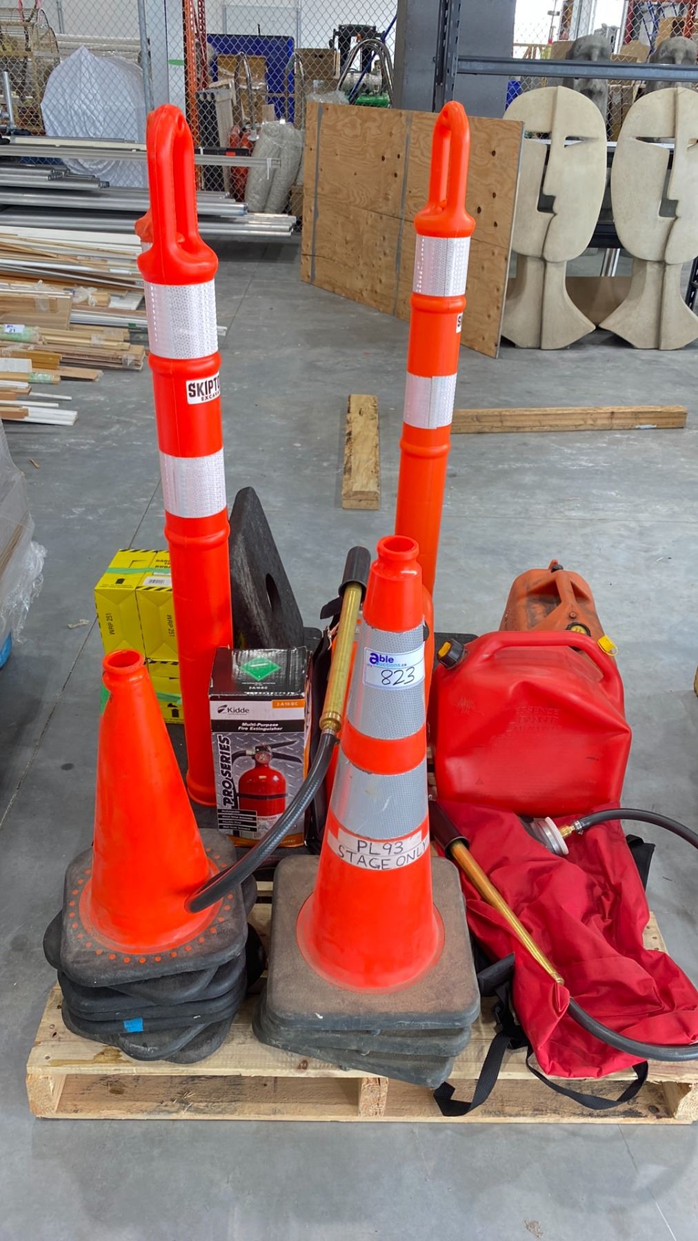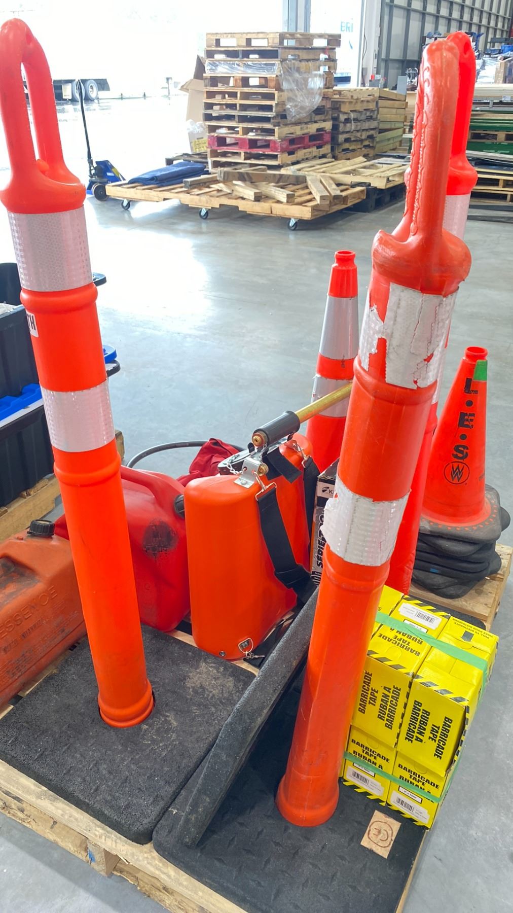 PALLET OF ASSORTED CONES, BACKPACK SPRAYER, FUEL CANS & MORE