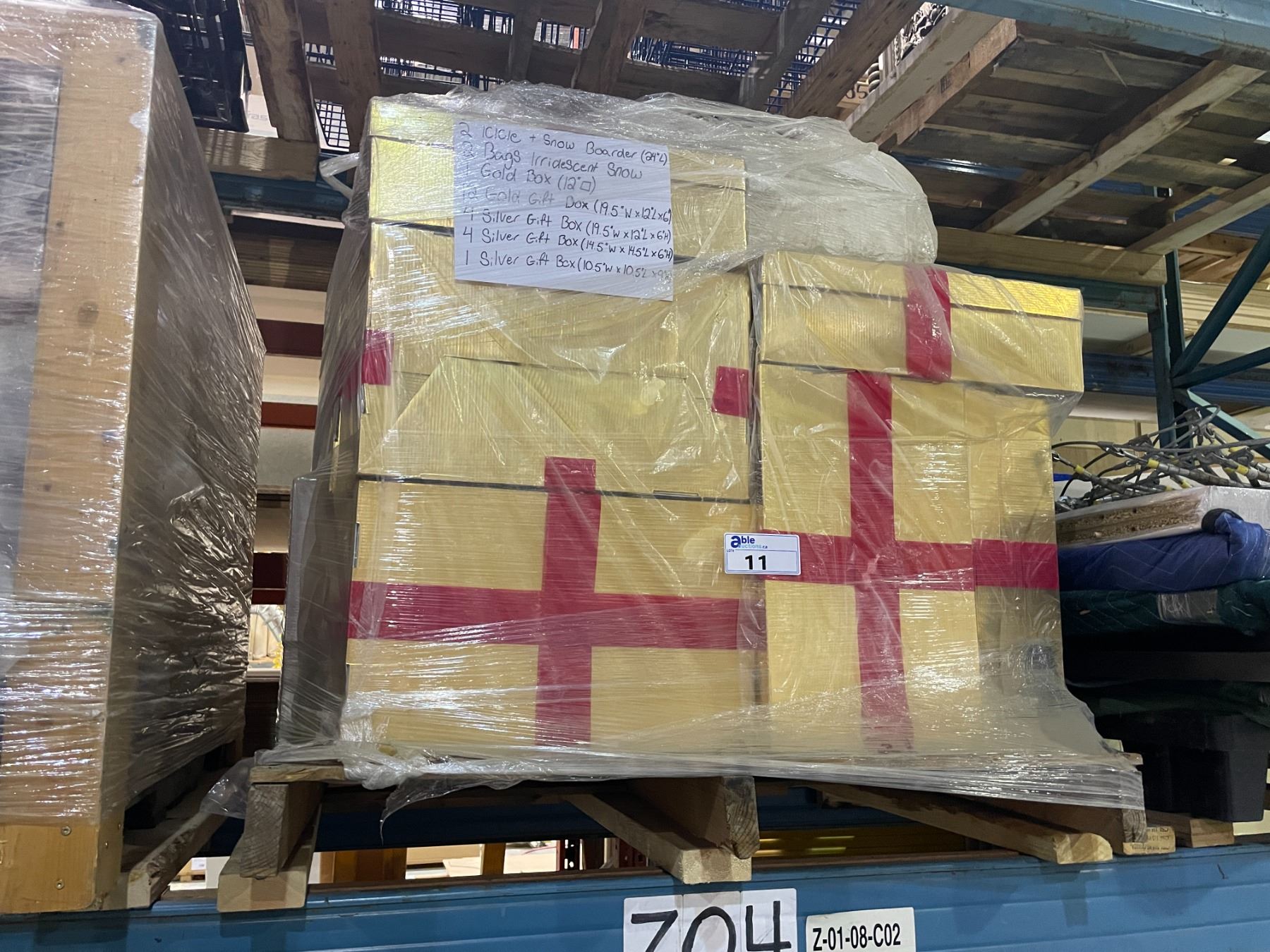 PALLET OF ASSORTED DECORATIVE GIFT BOXES, BAGS, & FAUX SNOW
