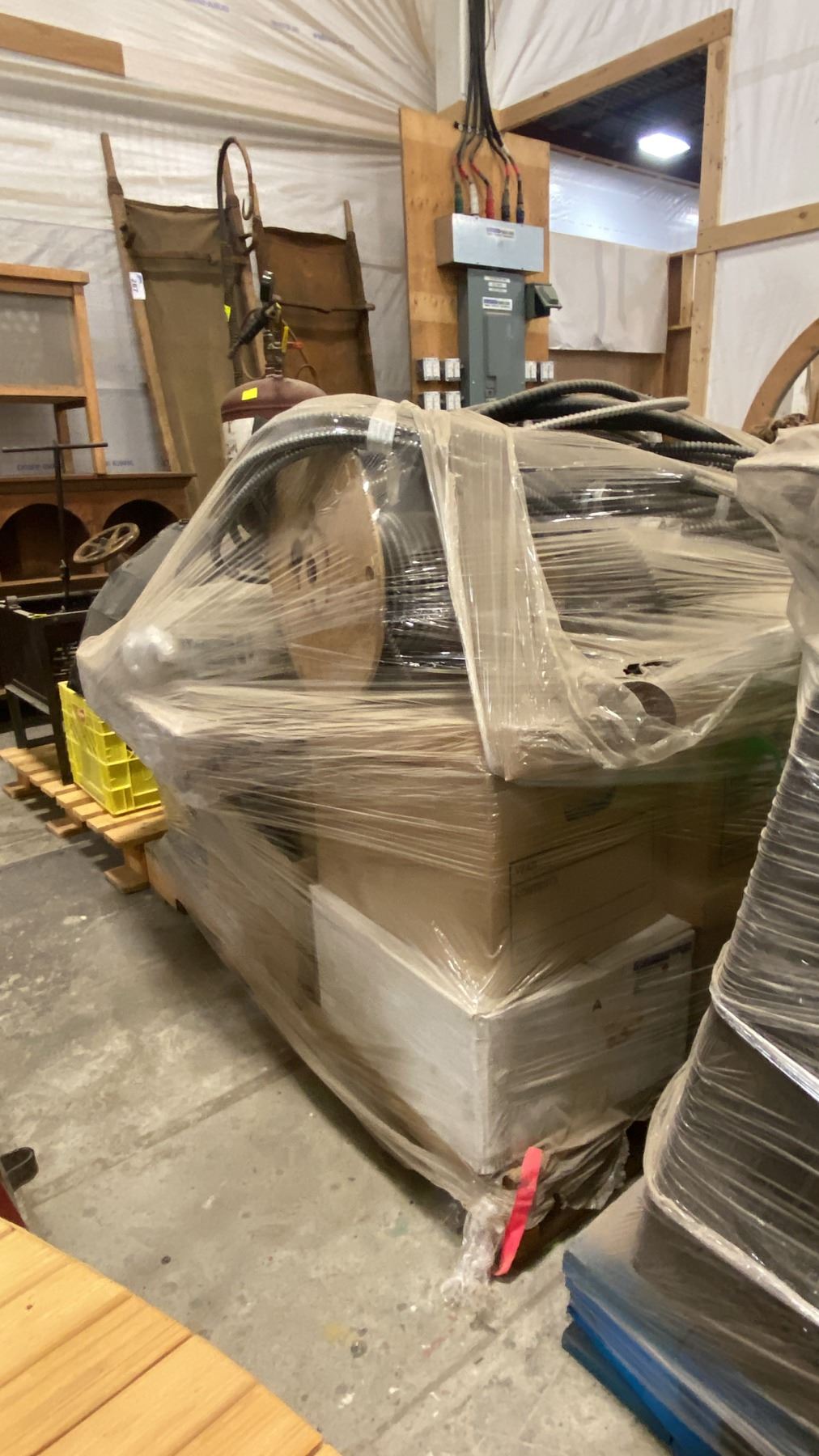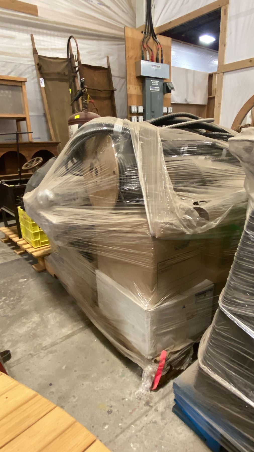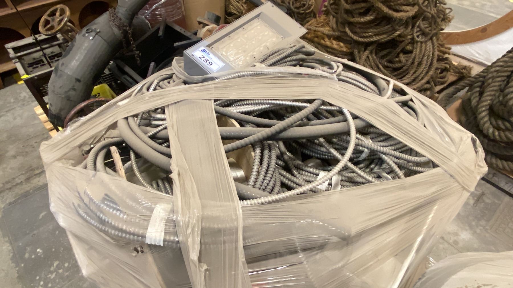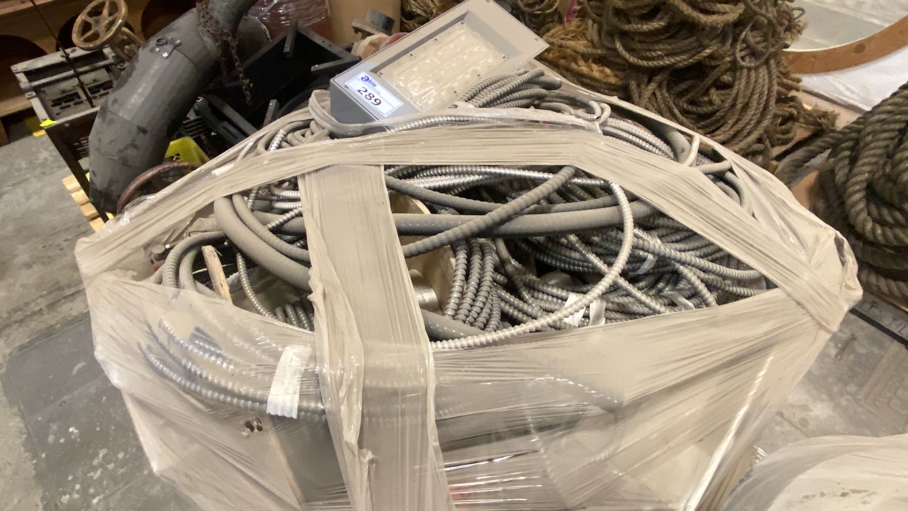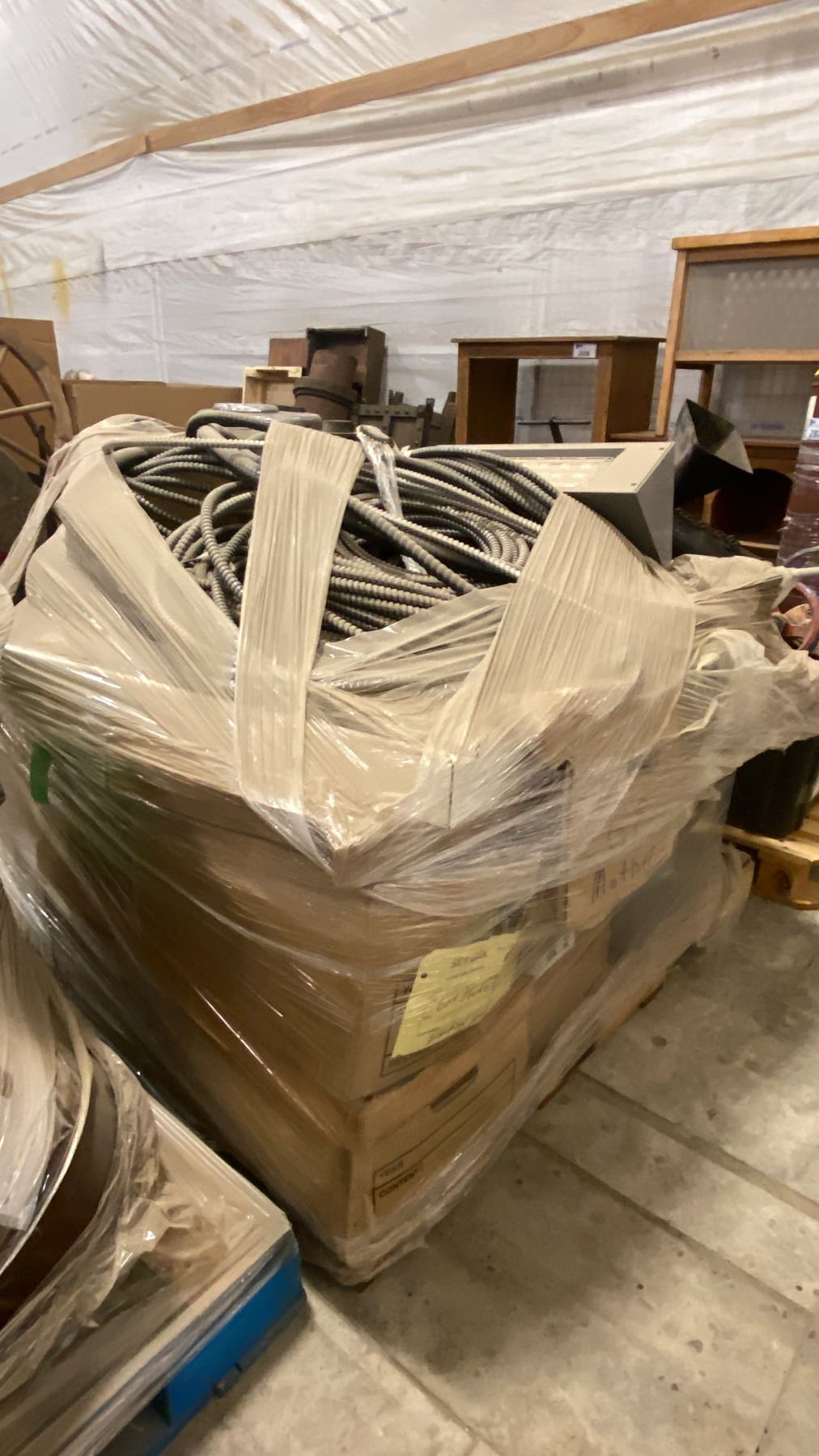 PALLET OF ASSORTED ELECTRICAL CABLES, LIGHTS, BREAKER BOXES & MORE