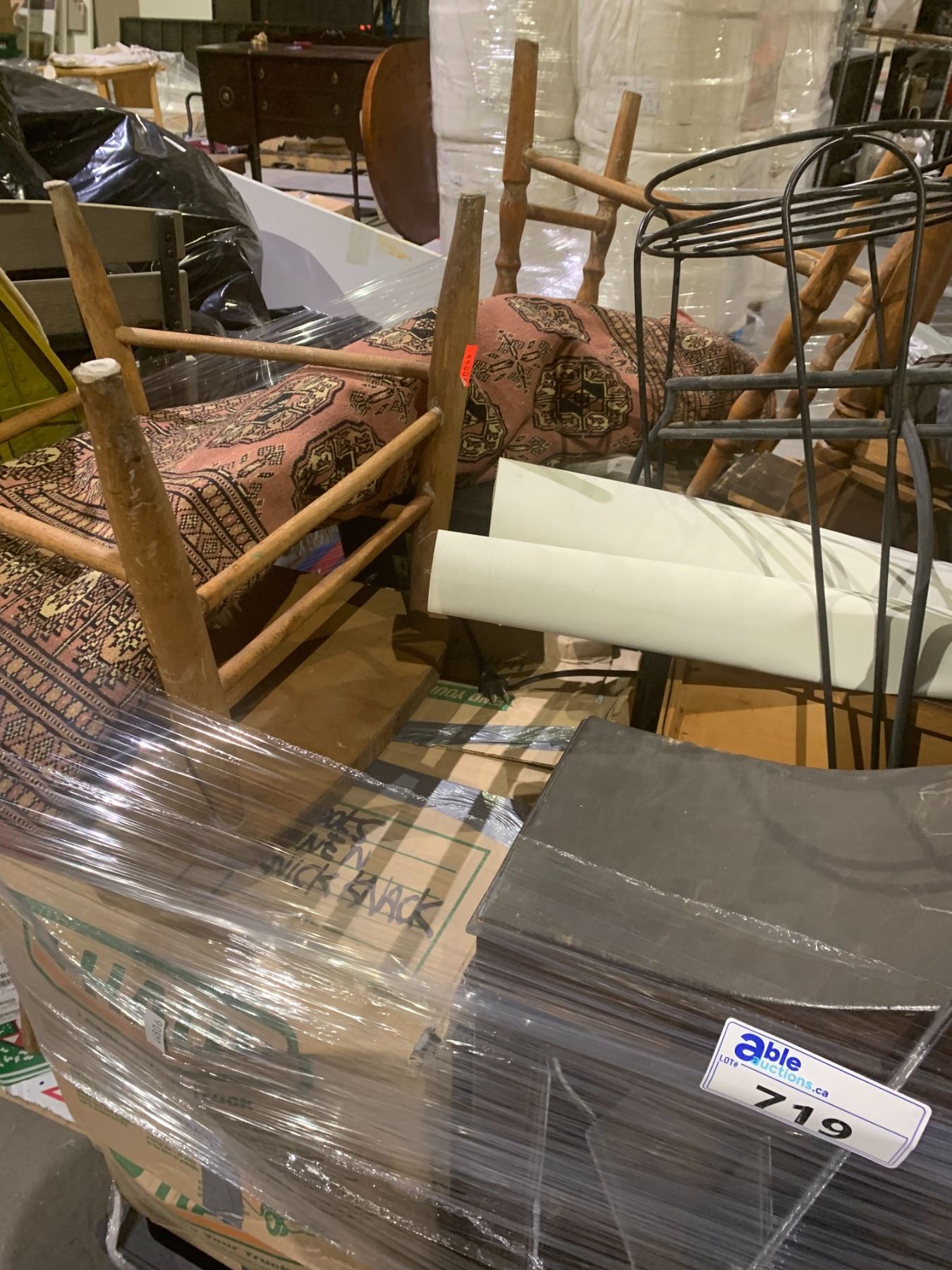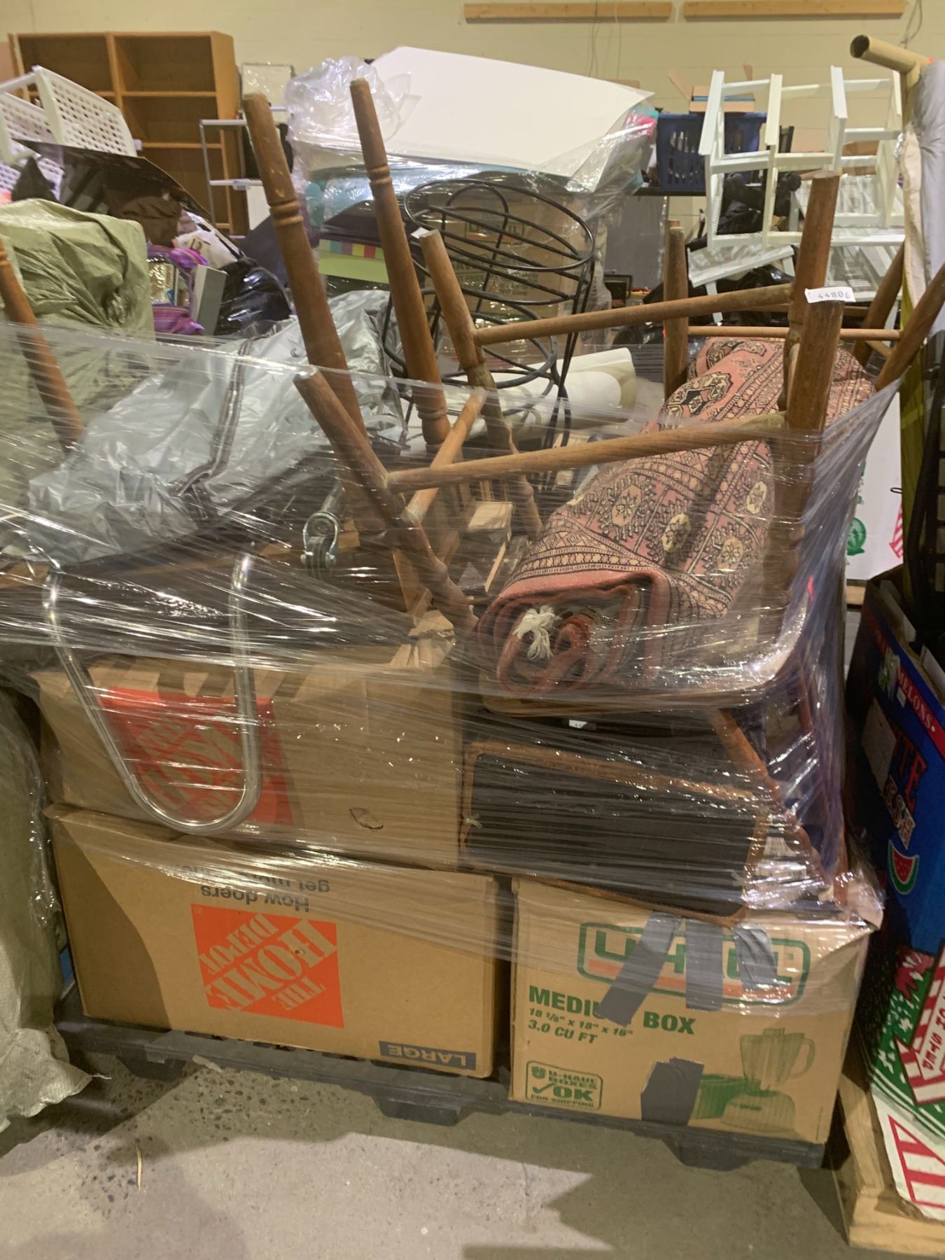 PALLET OF ASSORTED ESTATE ITEMS INCLUDING; STOOL, BENCH, AREA RUG & MORE