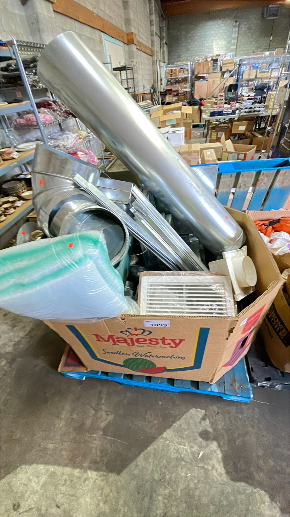 PALLET OF ASSORTED FURNACE ITEMS INCLUDING; PIPES, VENT COVERS, INSULATION, HOSE COUPLINGS & MORE