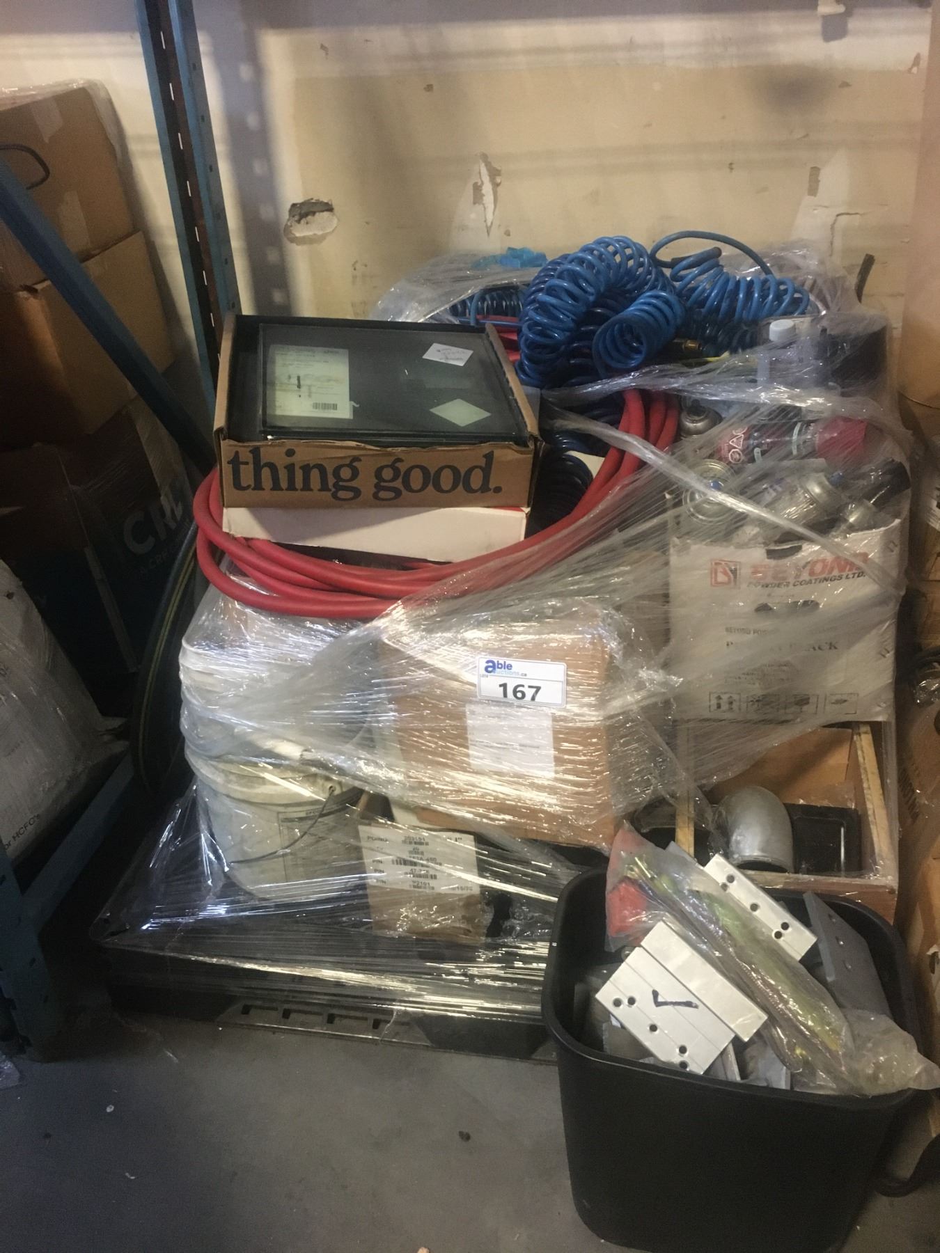 PALLET OF ASSORTED ITEMS-AIR LINE HOSE, SPRAY PAINT, ALUMINIUM DOOR/WINDOW HARDWARE, ETC