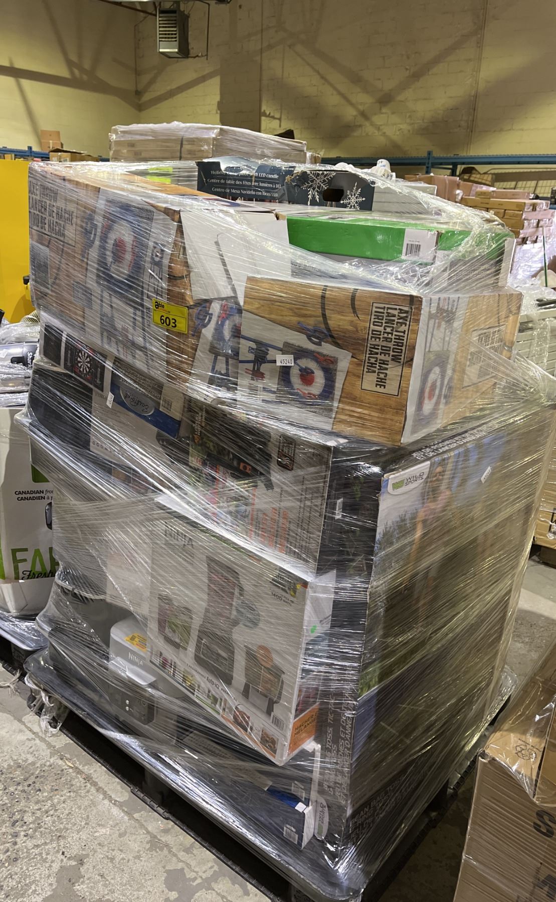 PALLET OF ASSORTED ITEMS INCLUDING; AXE THROWING GAME, NINJA BLENDER, LADDER BALL, LITTLE HOTTIE DRYER AND MORE