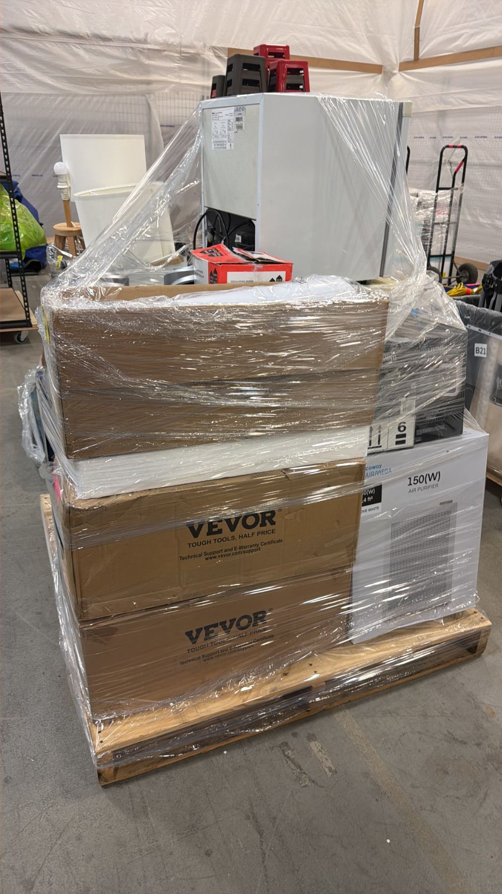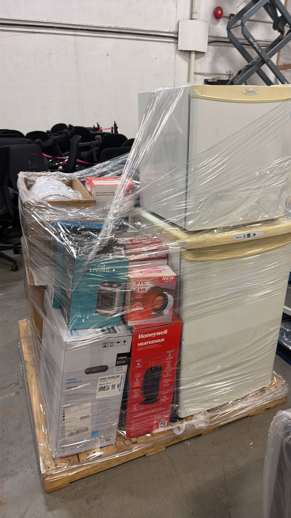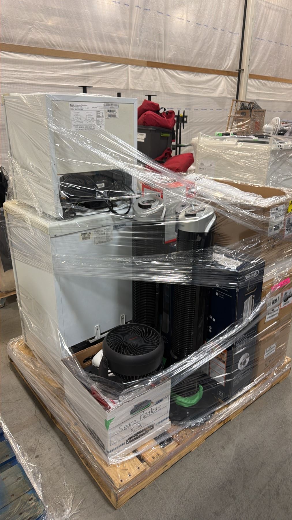 PALLET OF ASSORTED ITEMS INCLUDING; BAR FRIDGES, TOWER FANS, DESK FANS & MORE