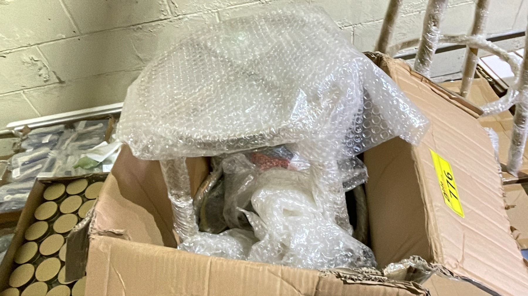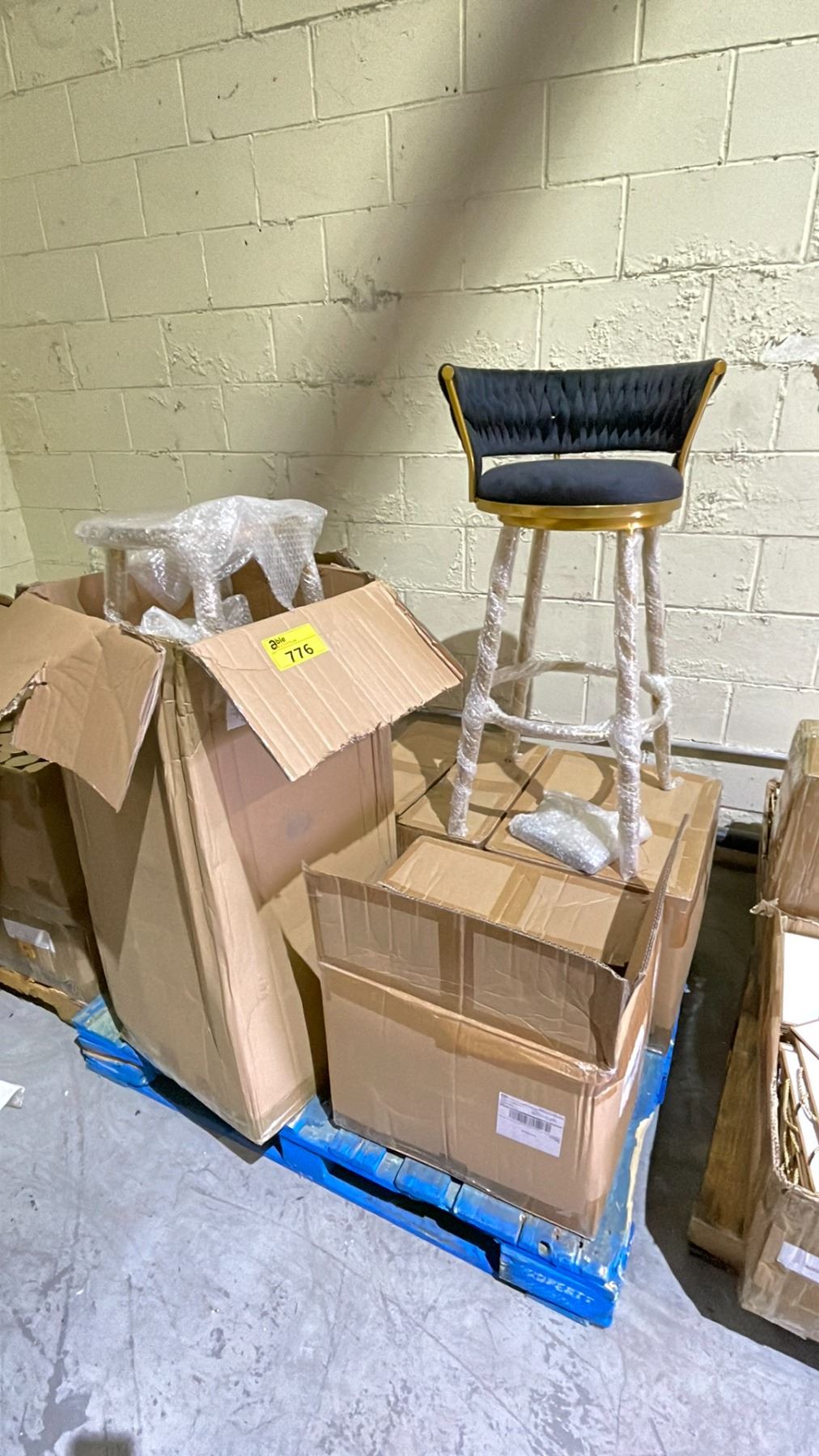 PALLET OF ASSORTED ITEMS INCLUDING; BAR STOOLS, WATERPROOF OUTDOOR FURNITURE COVERS AND MORE