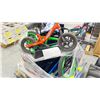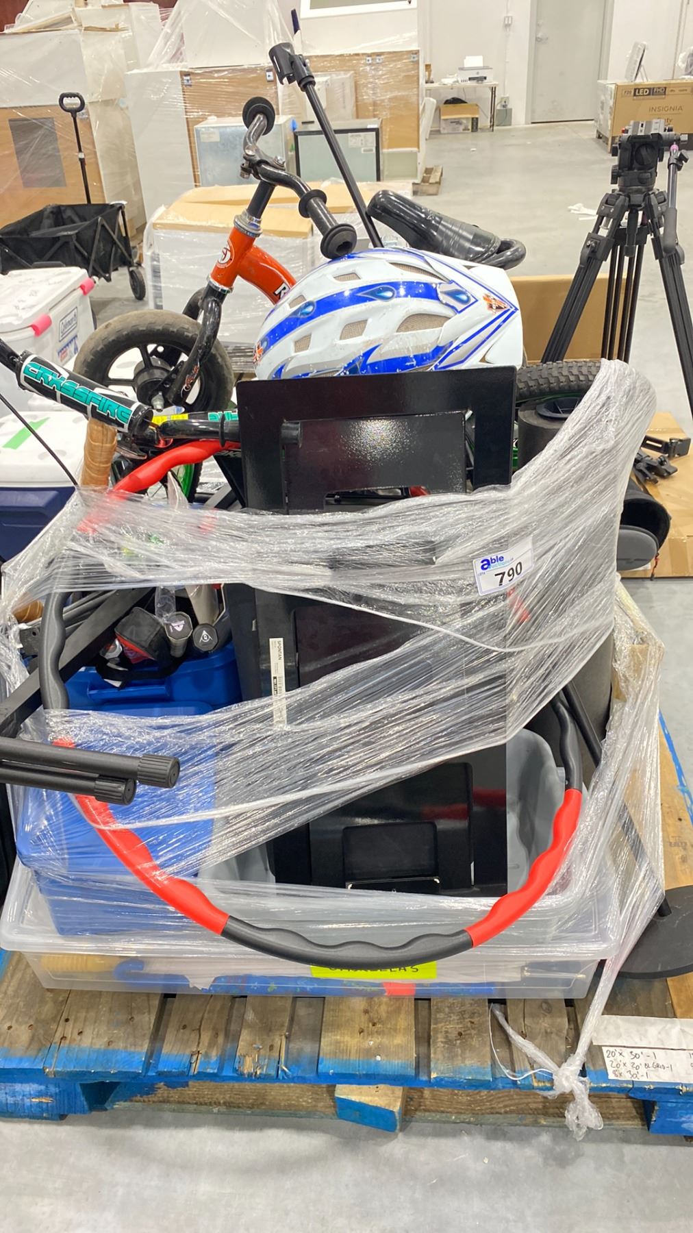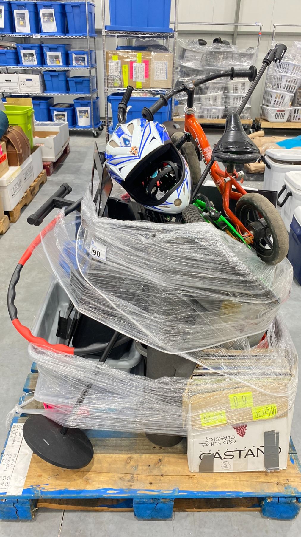 PALLET OF ASSORTED ITEMS INCLUDING; BIKES, RECORDS, TENNIS RACKETS & MORE