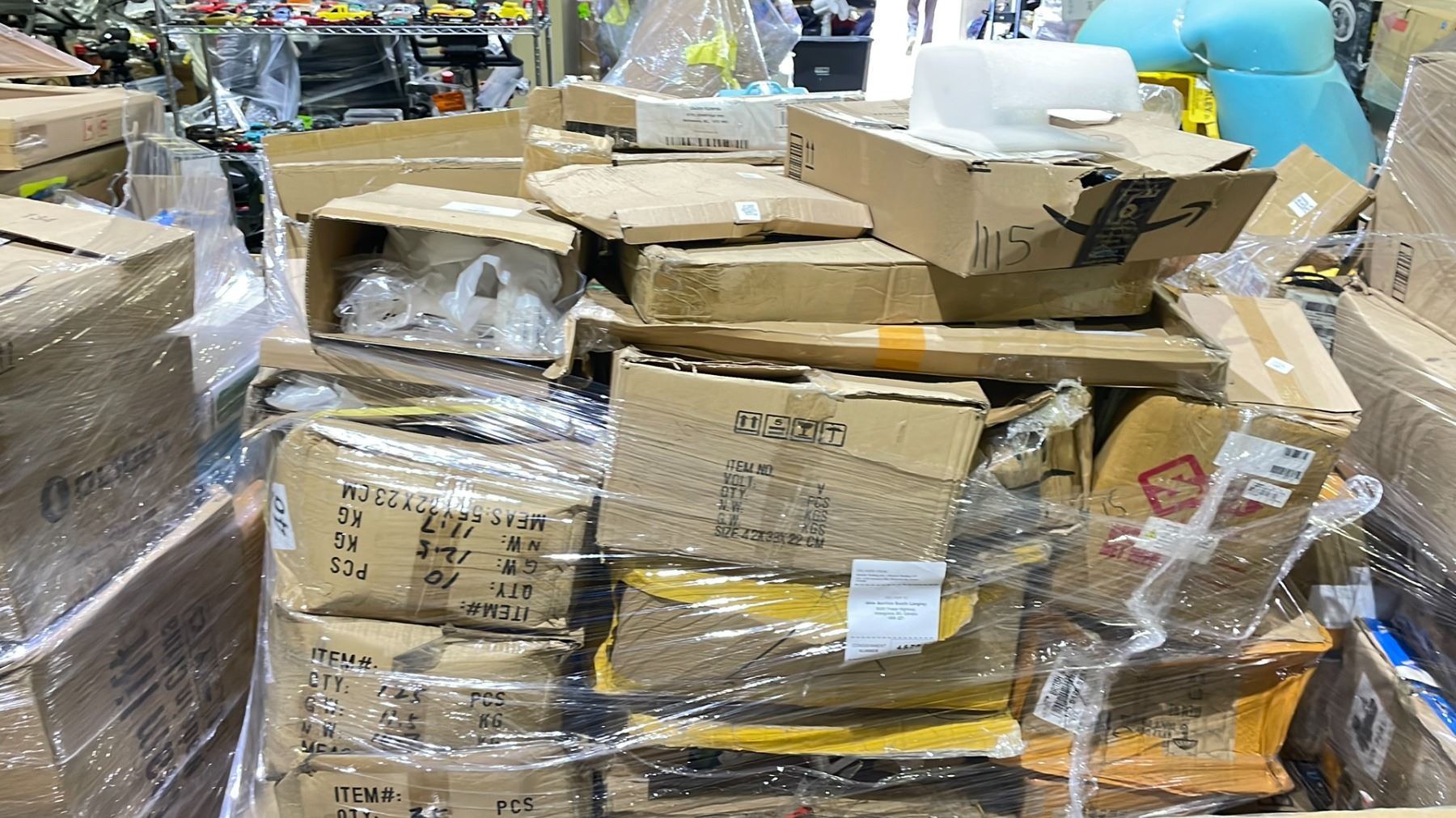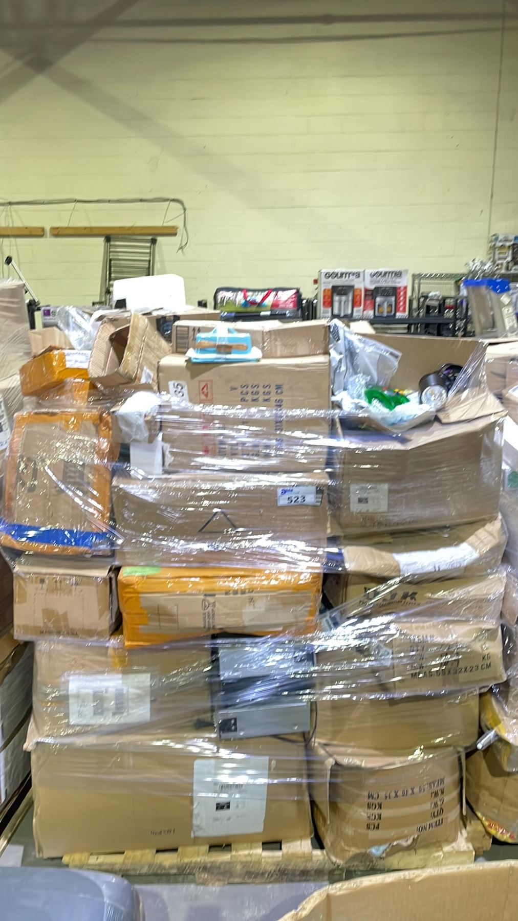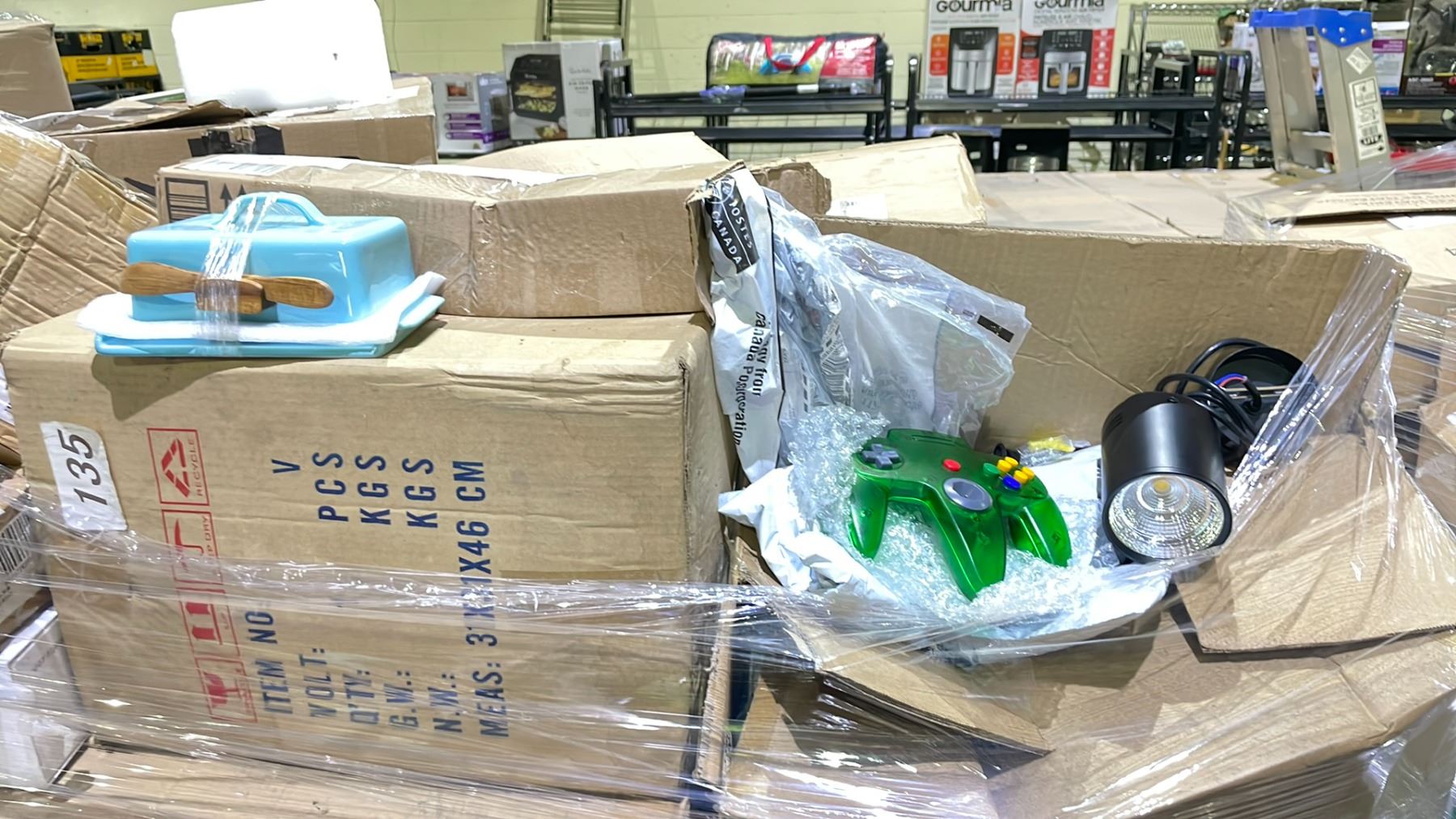 PALLET OF ASSORTED ITEMS INCLUDING; HANGING LIGHTS, N64 CONTROLLERS, BUTTER DISHES & MORE