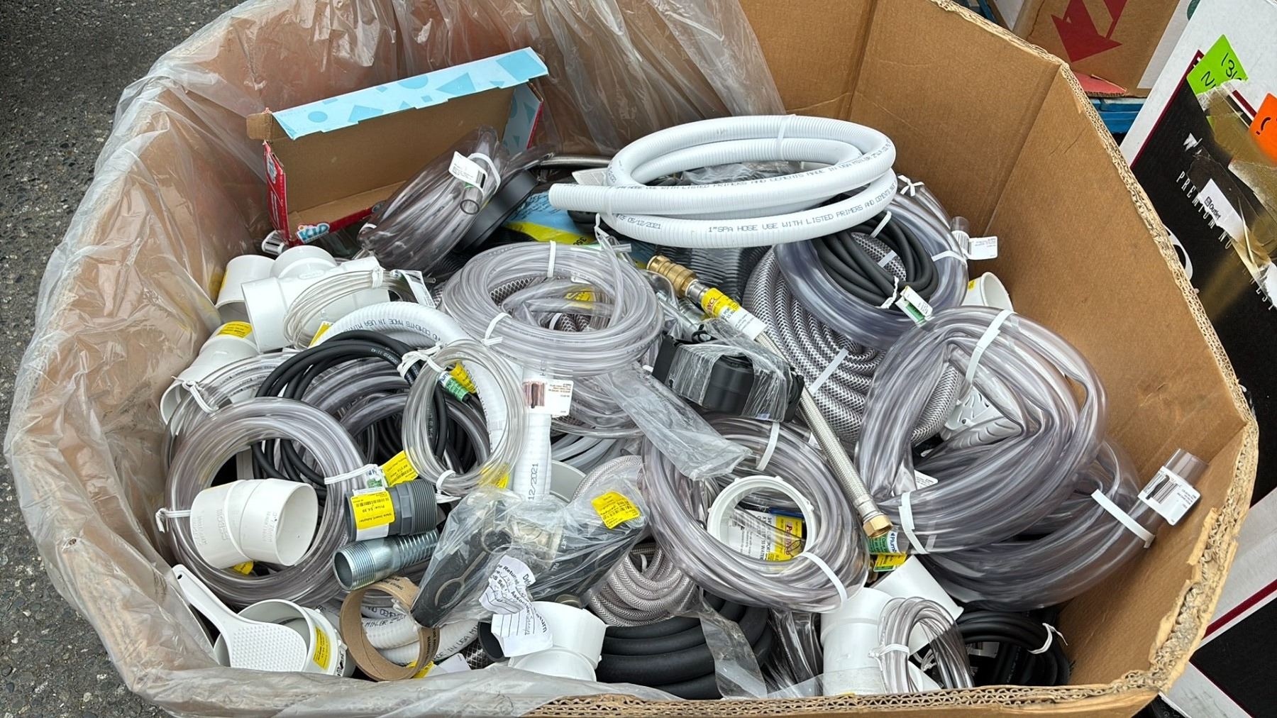 PALLET OF ASSORTED ITEMS INCLUDING; HOSES, PIPE FITTINGS, PVC PIPE, GARDEN HOSE NOZZLES & MORE