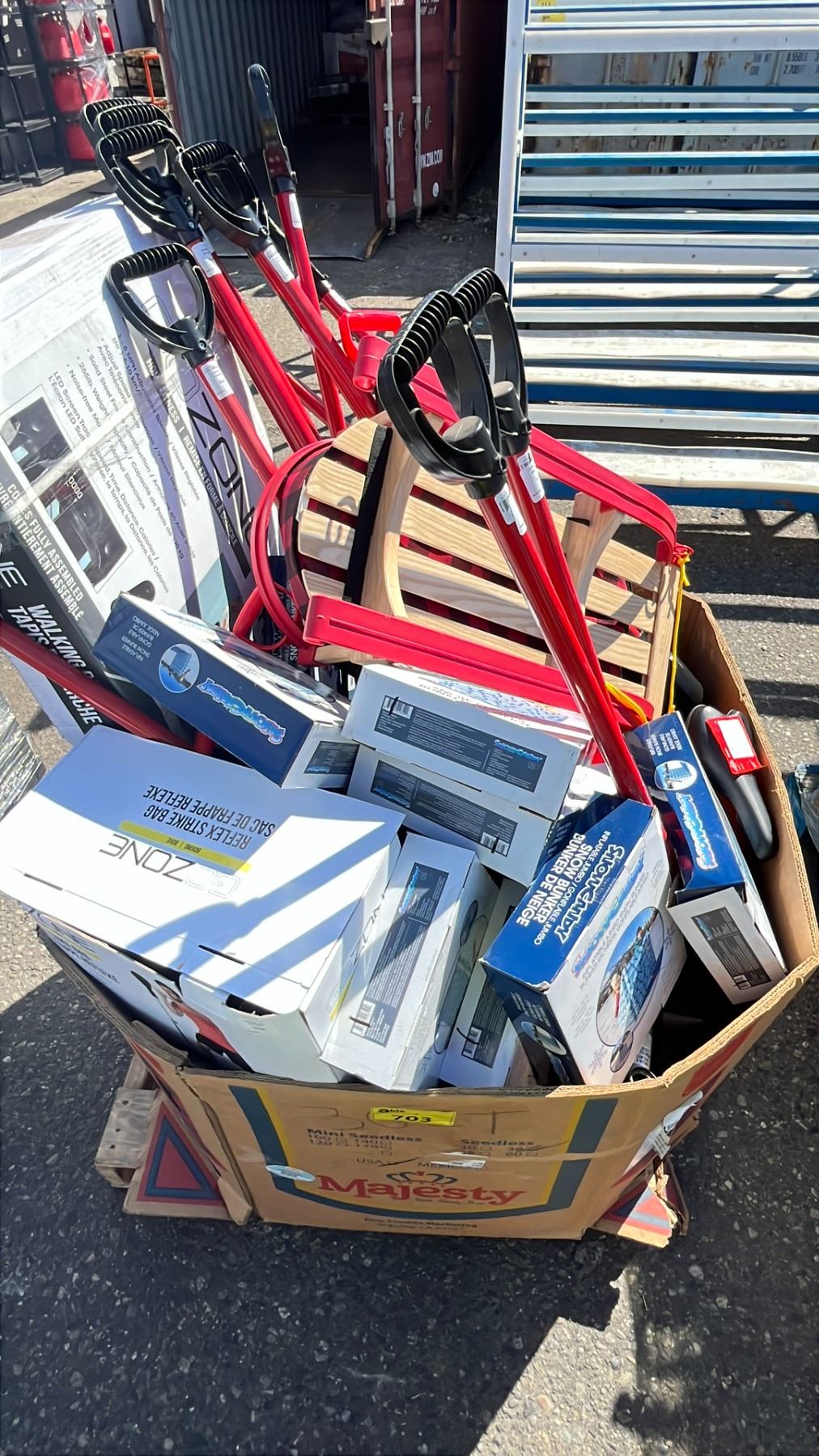 PALLET OF ASSORTED ITEMS INCLUDING; INFLATABLE SNOW WALLS, SHOVELS, SLED & MORE (UNKNOWN WORKING CONDITION, MAY BE MISSING PARTS & PIECES)