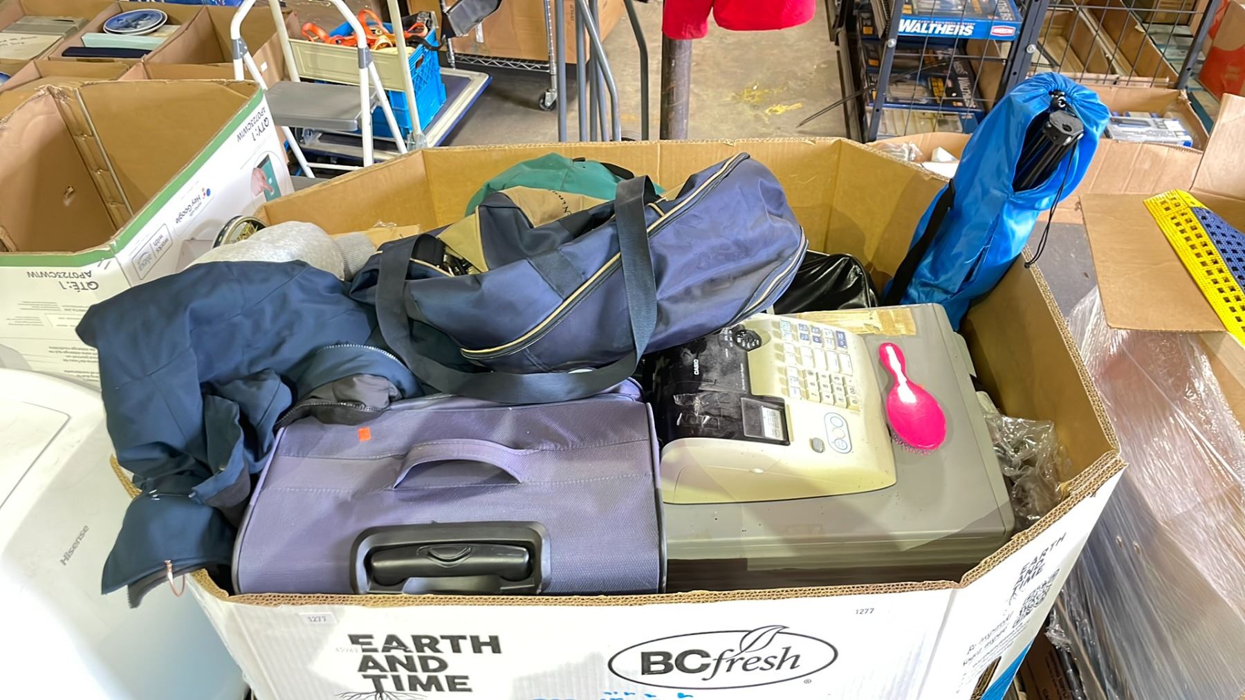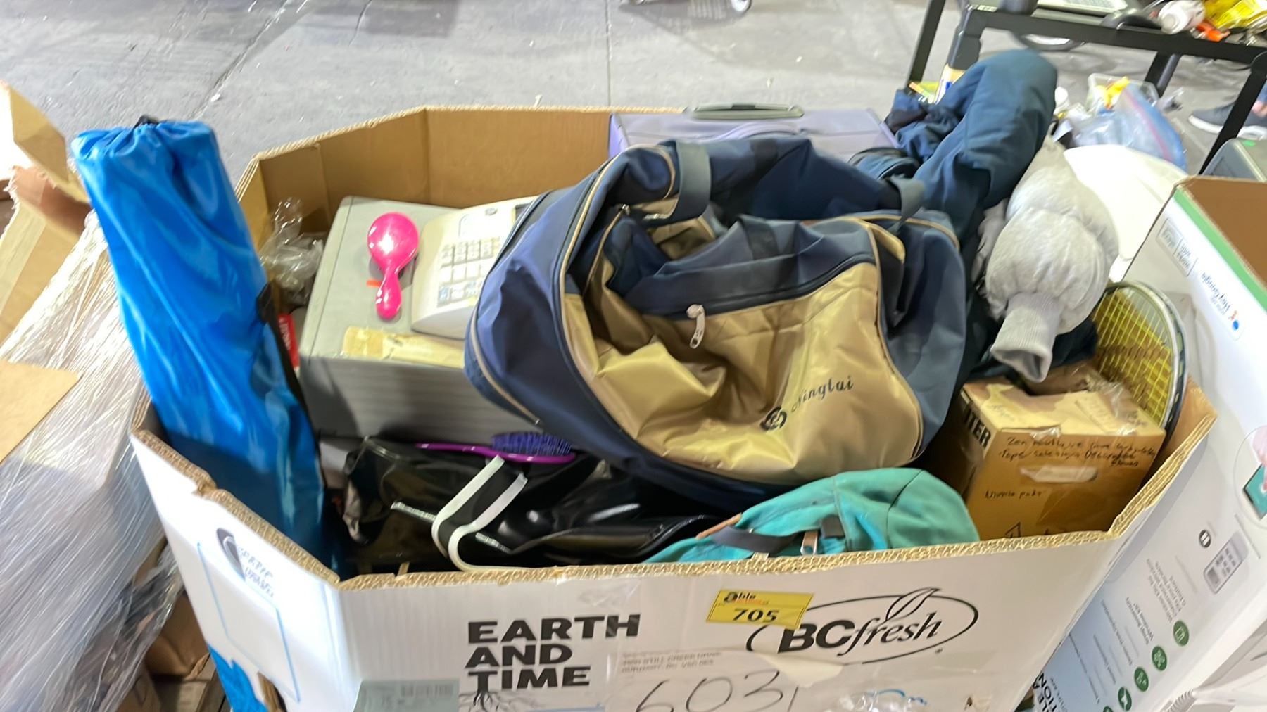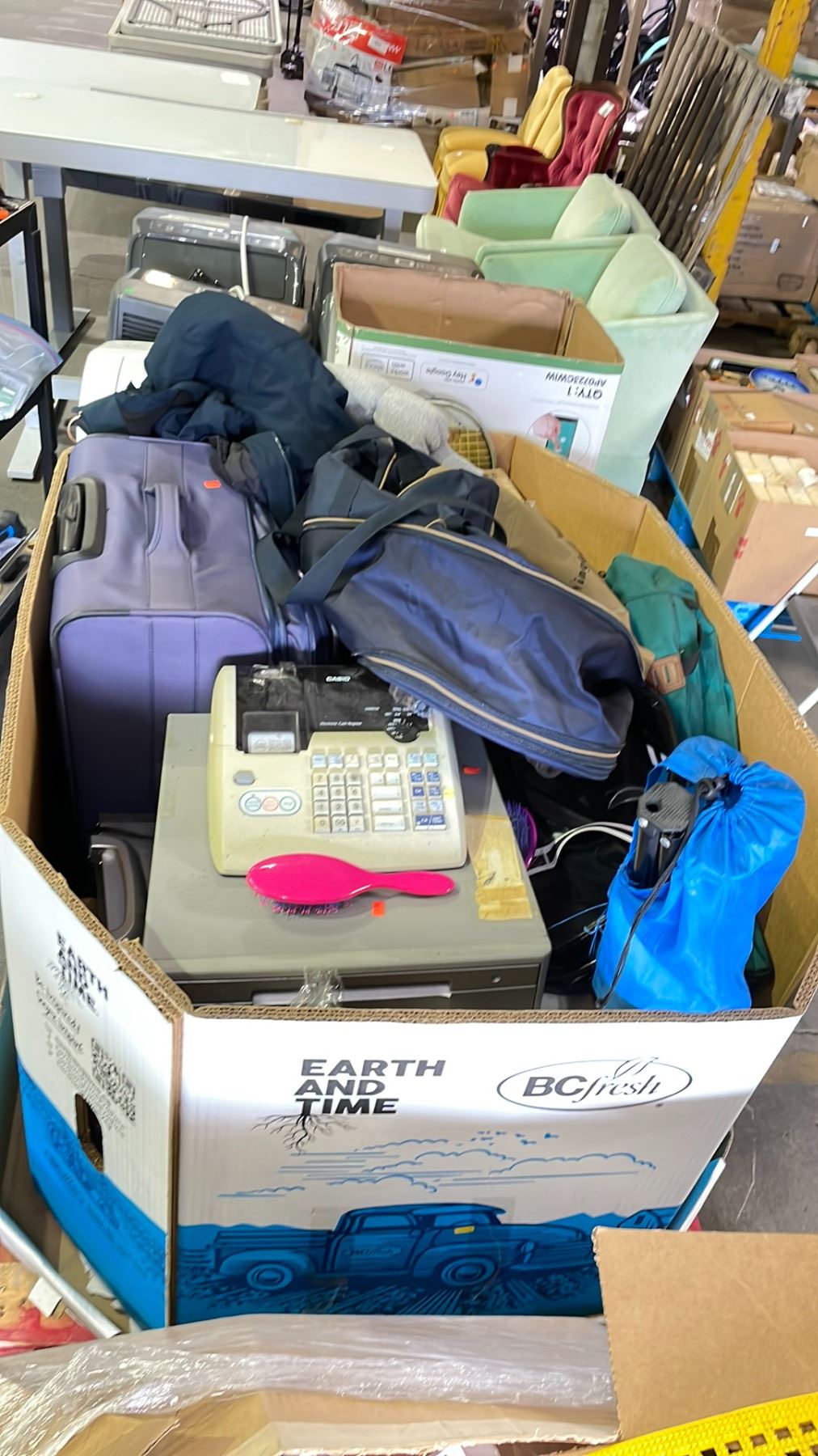 PALLET OF ASSORTED ITEMS INCLUDING; LUGGAGE VINTAGE POS MACHINE, LAWN CHAIR & MORE