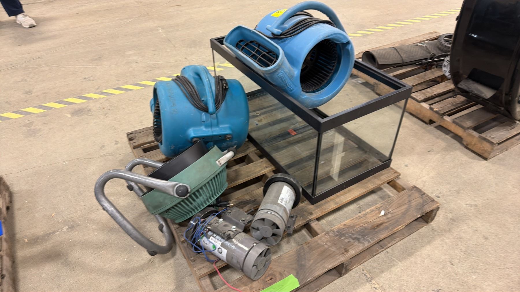 PALLET OF ASSORTED ITEMS INCLUDING; POWERX FLOOR FANS, MOTORS, FISH TANK & MORE