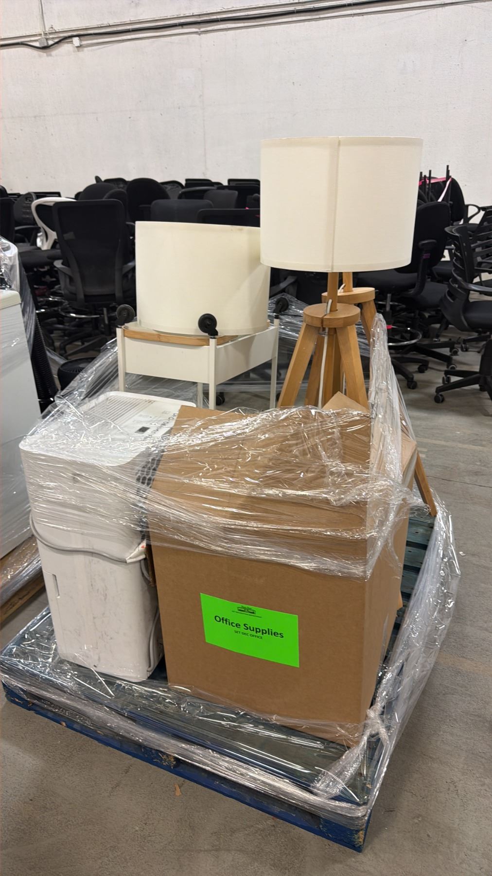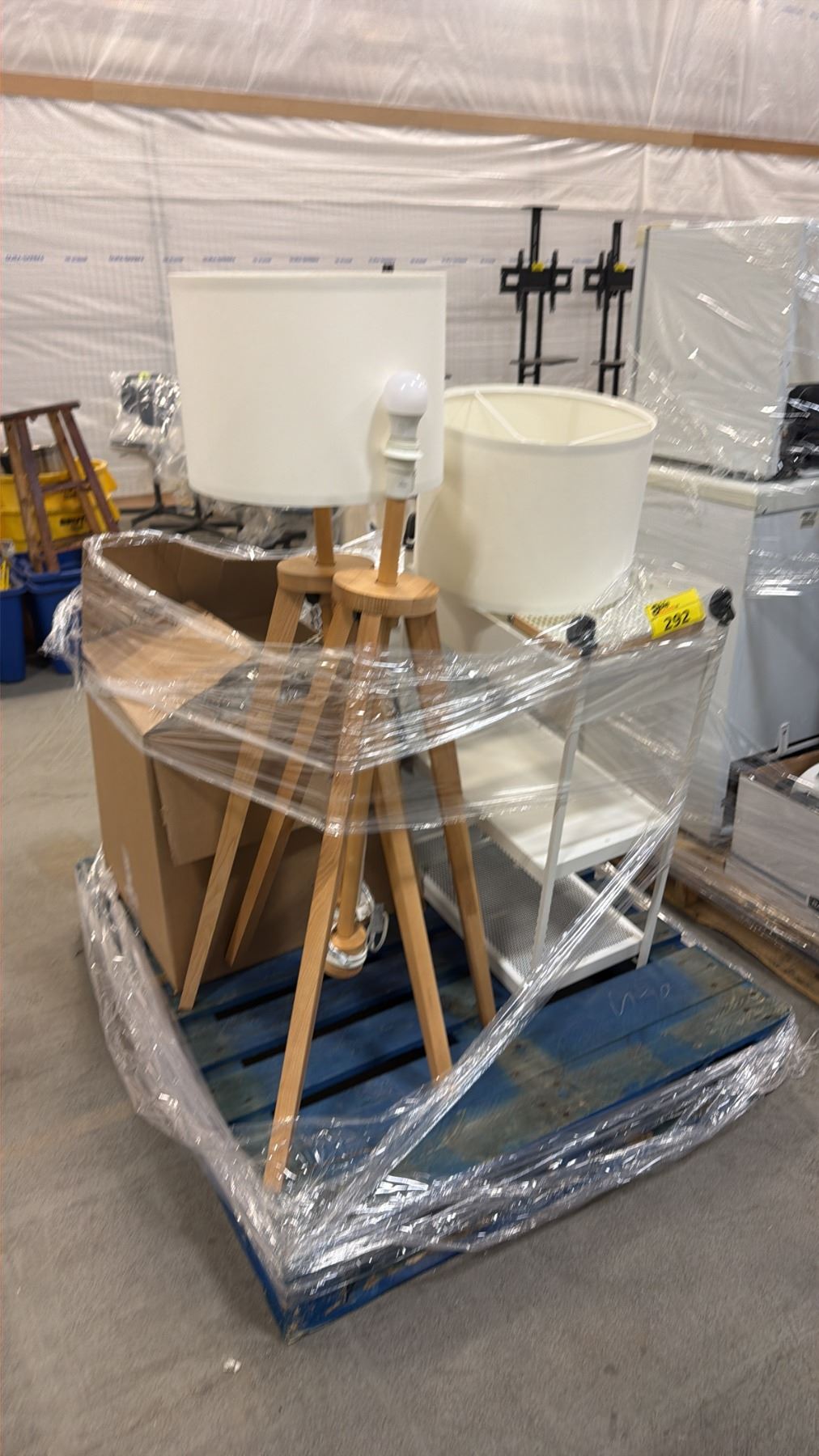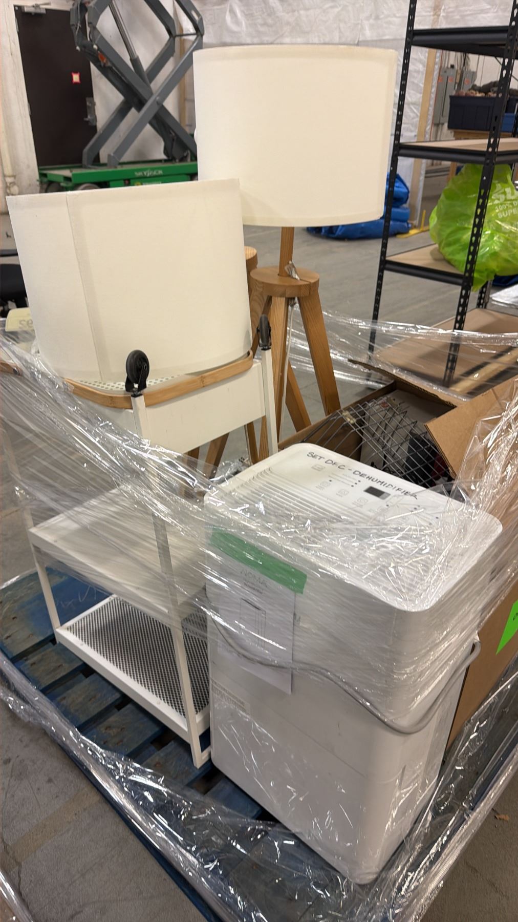 PALLET OF ASSORTED ITEMS INCLUDING; SHELVING UNIT, FLOOR LAMPS, AIR CONDITIONER & MORE