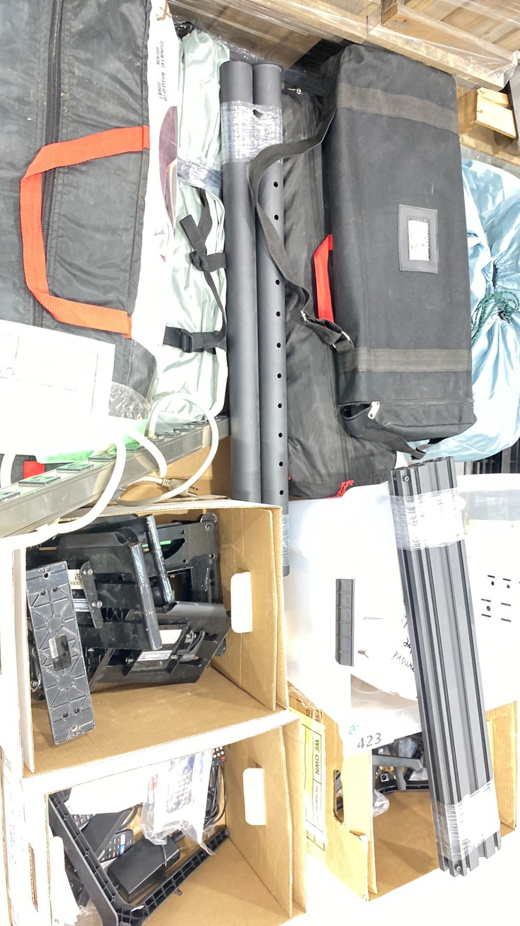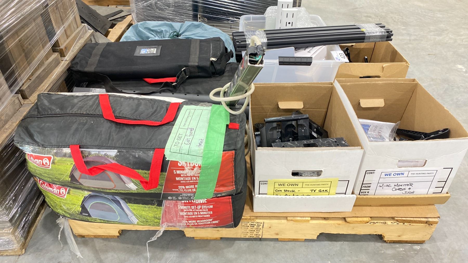 PALLET OF ASSORTED ITEMS INCLUDING; TENTS, TV & MONITOR ACCESSORIES, MOUNTS & MORE