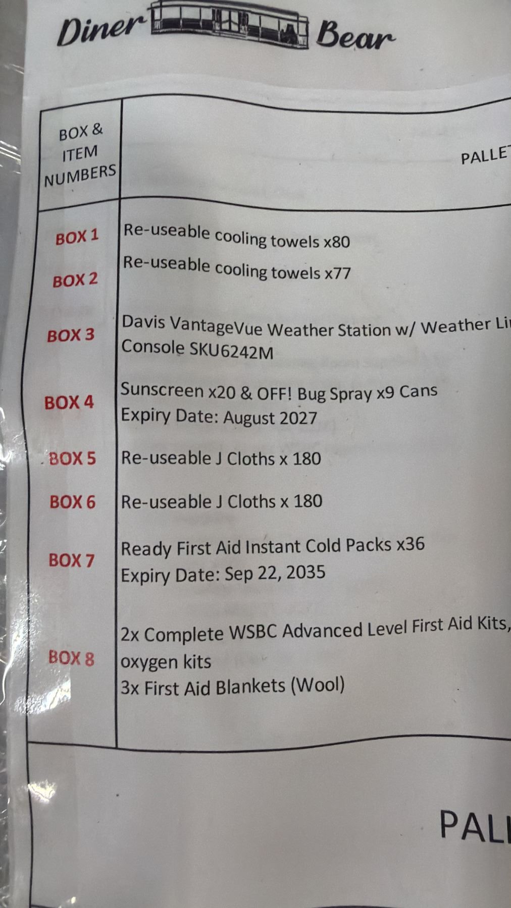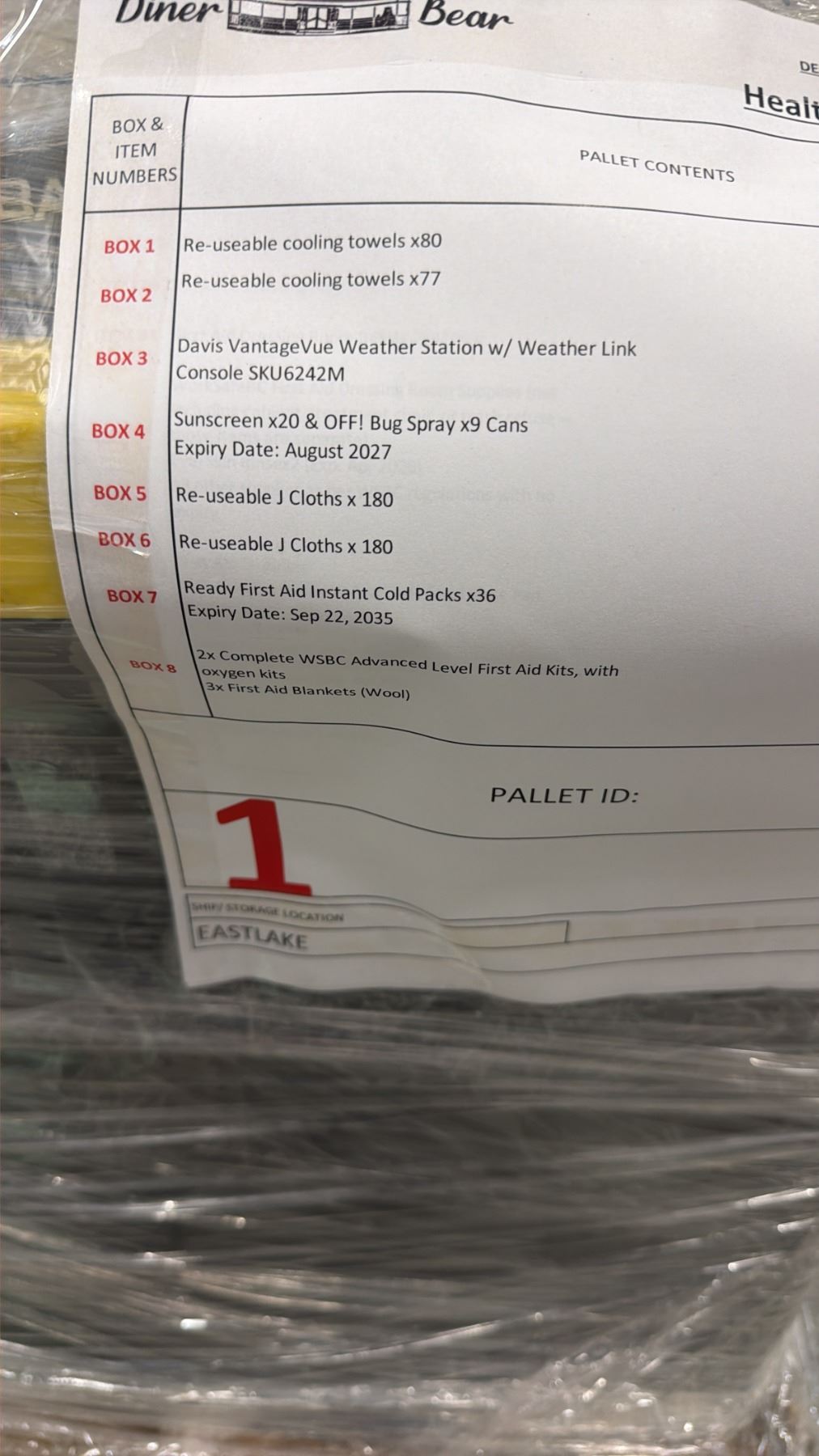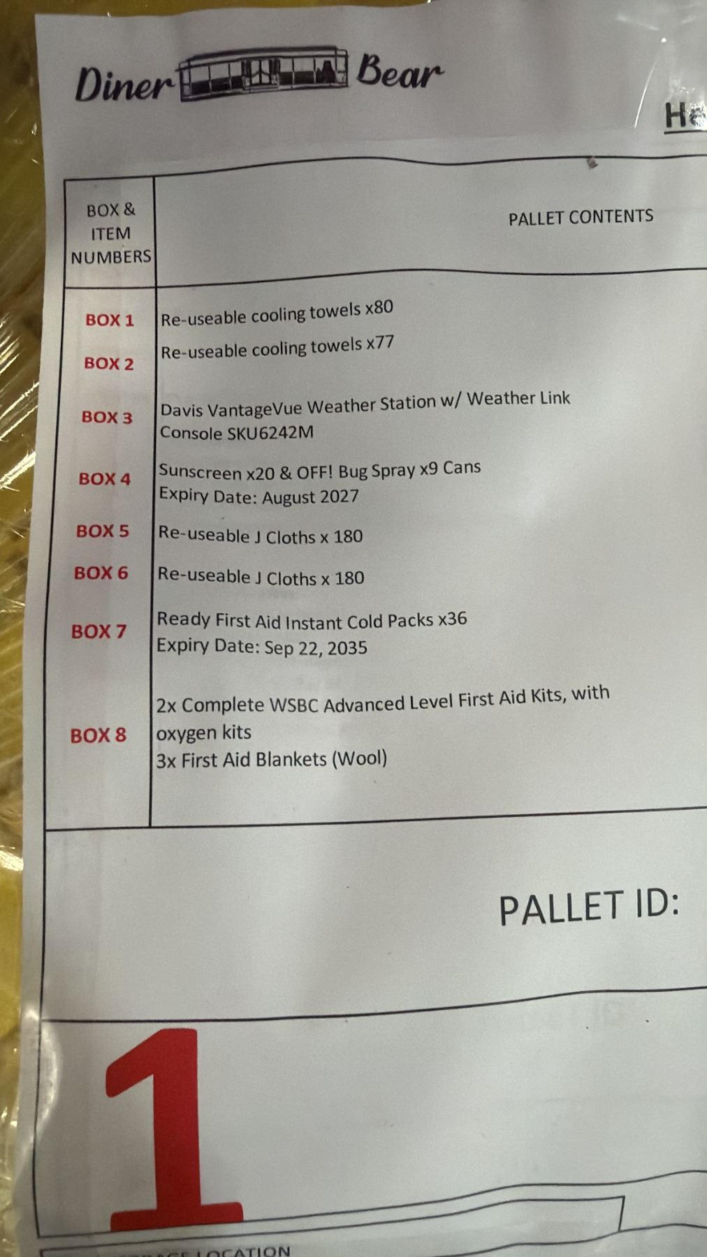 PALLET OF ASSORTED ITEMS INCLUDING; TOWELS, BUG SPRAY, WEATHER STATION & MORE