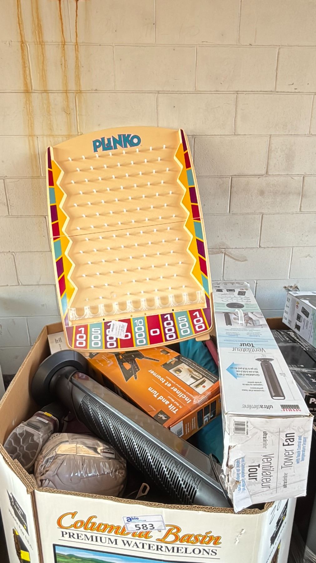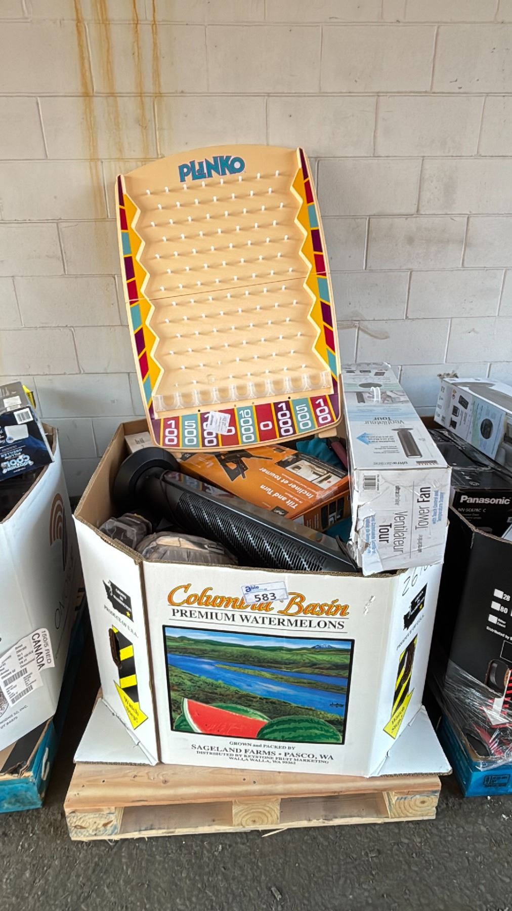 PALLET OF ASSORTED ITEMS INCLUDING; TOWER FANS, TV ALL MOUNT, PLINKO BOARD & MORE (UNKNOWN WORKING