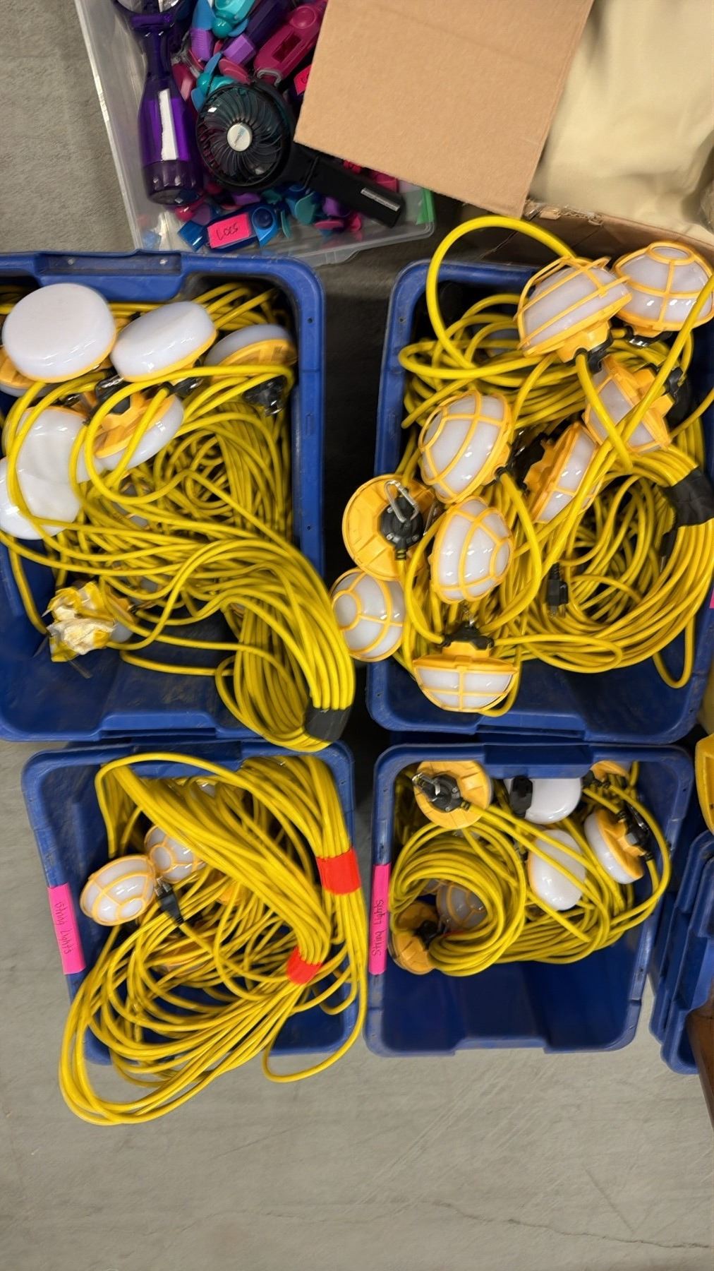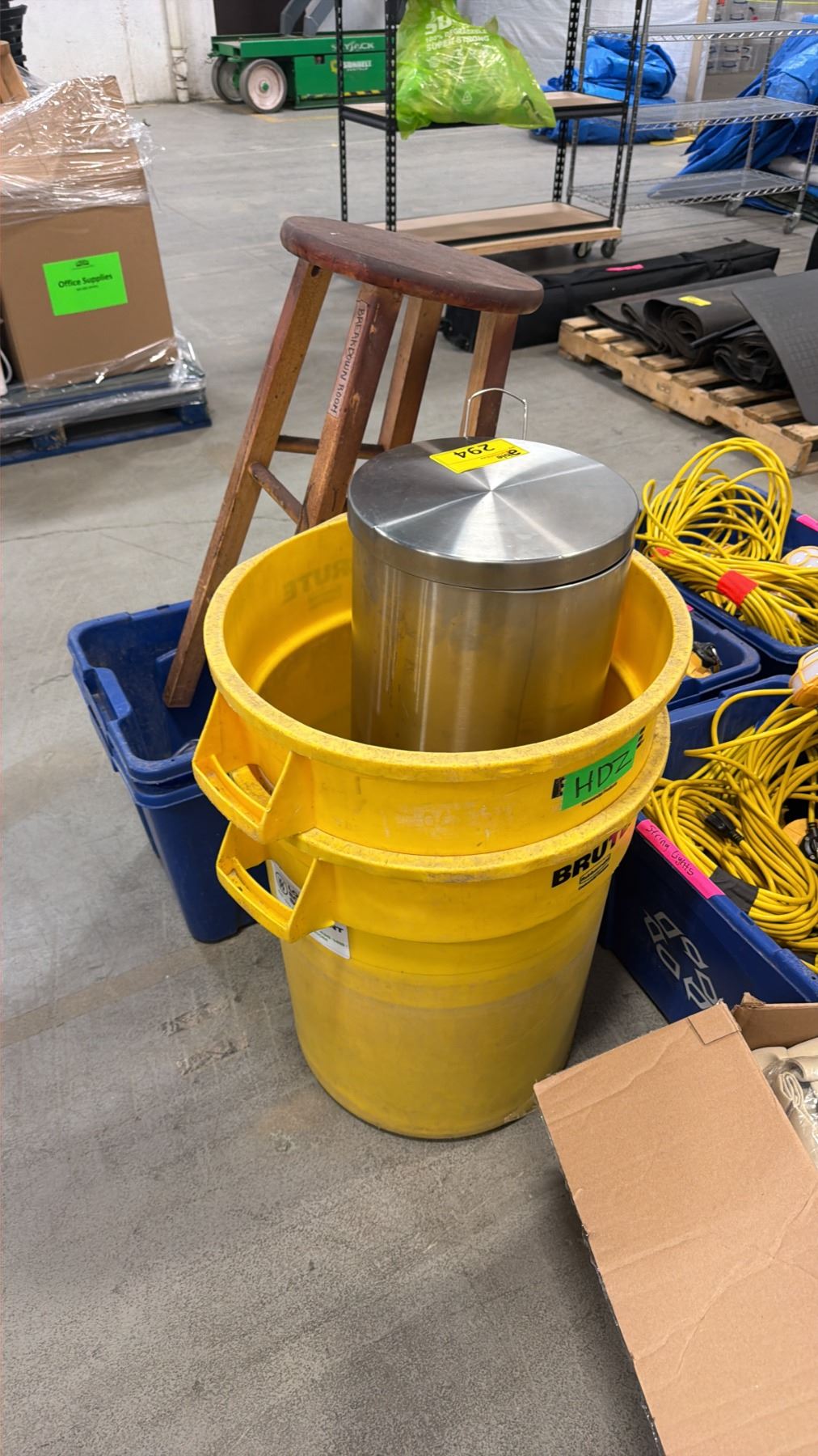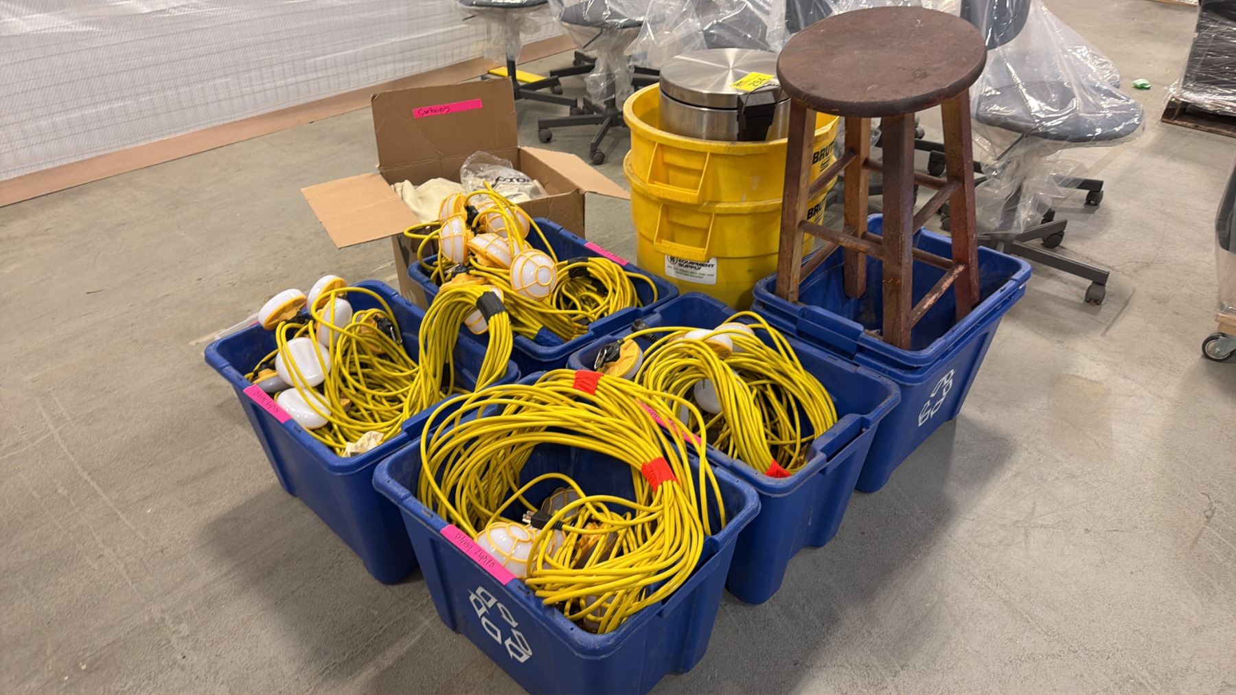 PALLET OF ASSORTED ITEMS INCLUDING; WASTE BINS, EXTENSION CORDS, STOOL & MORE