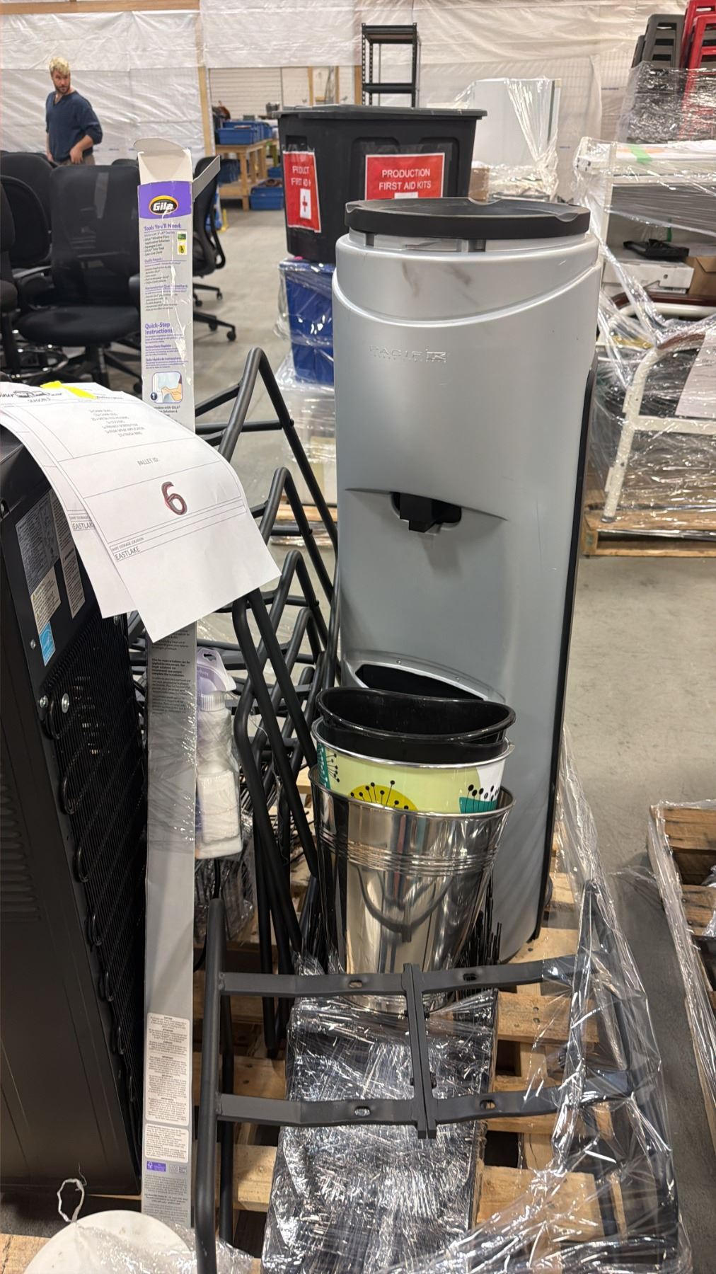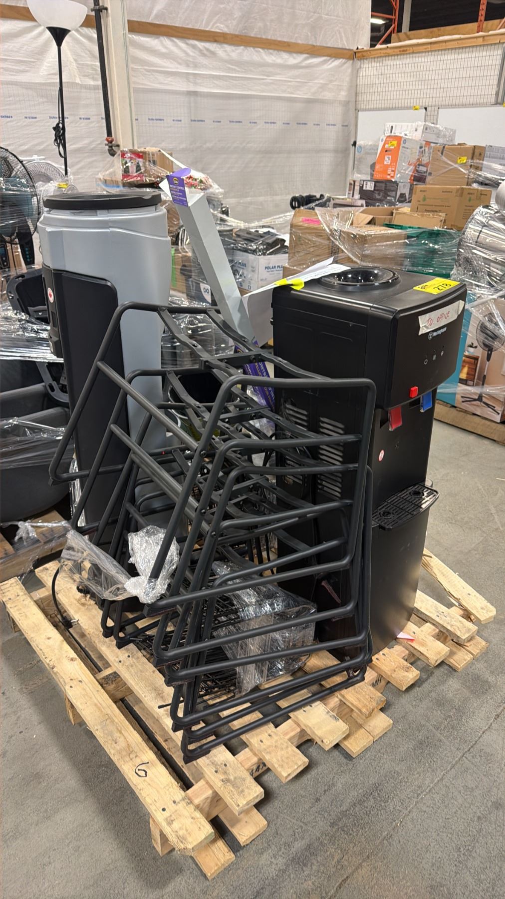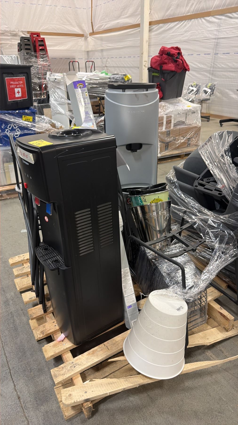 PALLET OF ASSORTED ITEMS INCLUDING; WATER DISPENSERS, CHAIR BASES & MORE