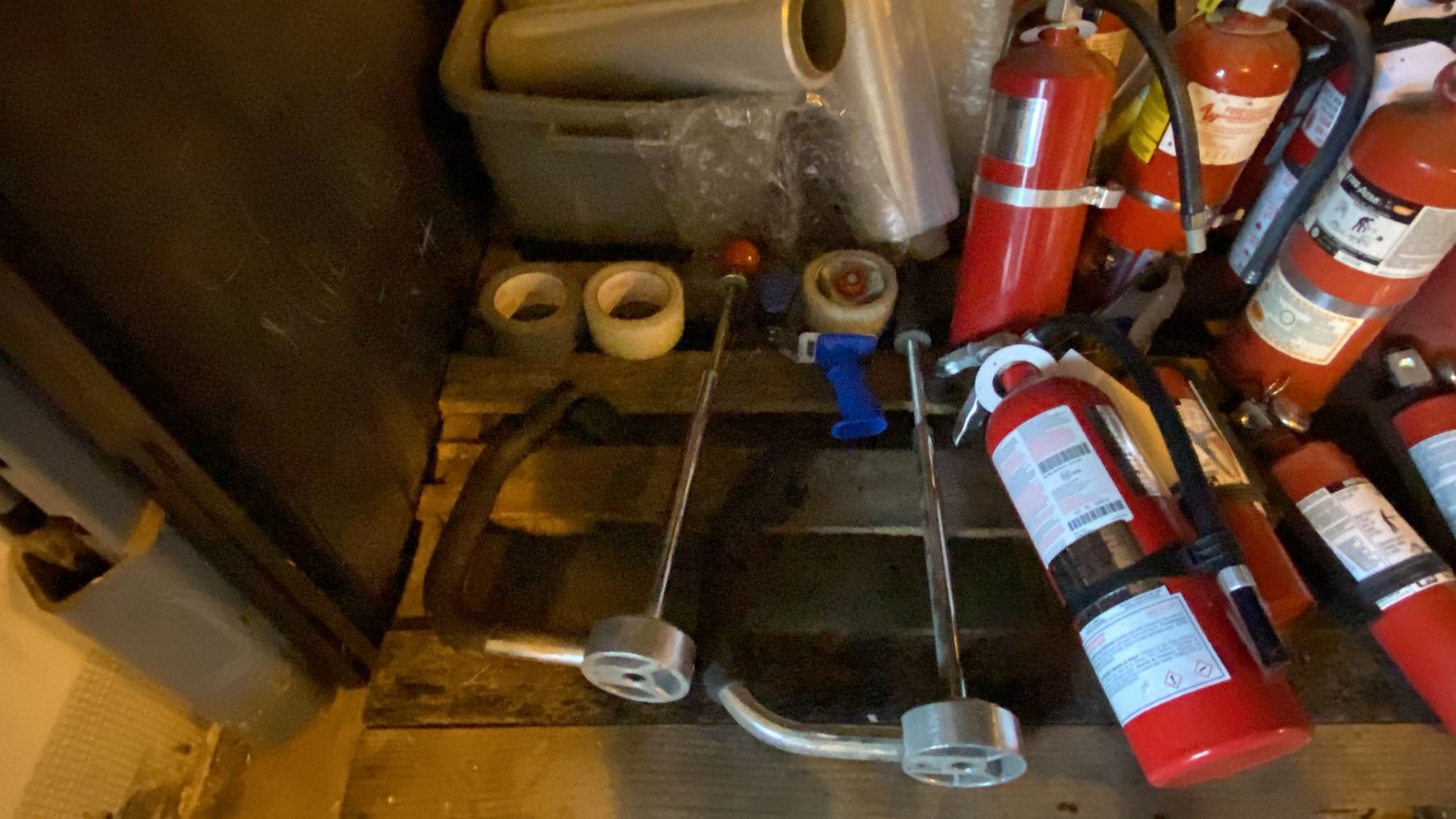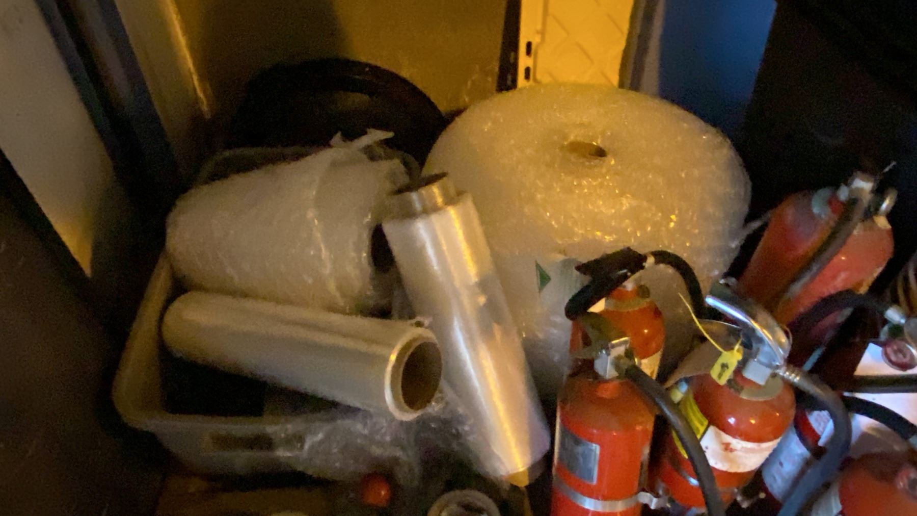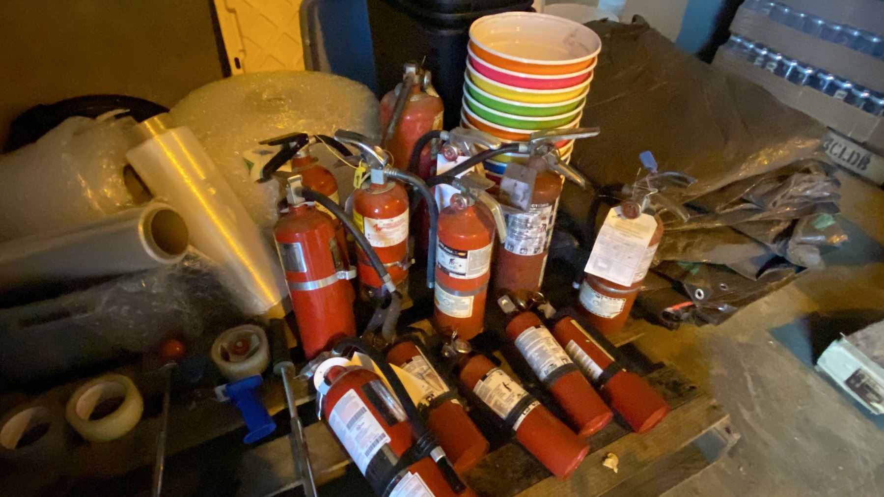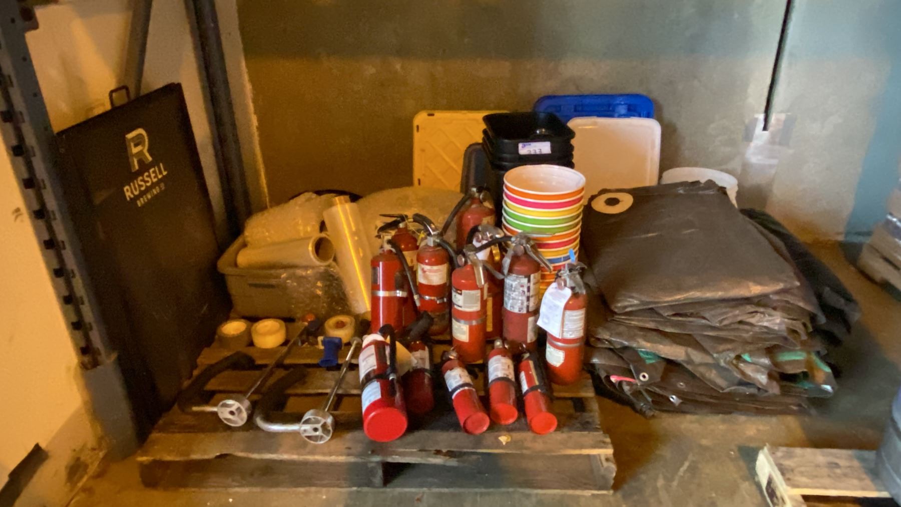 PALLET OF ASSORTED ITEMS - PACKAGING SUPPLIES, FIRE EXTINGUISHERS, TARPS AND MORE