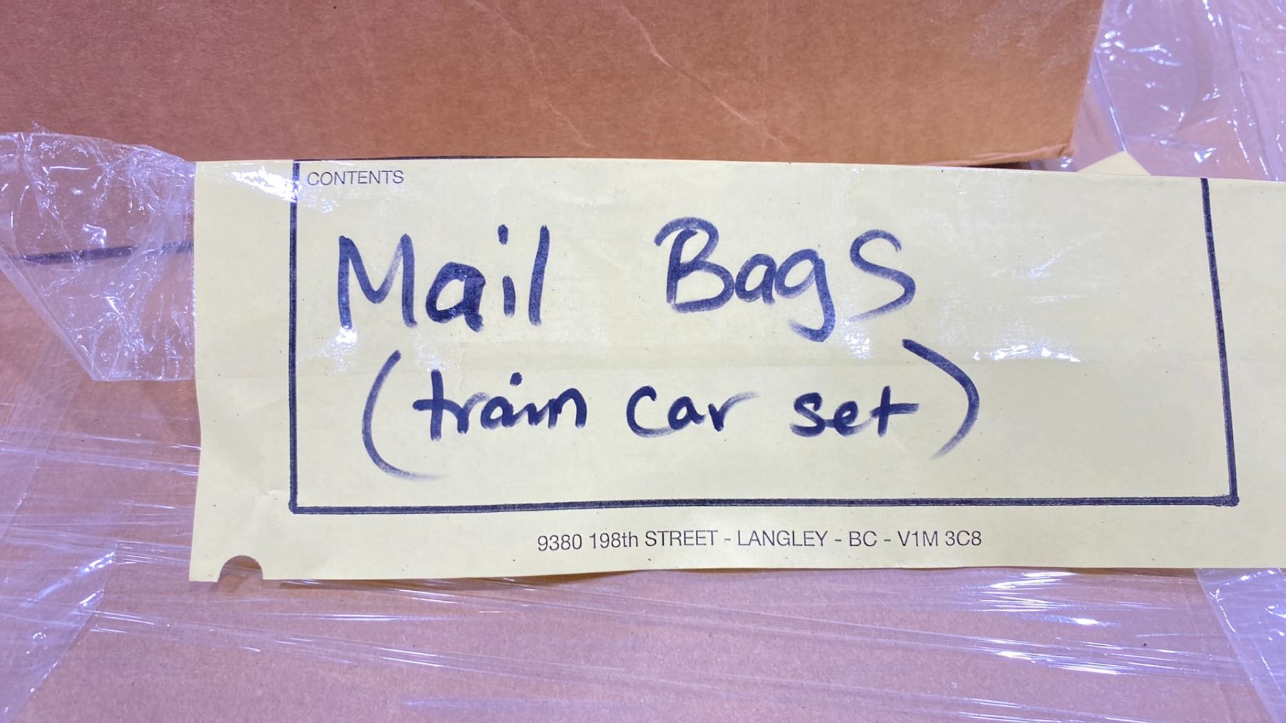 PALLET OF ASSORTED MAIL BAGS & TRAIN CAR SET