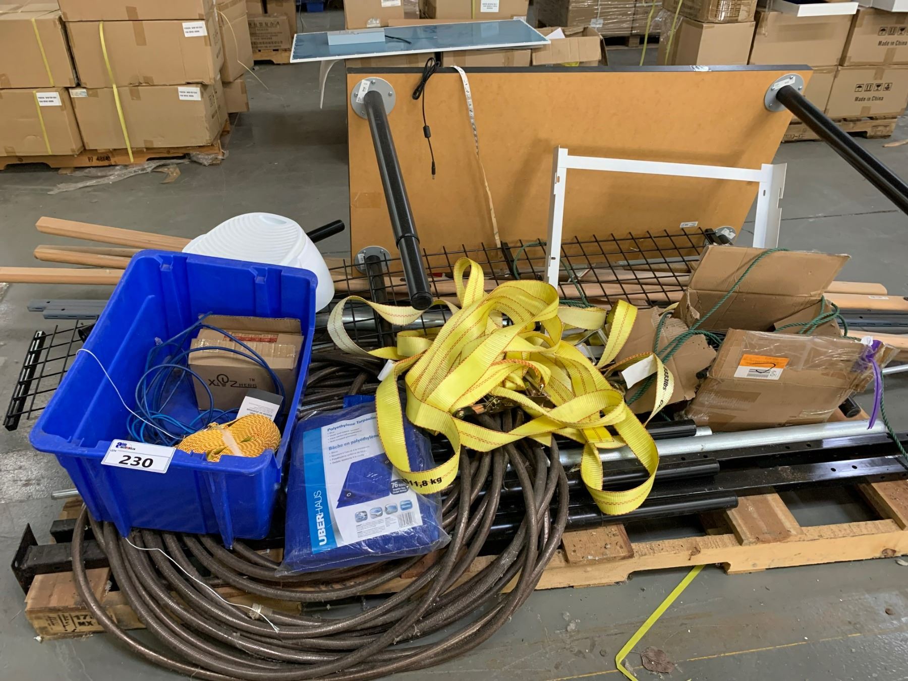 PALLET OF ASSORTED MISC. ITEMS: HEAVY TIE DOWN STRAPPING, GARDEN HOSE, STEEL POST, WOODEN BANISTER RAILS, & MORE