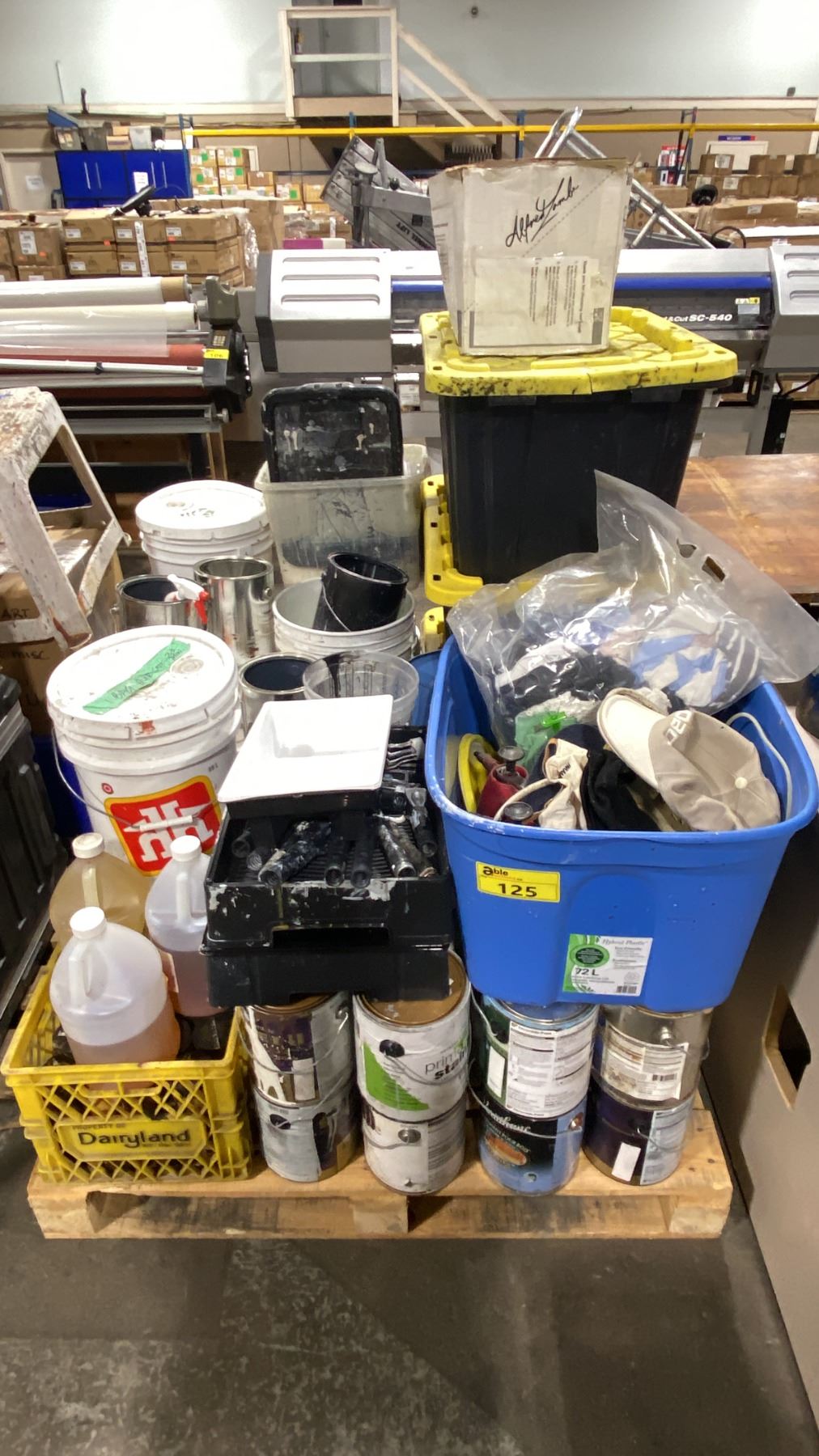 PALLET OF ASSORTED PAINTS, CHEMICALS, DYES, PAINTING ACCESSORIES & ASSORTED PRINT SHOP ITEMS