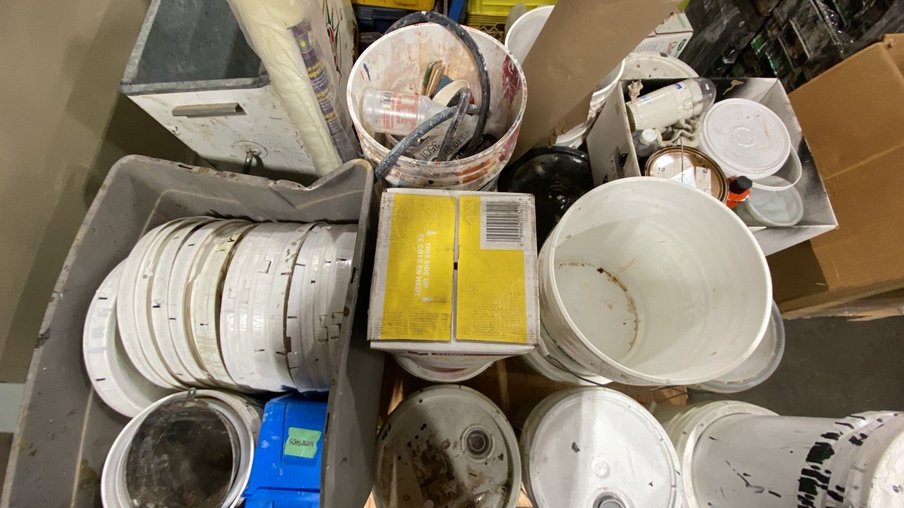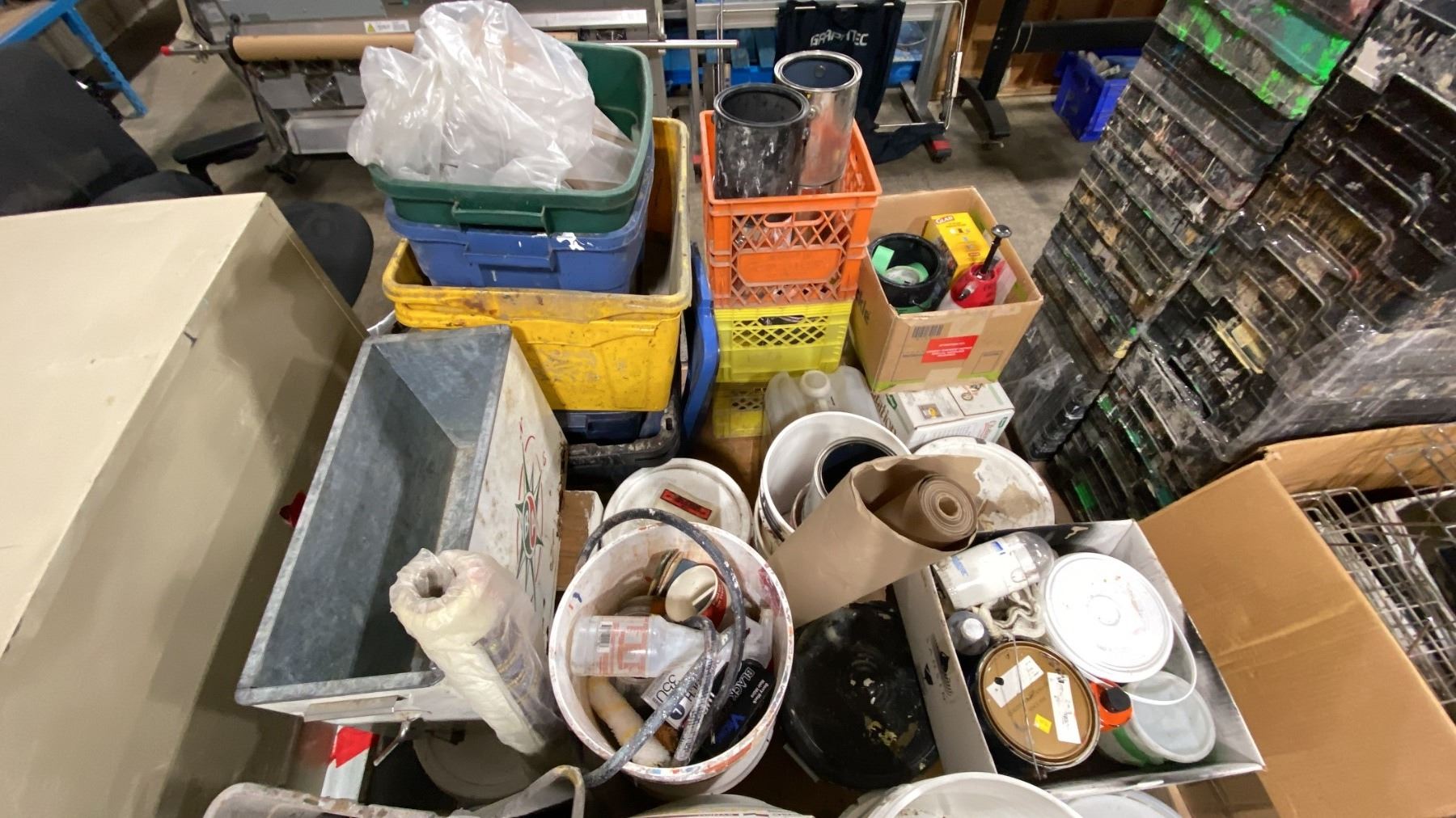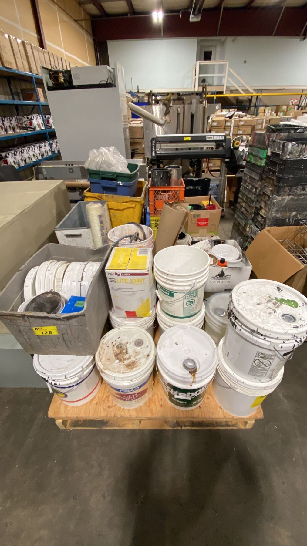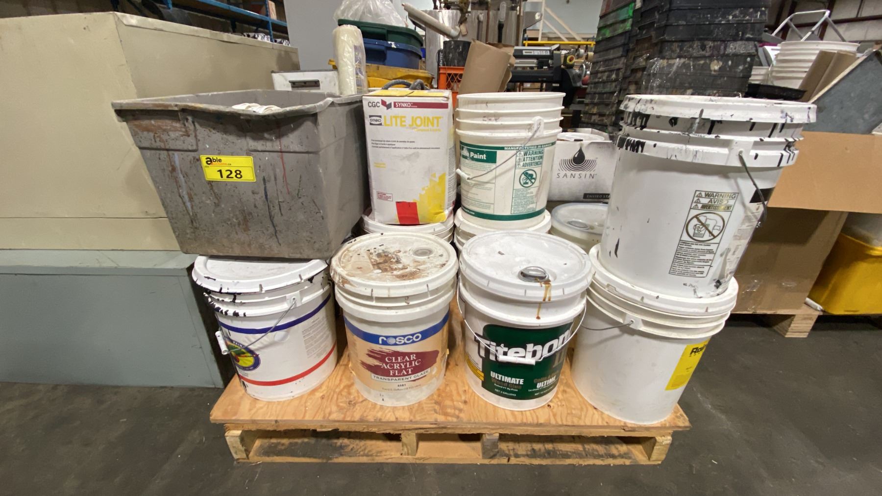 PALLET OF ASSORTED PAINTS, CHEMICALS, DYES, PAINTING ACCESSORIES & ASSORTED PRINT SHOP ITEMS
