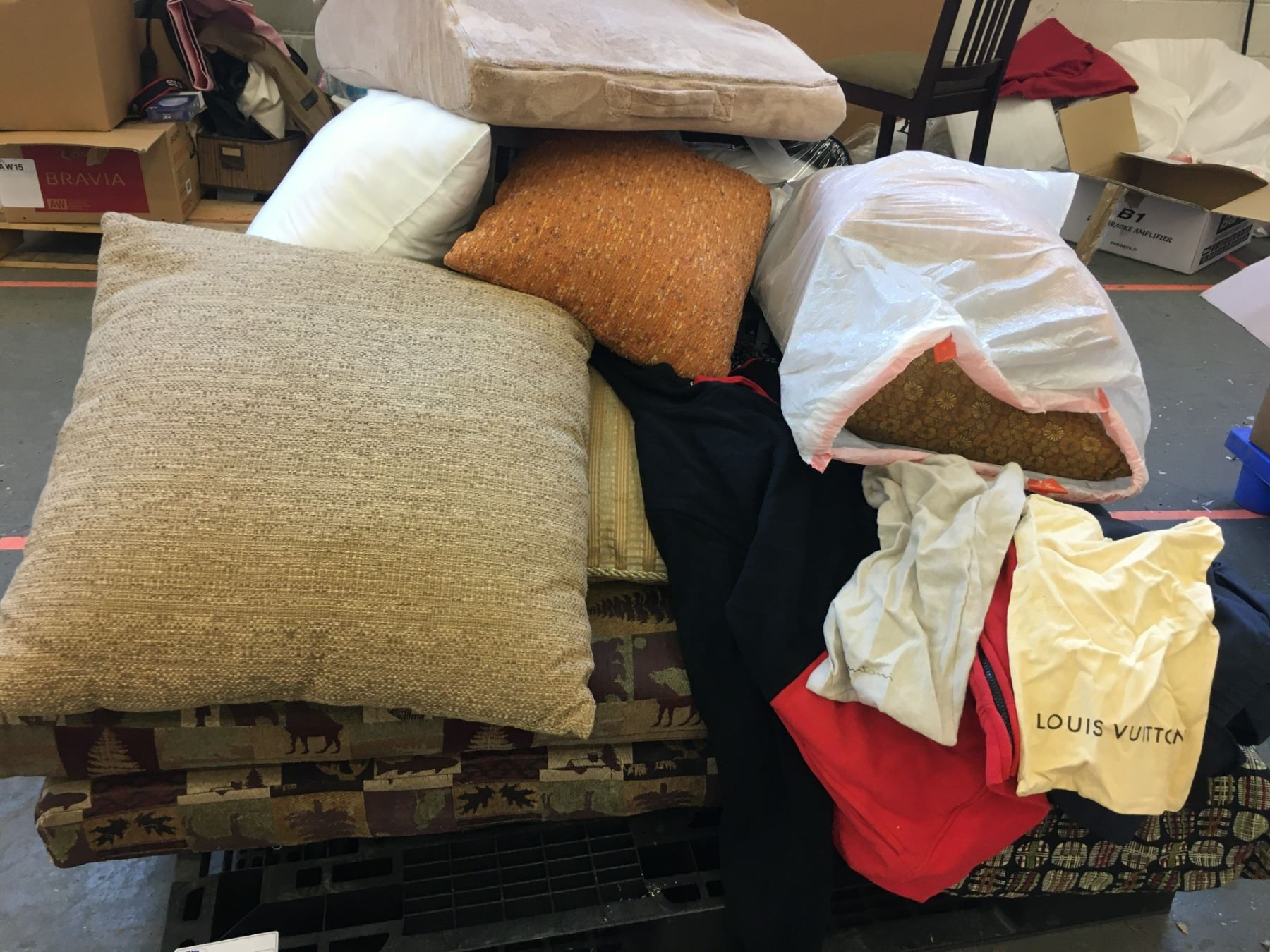PALLET OF ASSORTED PILLOWS, CUSHIONS, BEDDING & CLOTHING