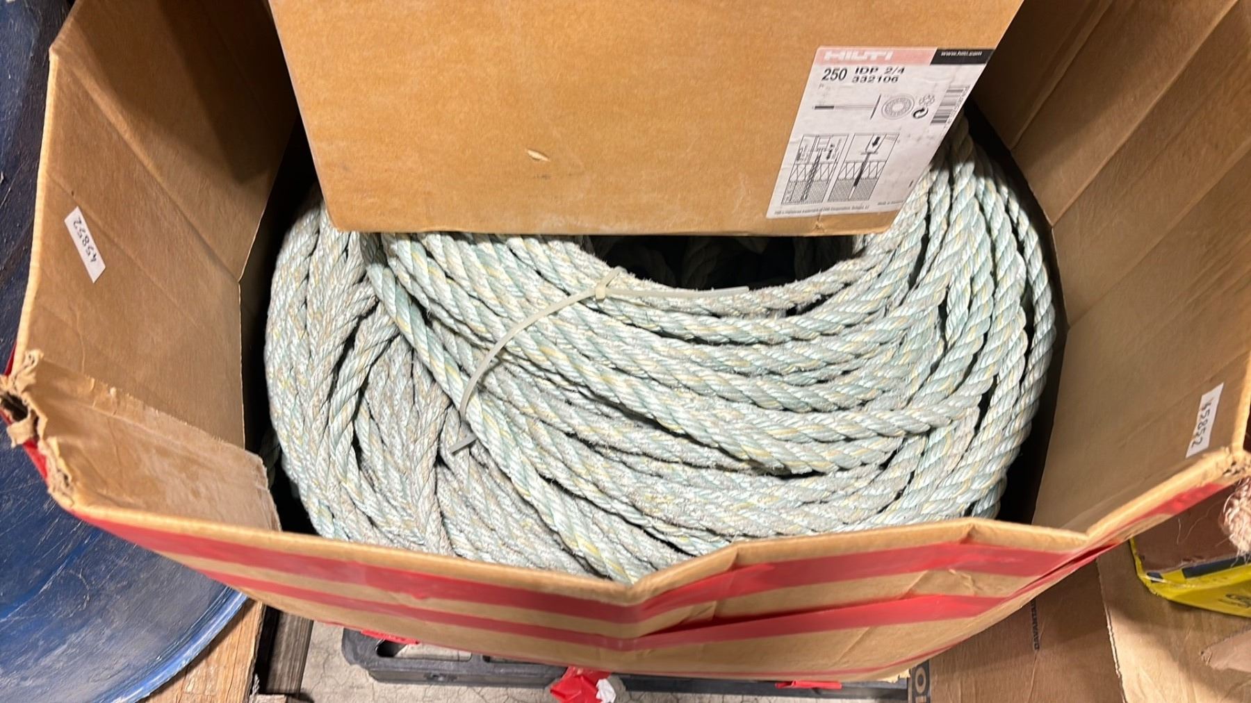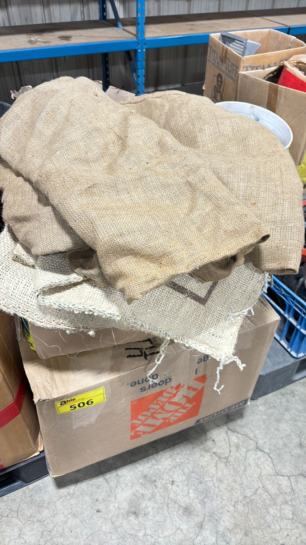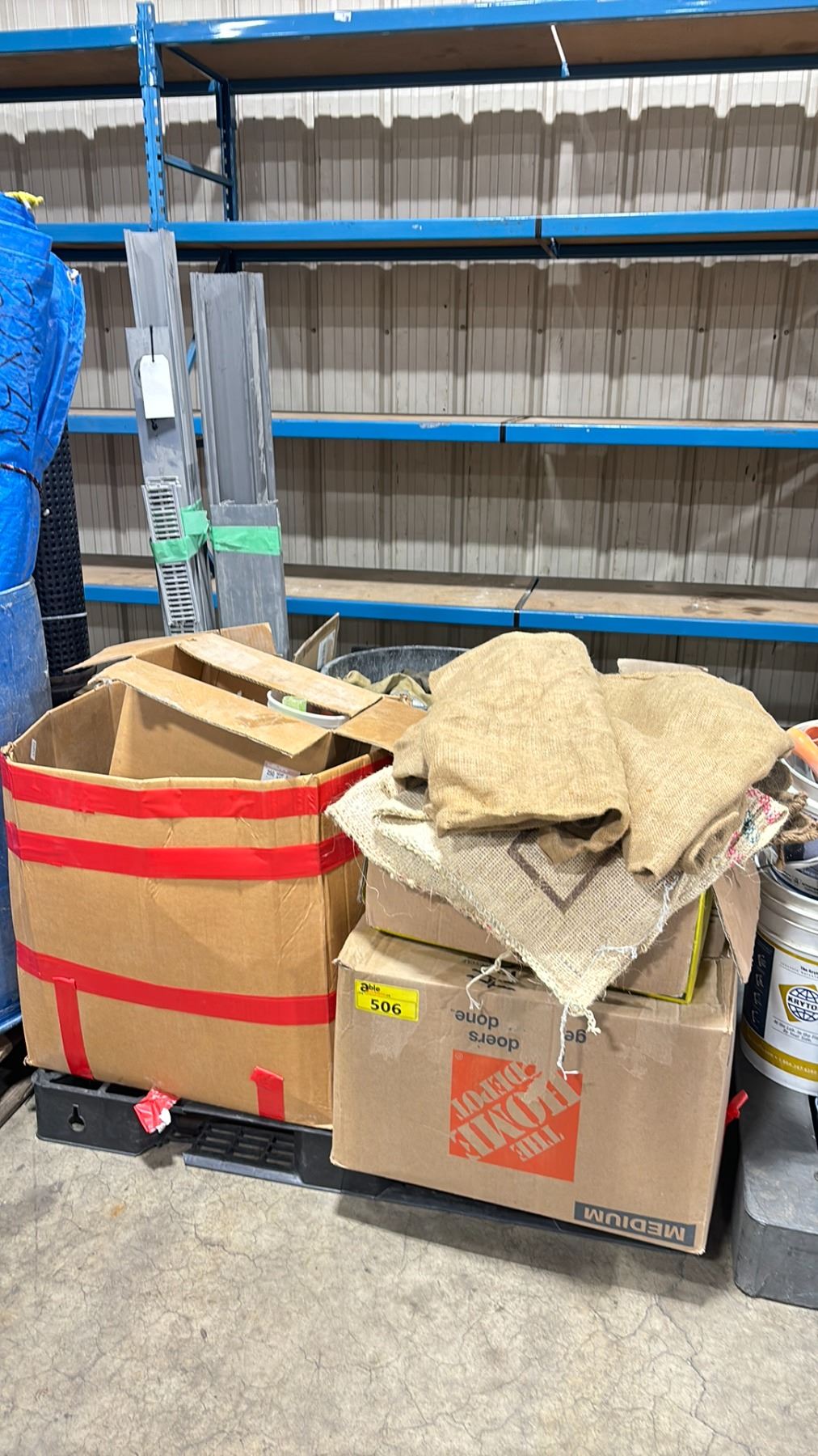 PALLET OF ASSORTED PLASTIC CHANNEL, BOXES OF ROPE, BURLAP AND ASSORTED WHEELS / TIRES