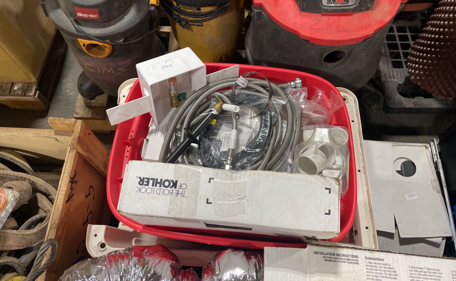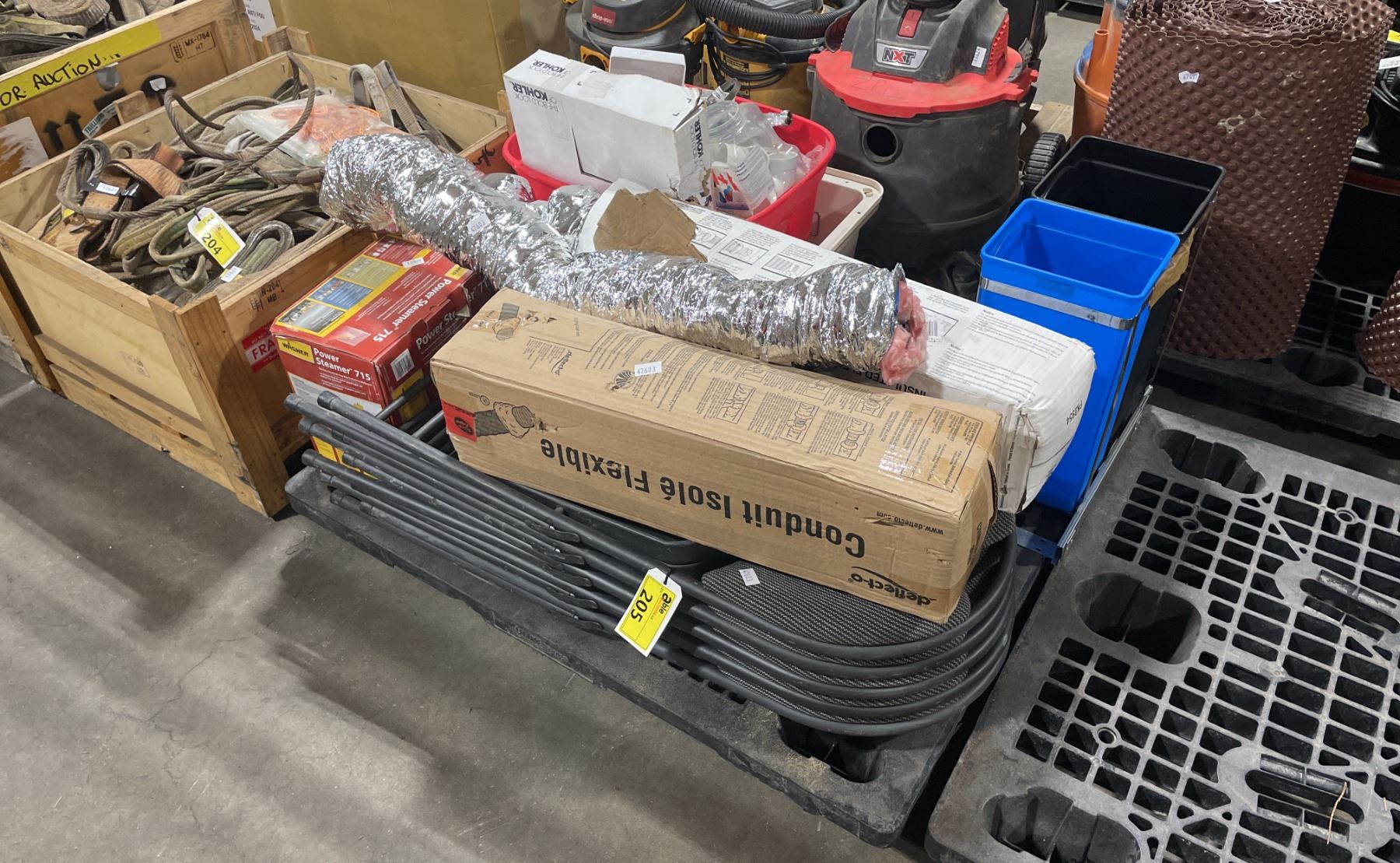 PALLET OF ASSORTED PLUMBING HARDWARE, WAGNER POWER STEAMER 715, DUCTING, WASTE RECEPTACLE, &