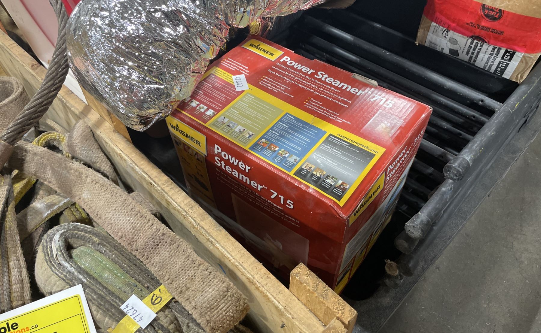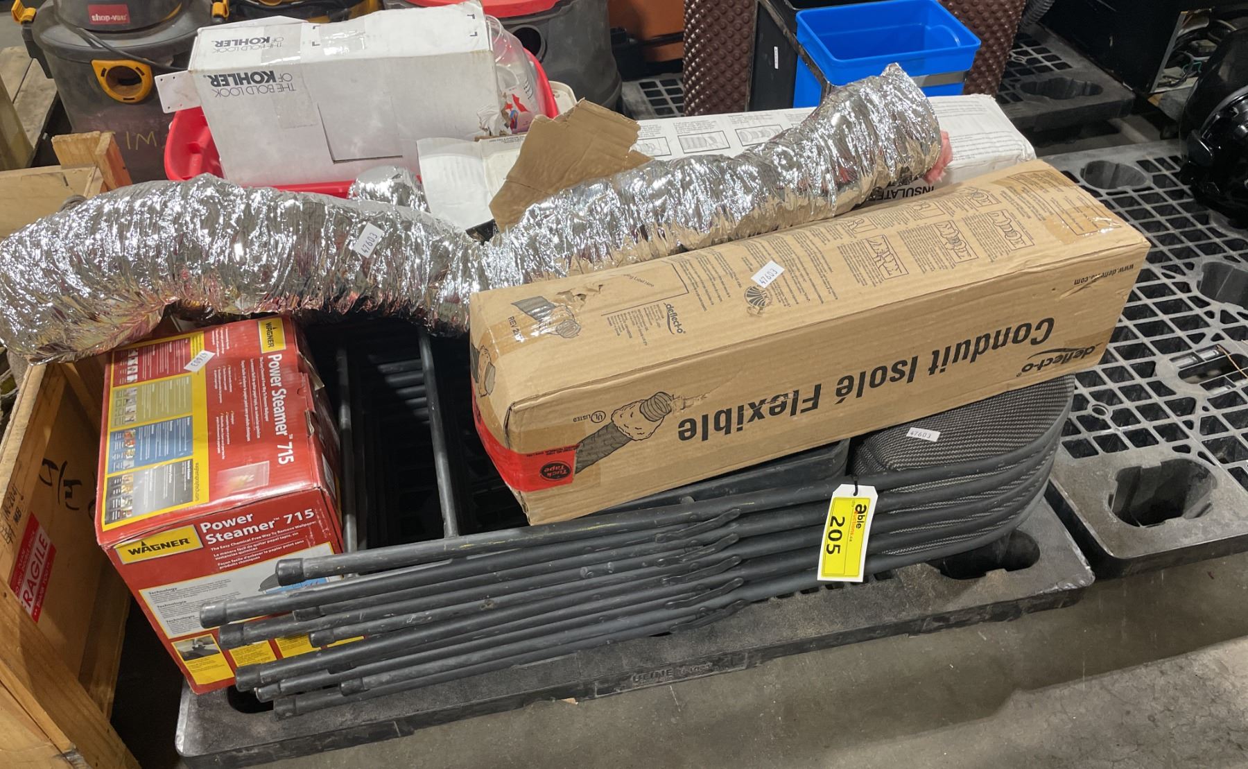 PALLET OF ASSORTED PLUMBING HARDWARE, WAGNER POWER STEAMER 715, DUCTING, WASTE RECEPTACLE, & FOLDING CHAIRS