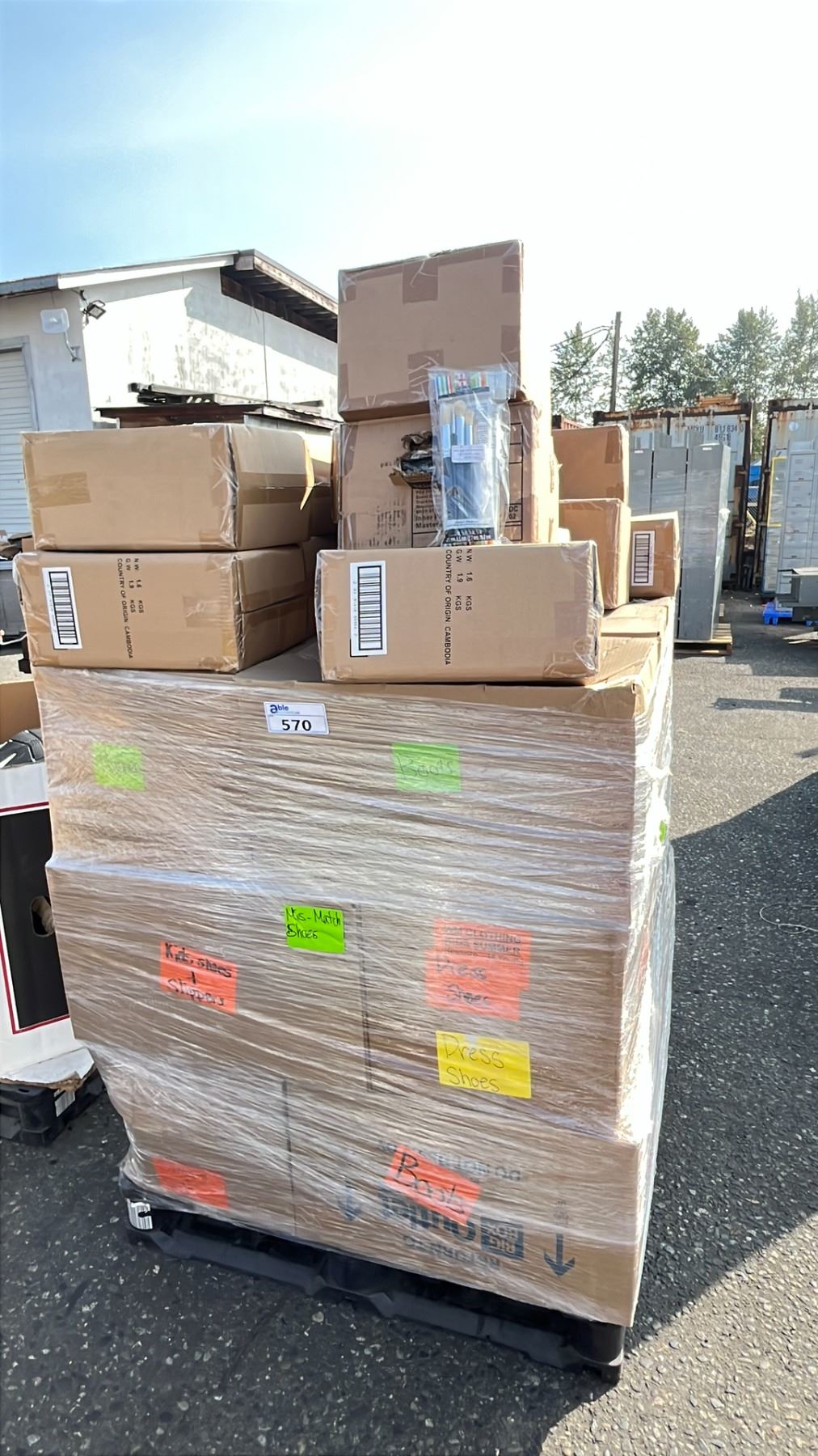 PALLET OF ASSORTED SHOES, 1/4" PURPLE RIBBON & PAINT BRUSHES