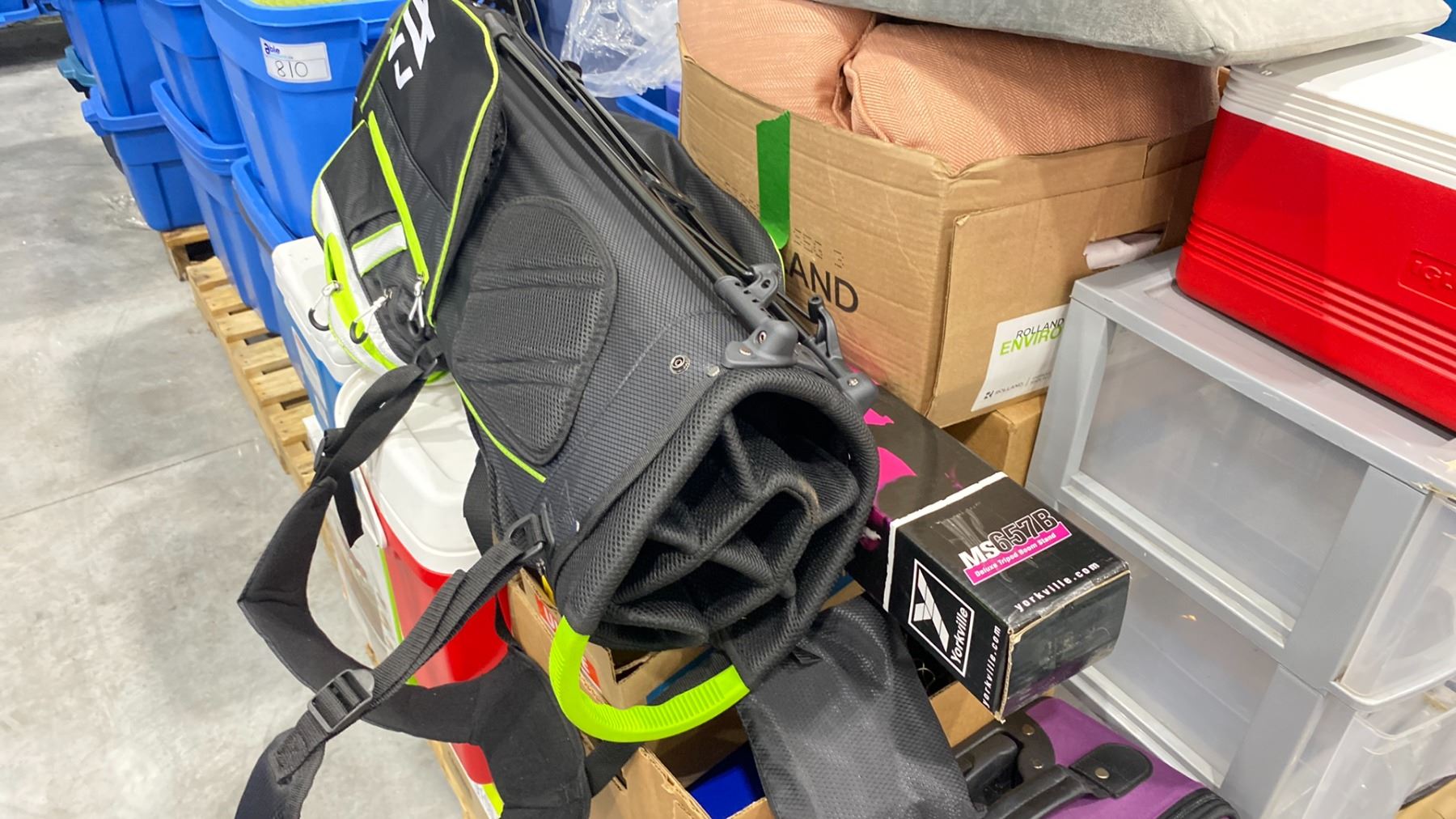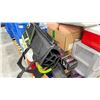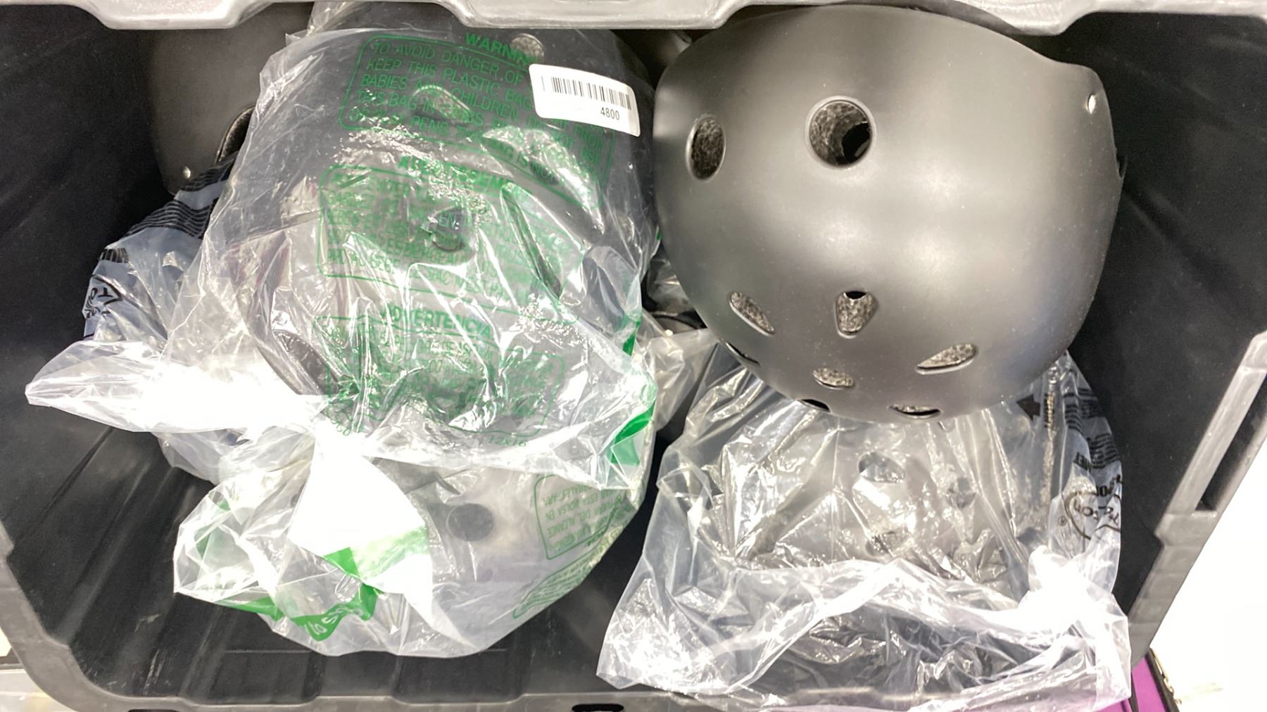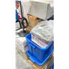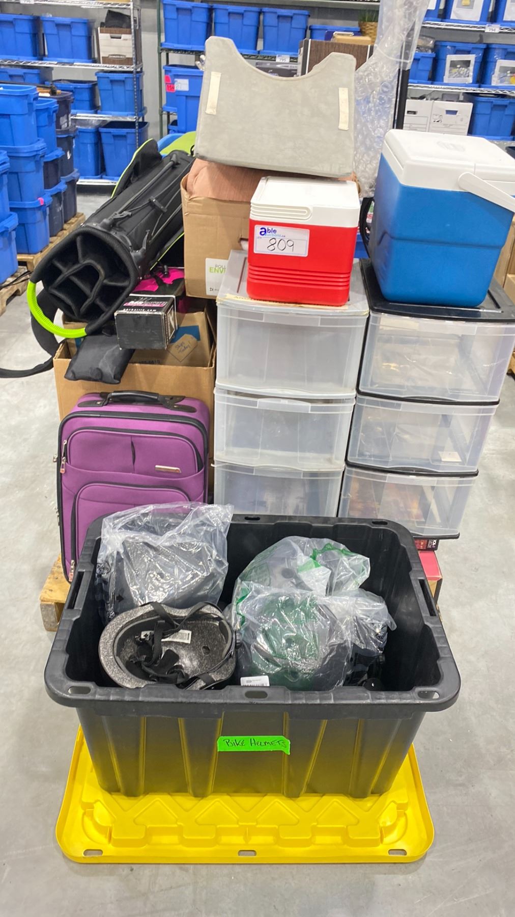 PALLET OF ASSORTED SHOW PROPS & BIN OF ASSORTED BIKE HELMETS