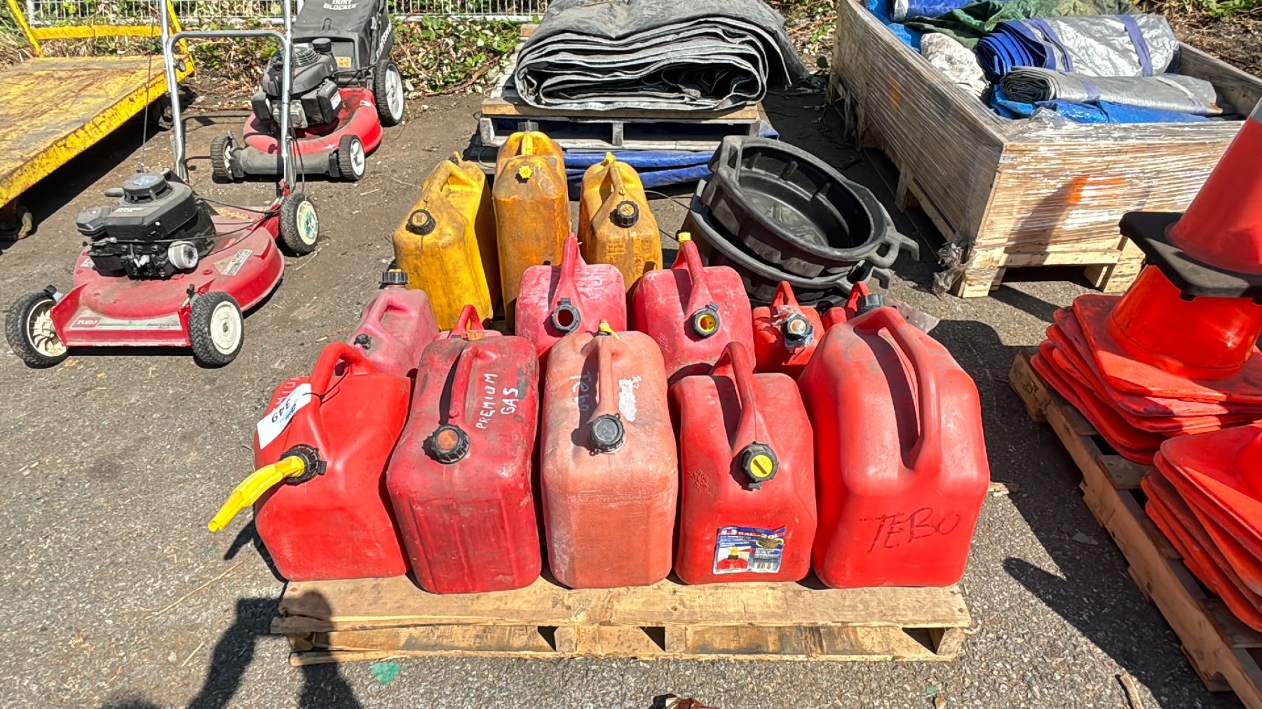 PALLET OF ASSORTED SIZE JERRY CANS & 3 OIL PANS