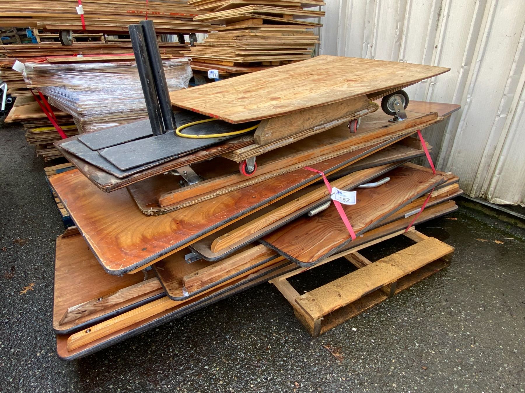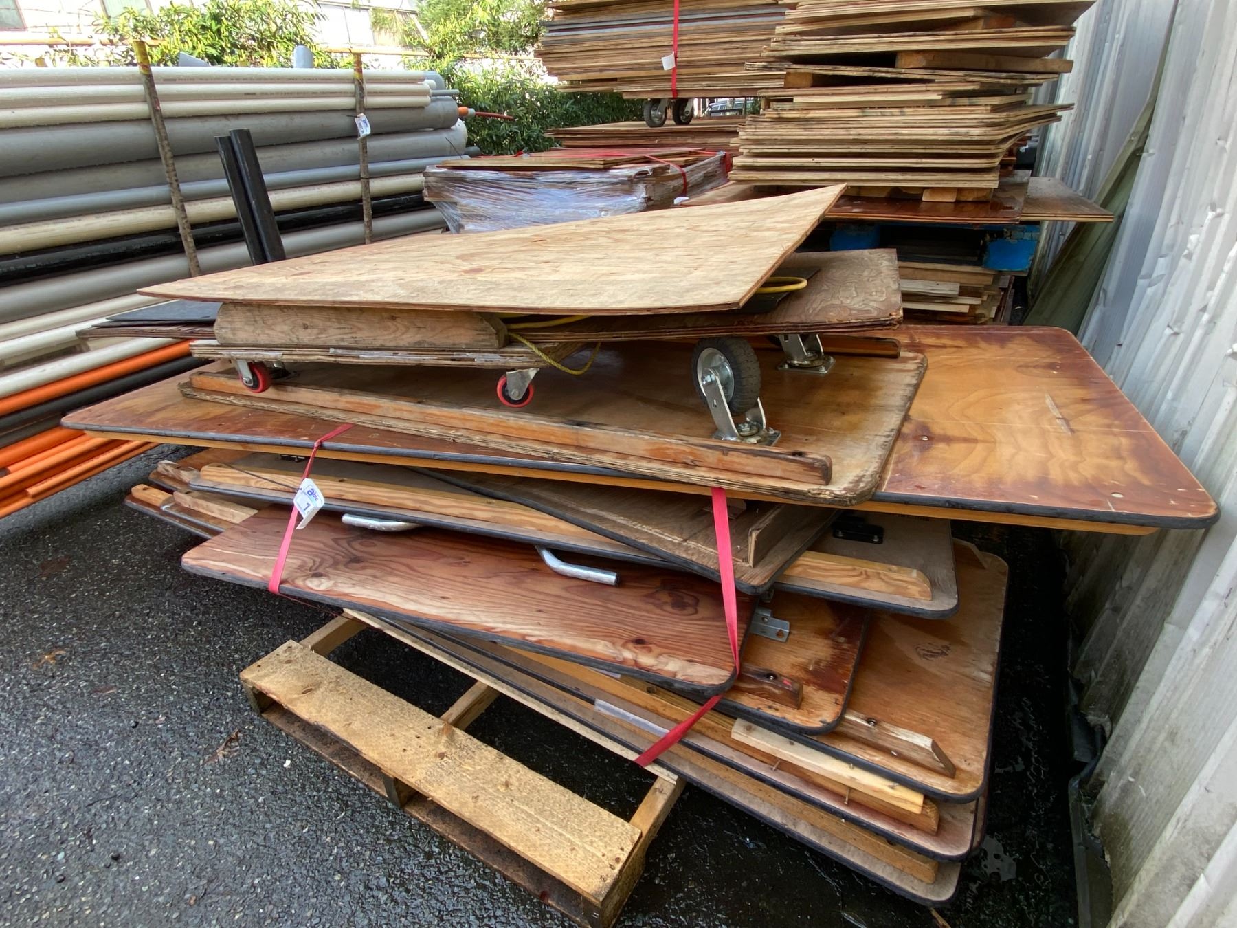 PALLET OF ASSORTED SIZE WOODEN FOLDING TABLES & 2 WOODEN 4 WHEEL DOLLIES