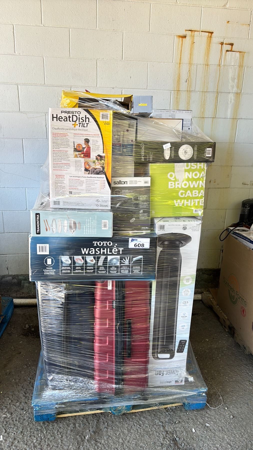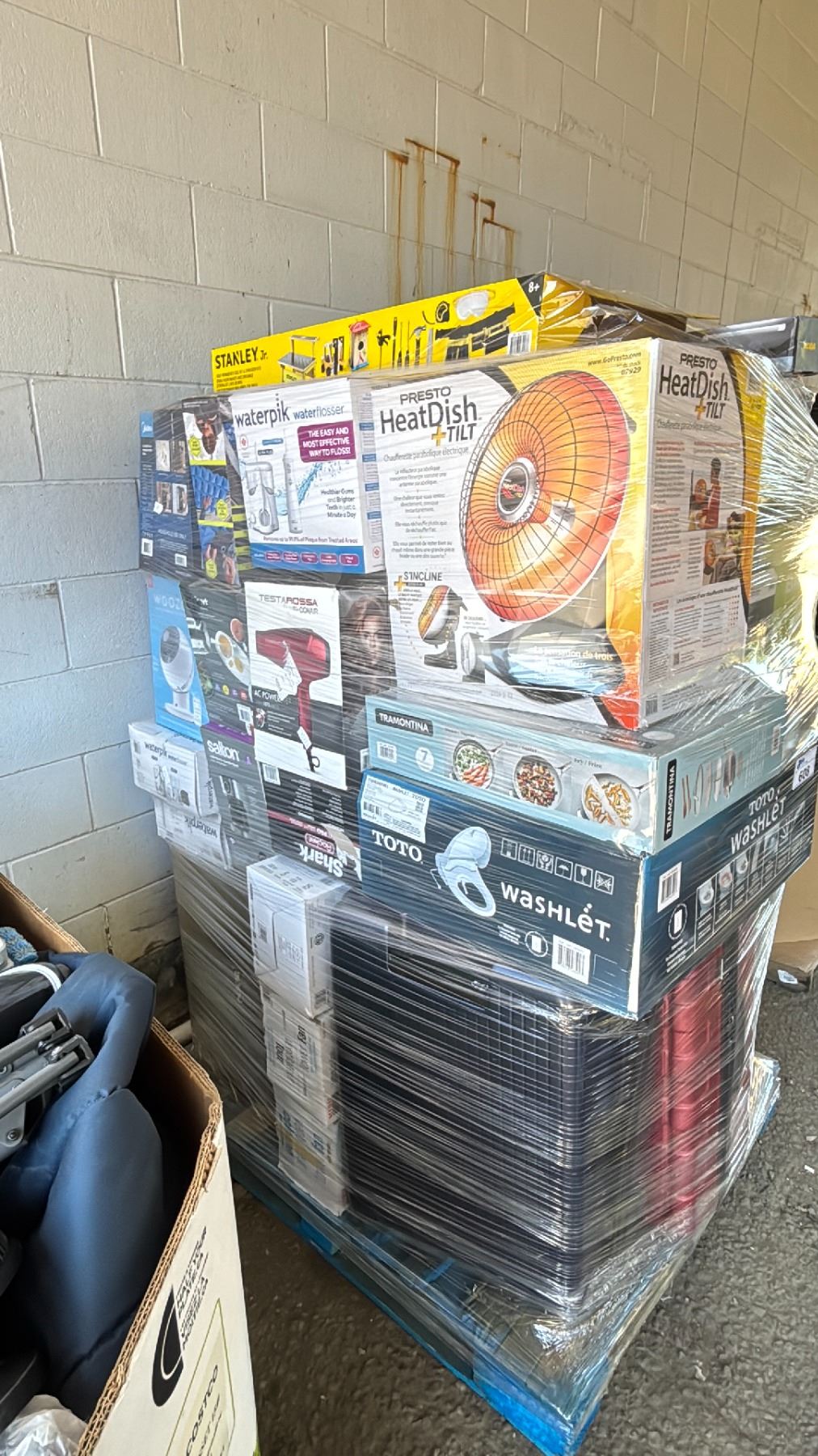 PALLET OF ASSORTED SMALL APPLIANCES INCLUDING KETTLE, VACUUM, TOWER FANS, WATER FLOSSERS, BLOWDRYER, COFFEE MAKER & MORE *MUST TAKE ALL ON PALLET*