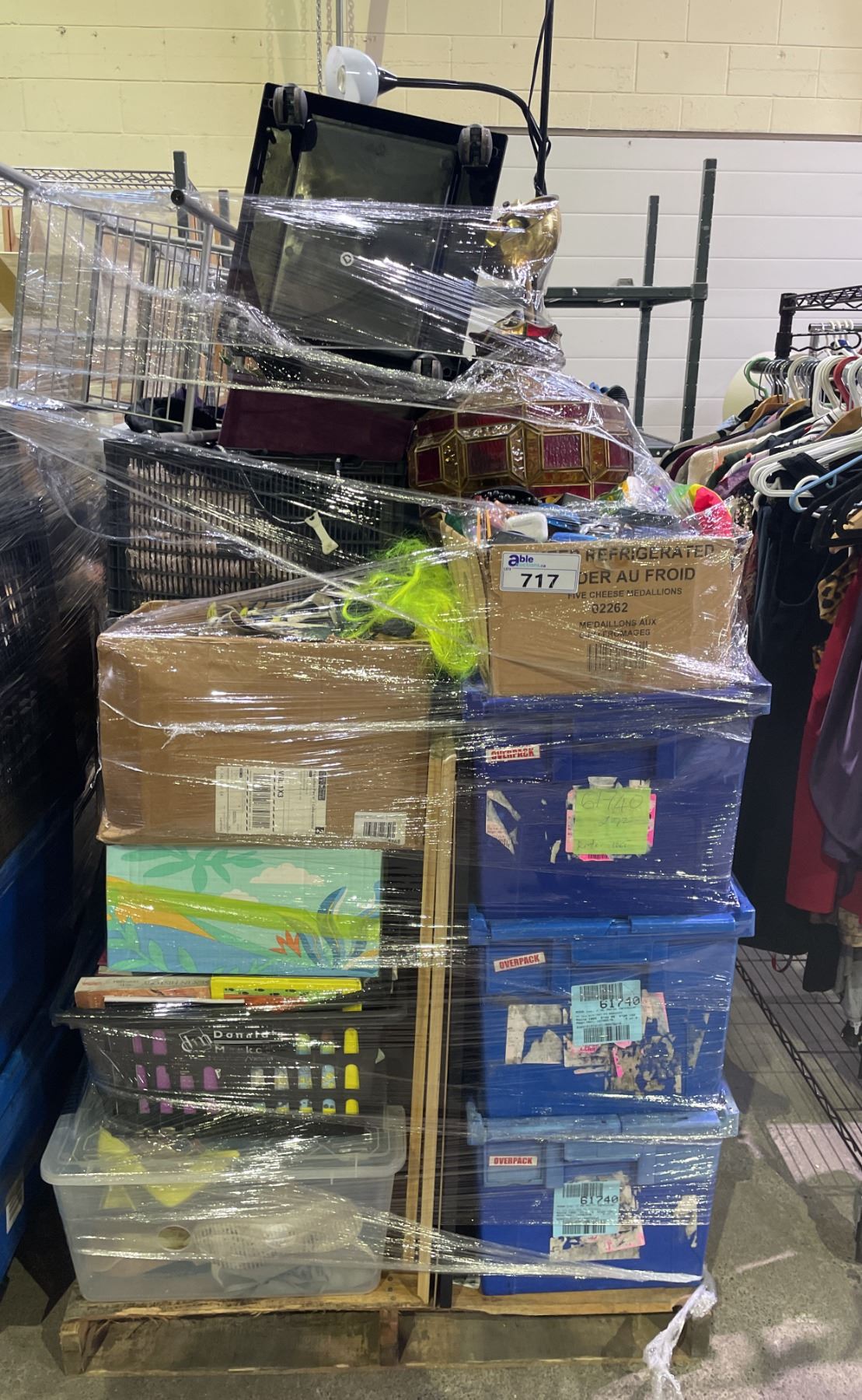 PALLET OF ASSORTED STORAGE LOCKER GOODS INCLUDING; FLOOR LAMPS, CEILING LAMP, HALLOWEEN MASK & MORE