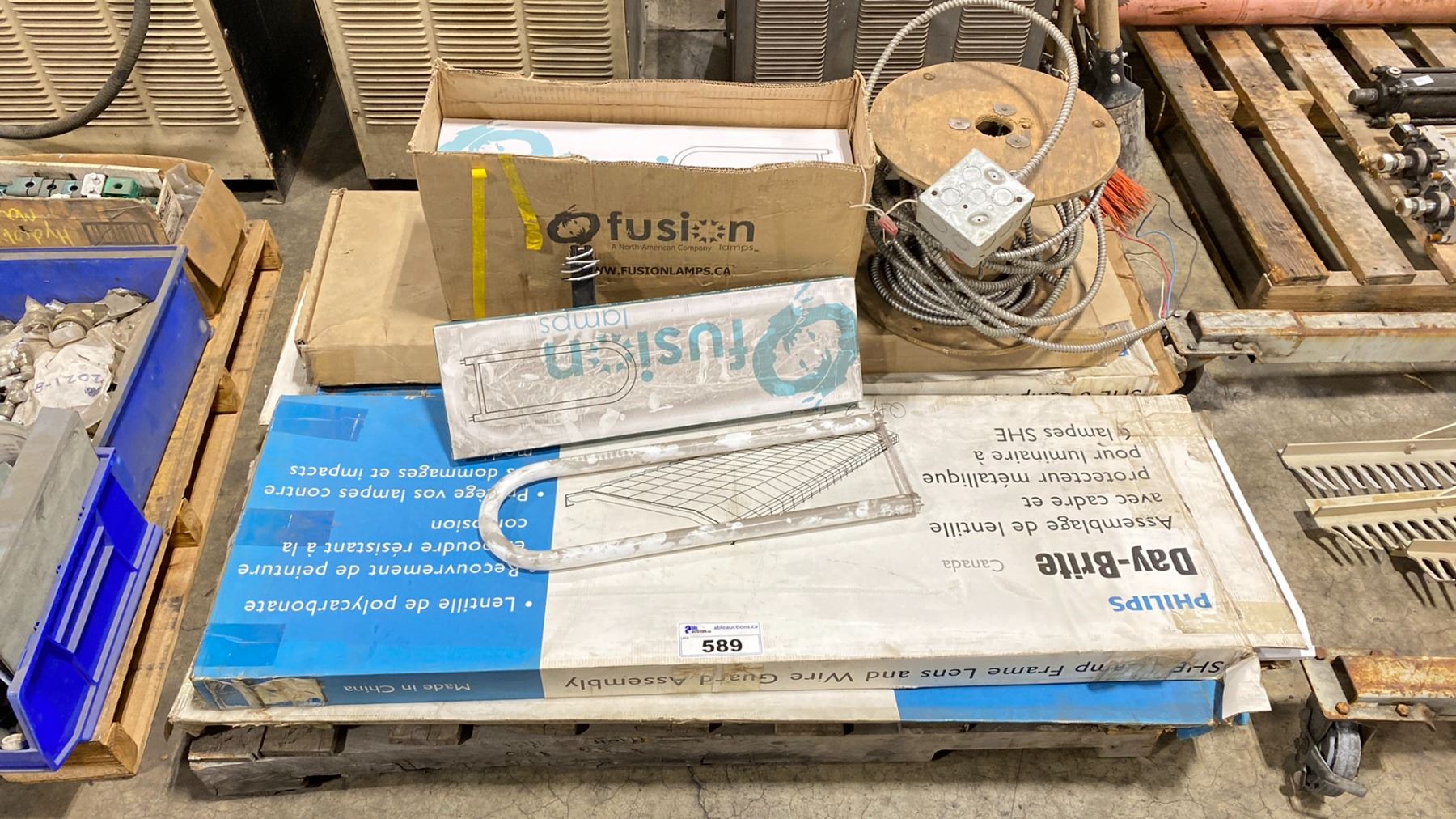 PALLET OF ASSORTED TUBE LIGHTING, WIRE GUARD & INDUSTRIAL ELECTRICAL CABLE