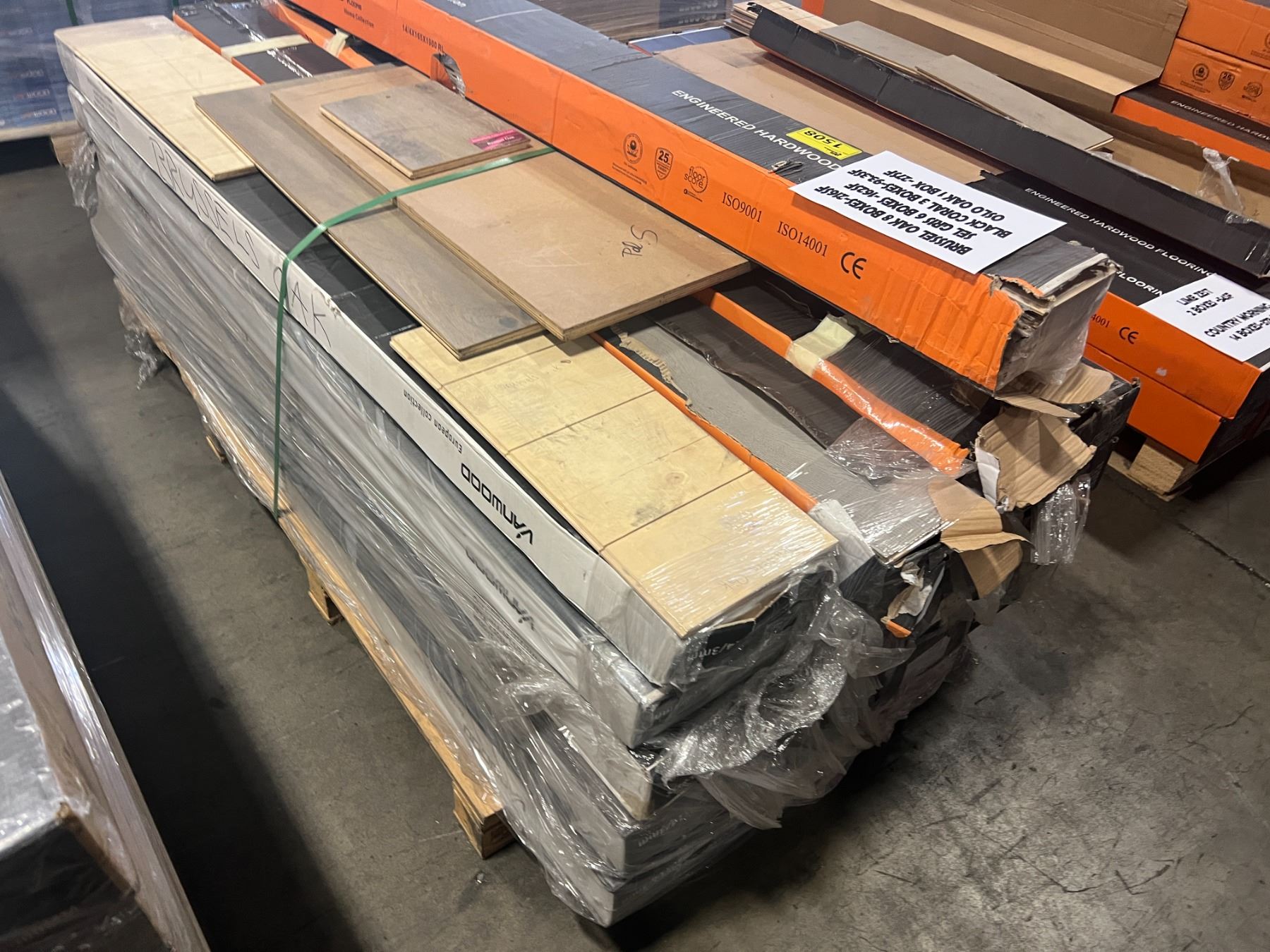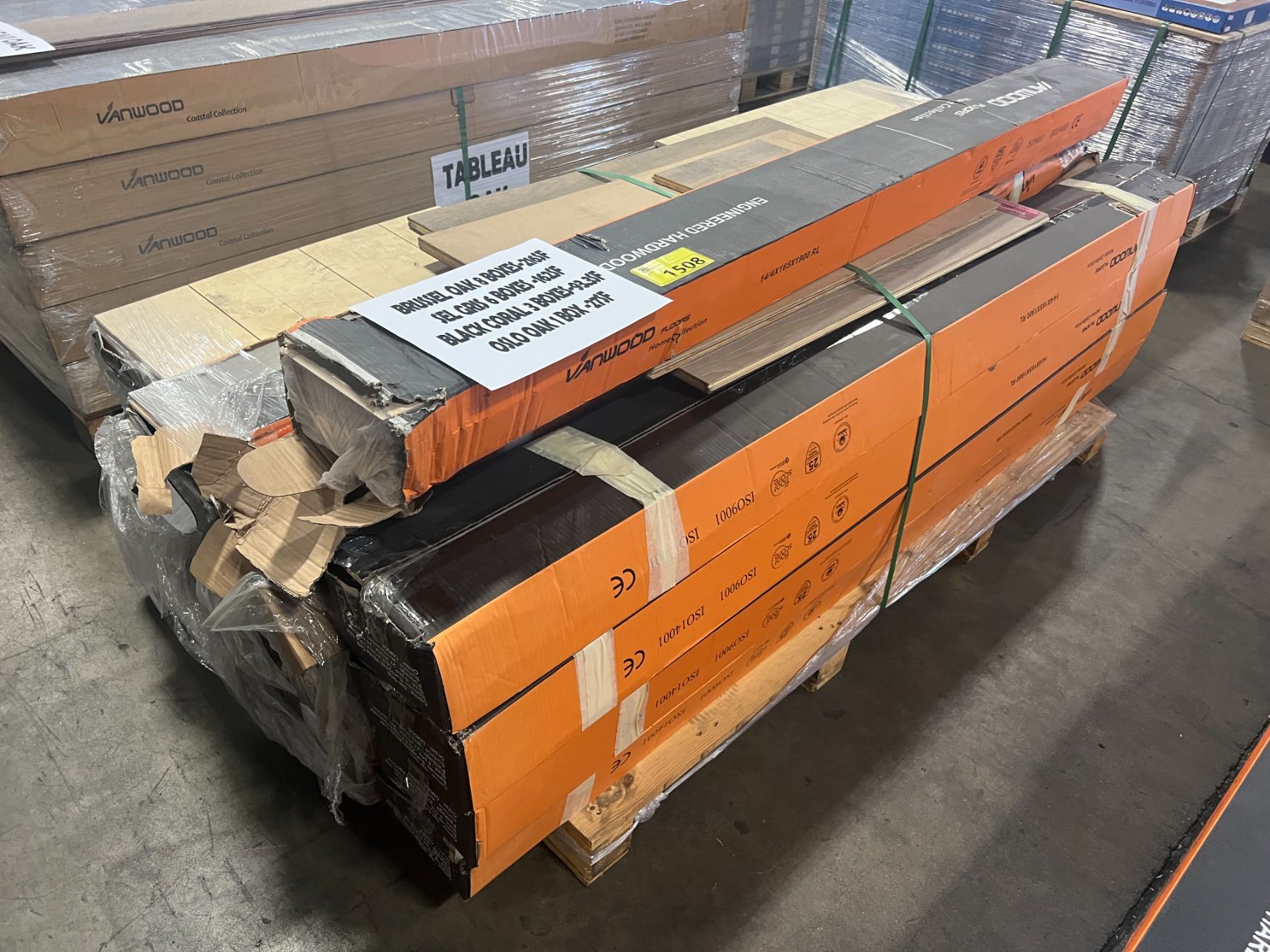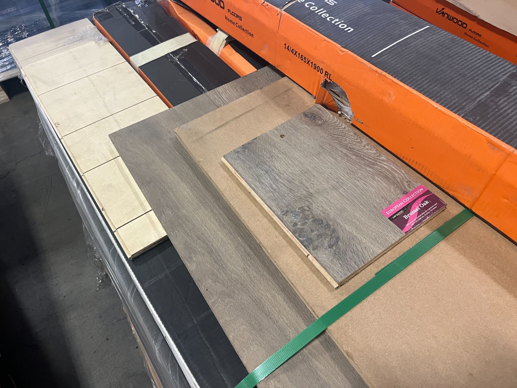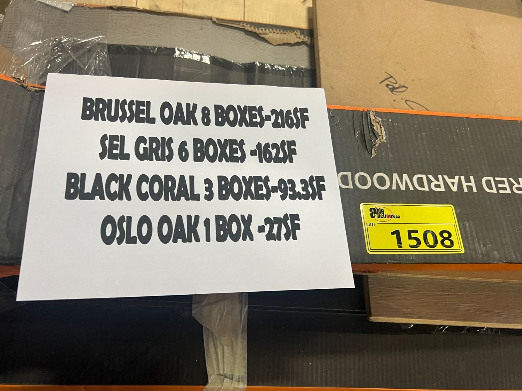 PALLET OF ASSORTED VANWOOD FLOORING; BRUSSEL OAK 8 BOXES TOTAL 216 SQ. FT., SEL GRIS 6 BOXES TOTAL 162SQ.FT., BLACK CORAL 3 BOXES TOTAL 93.3 SQ. FT., OSLO OAK 1 BOX TOTAL 27 SQ.FT.