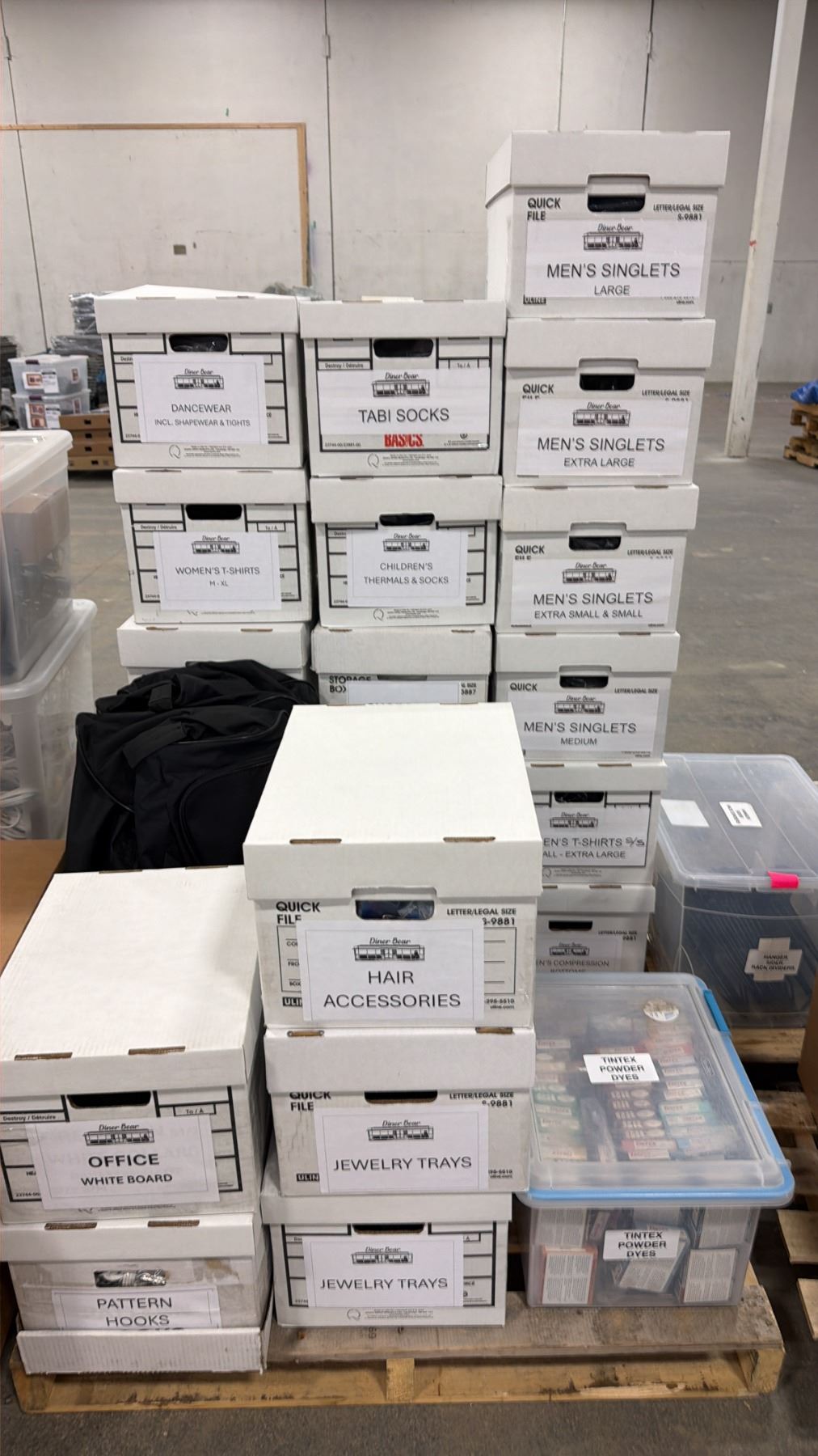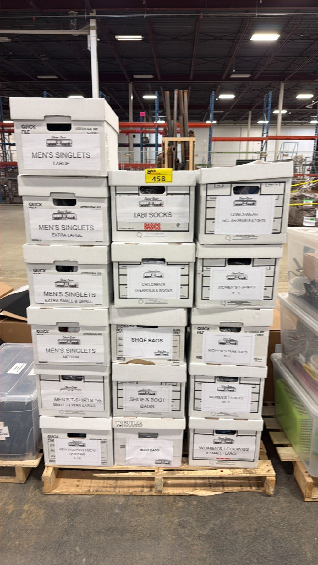 PALLET OF ASSORTED WARDROBE INCLUDING; MEN'S SINGLETS, TABI SOCKS, SHOE & BOOT BAGS & MORE