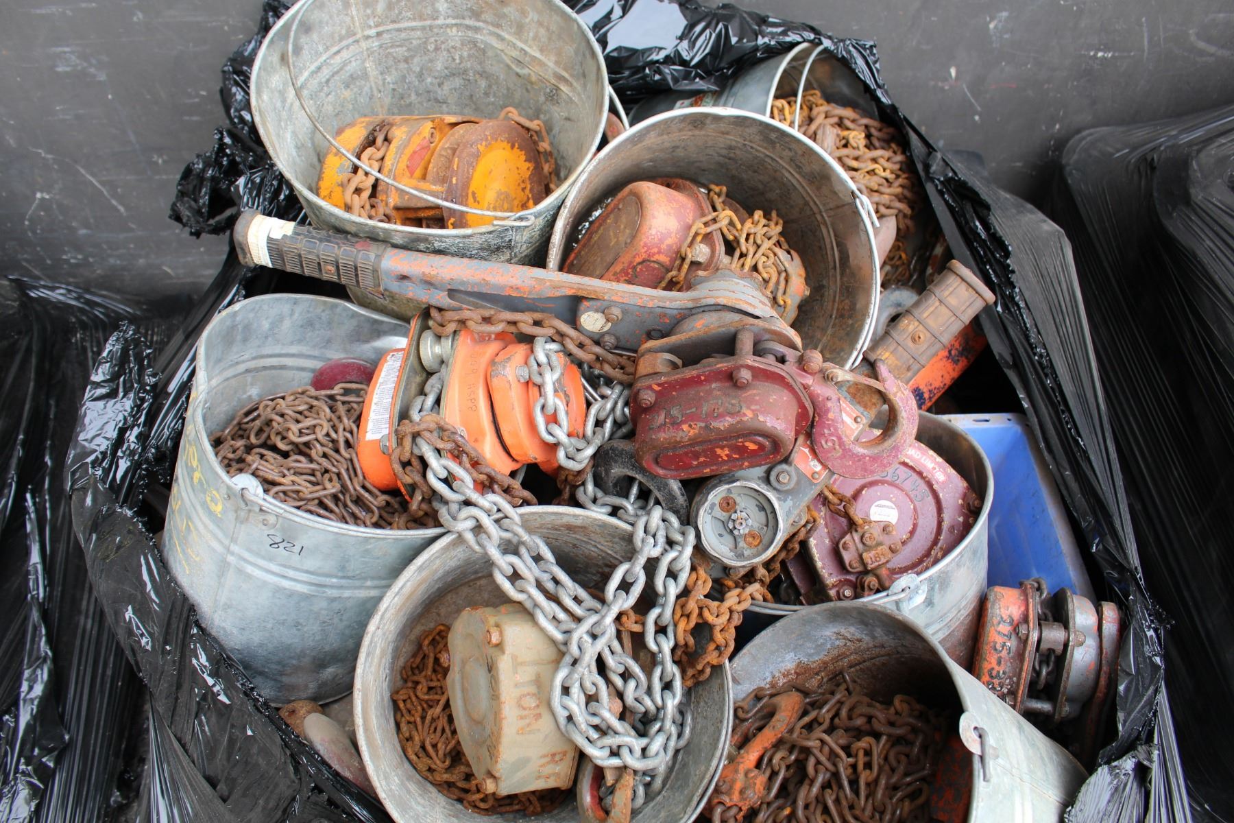 PALLET OF BLOCKS, CHAIN HOISTS AND MORE