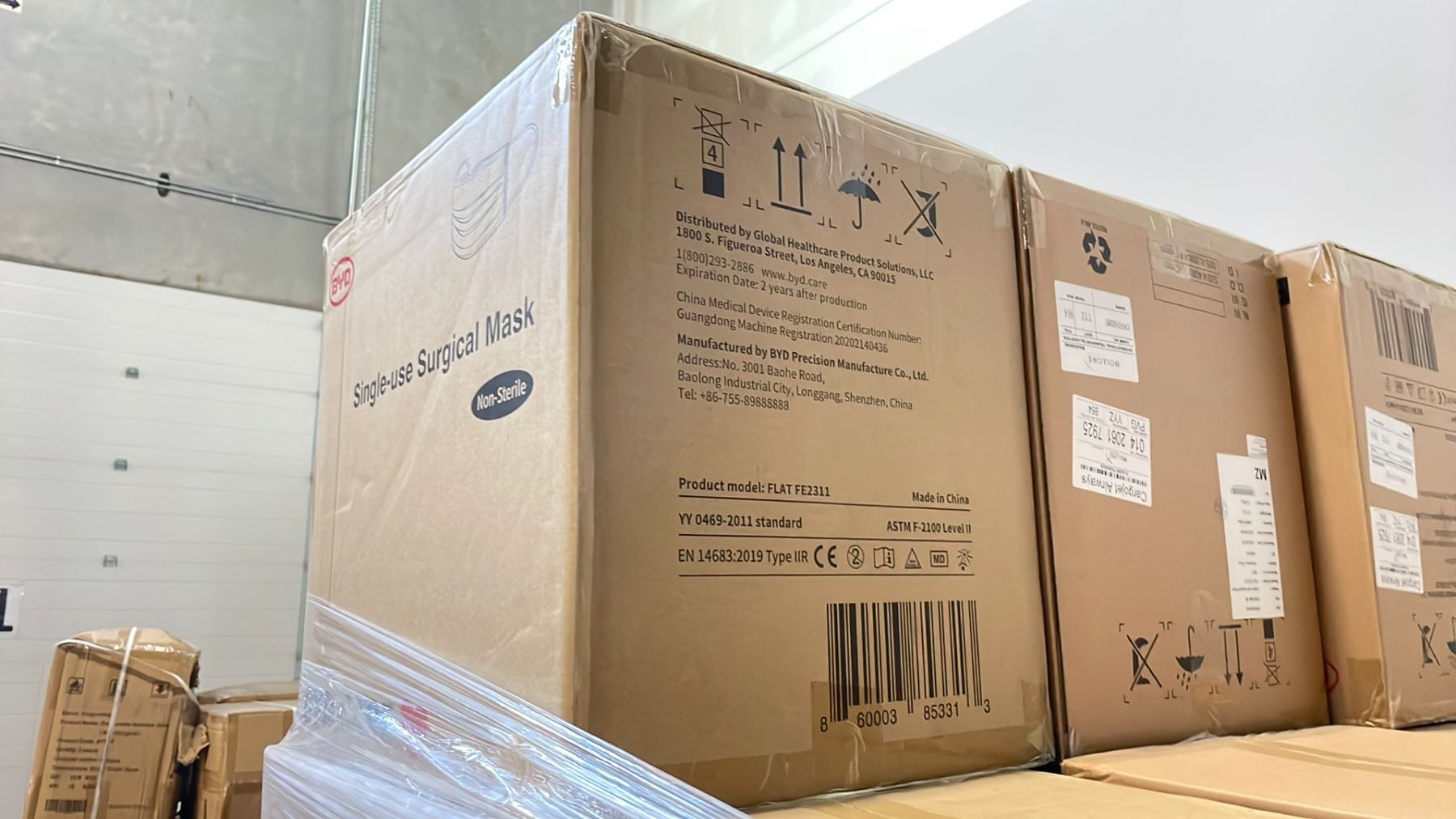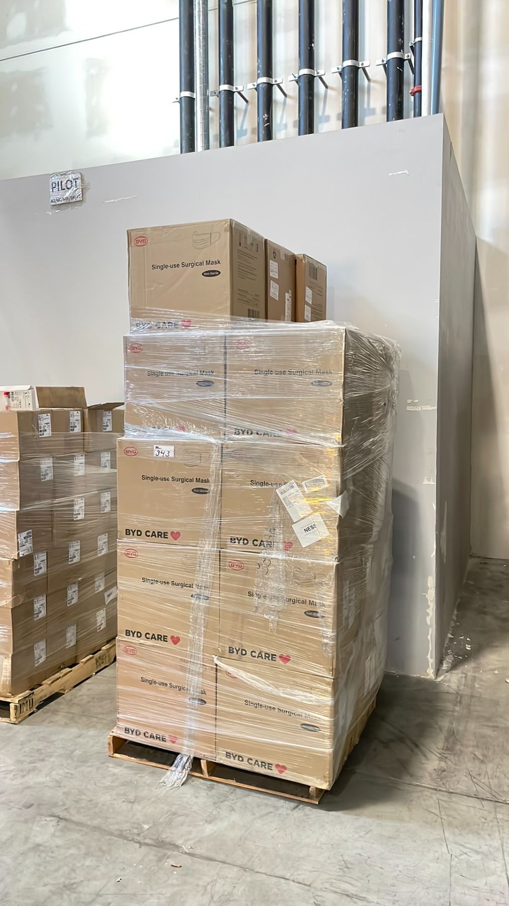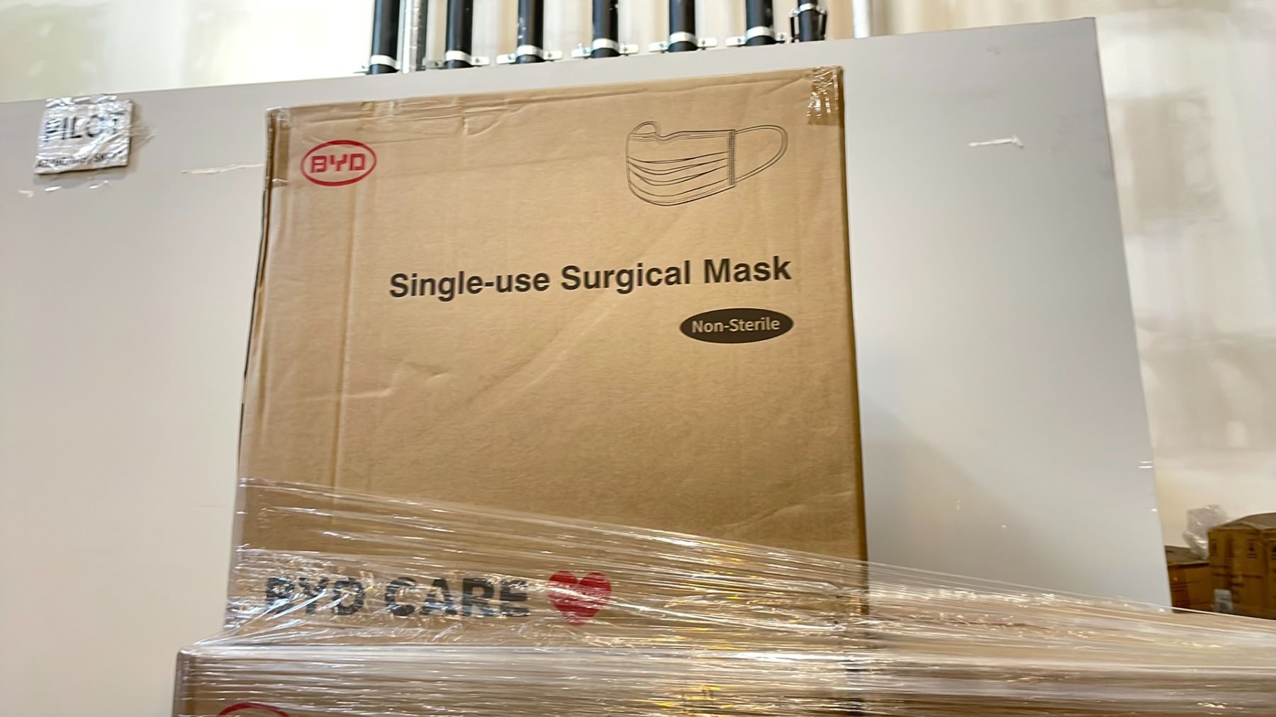 PALLET OF BOXES OF BYD CARE SINGLE USE SURGICAL MASKS ( NON-STERILE ) *MUST TAKE ALL ON PALLET*