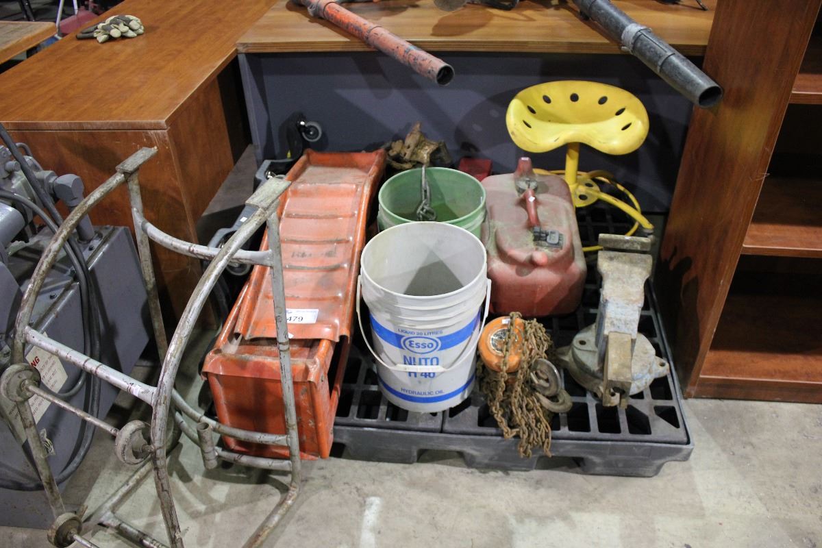 PALLET OF CHAIN, HOISTS, RAMPS, CREEPER & MISC TOOLS