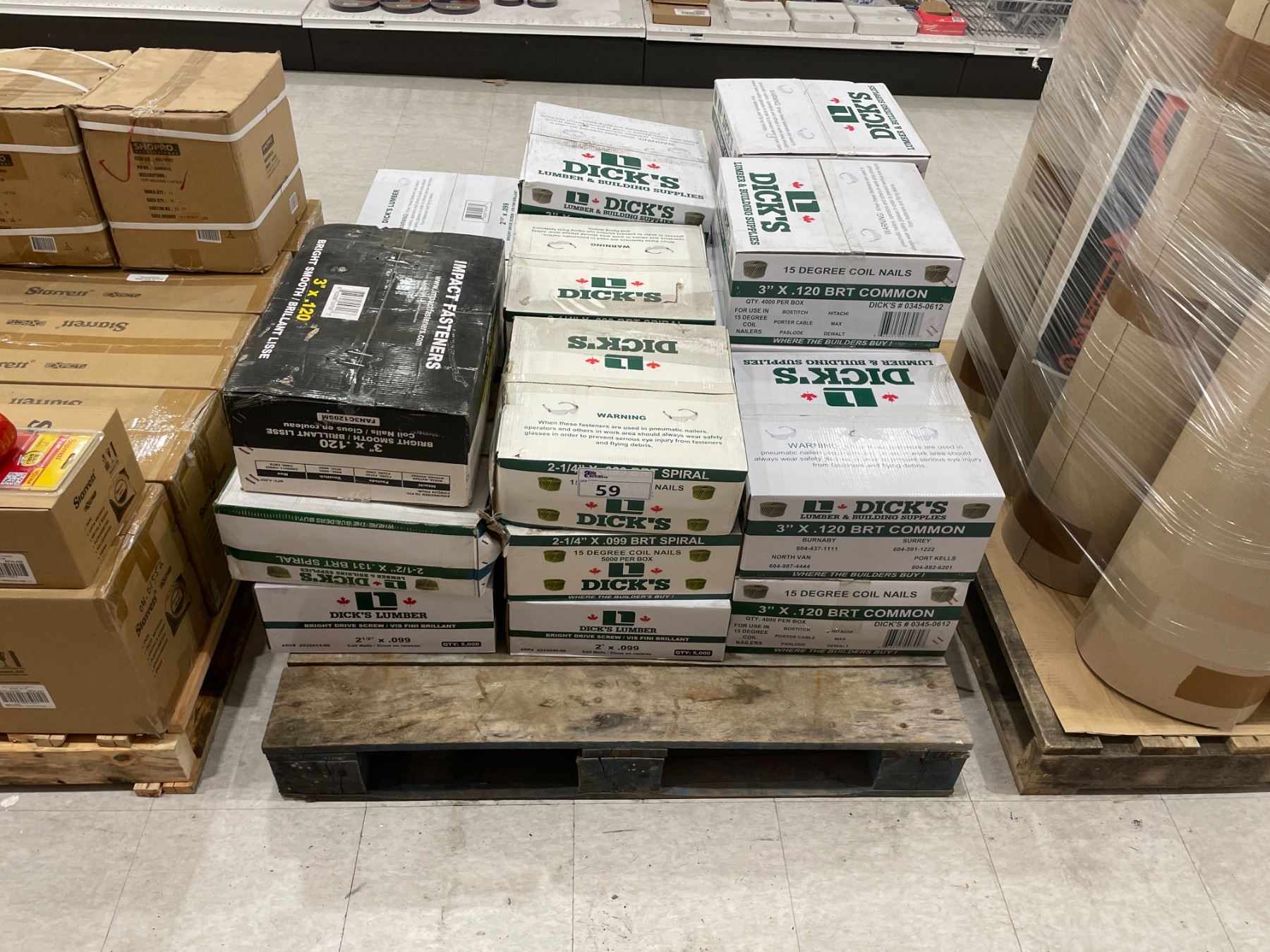 PALLET OF DICK'S LUMBER ASSORTED SIZED BOXES OF COIL NAILS