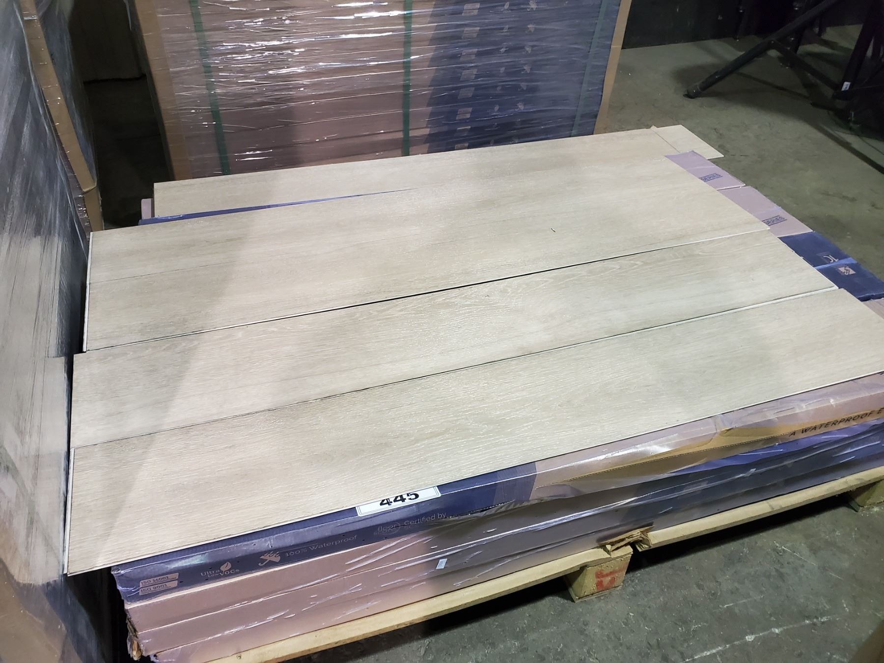 PALLET OF EC PREMIUM AQUAFIX 100% WATERPROOF LAMINATE FLOORING (B-GRADE) COZY WHITE, 55 BOXES 19.22 SQ.FT. PER BOX TOTAL SQUARE FOOTAGE 1,057 SQ FT 6.5 MM PLANK