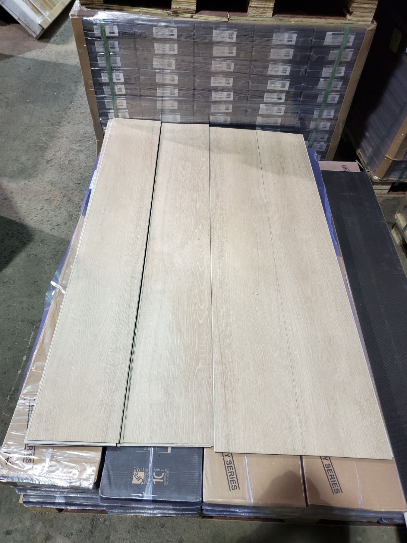 PALLET OF EC PREMIUM AQUAFIX 100% WATERPROOF LAMINATE FLOORING (B-GRADE) COZY WHITE, 55 BOXES 19.22 SQ.FT. PER BOX TOTAL SQUARE FOOTAGE 1,057.1 SQ FT 6.55 MM PLANK