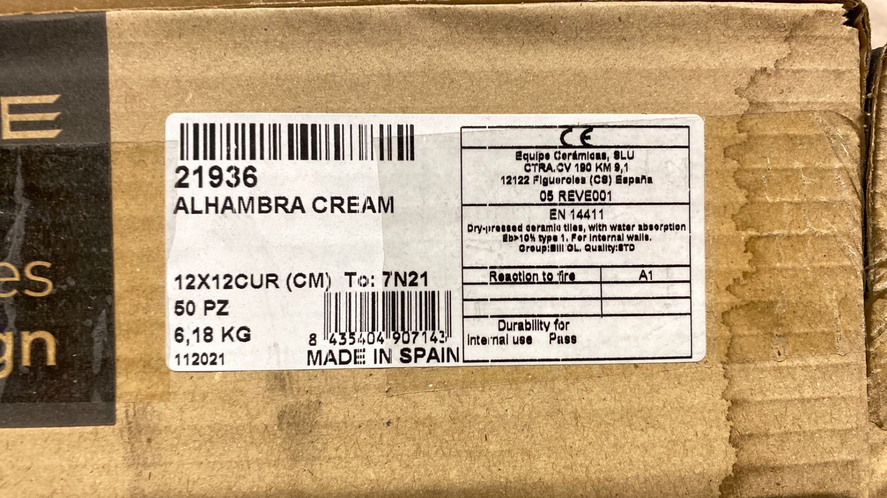 PALLET OF EQUIP 12X12CM TILES IN ALHAMBRA CREAM, 50 PIECES PER BOX, APPROX 28 BOXES